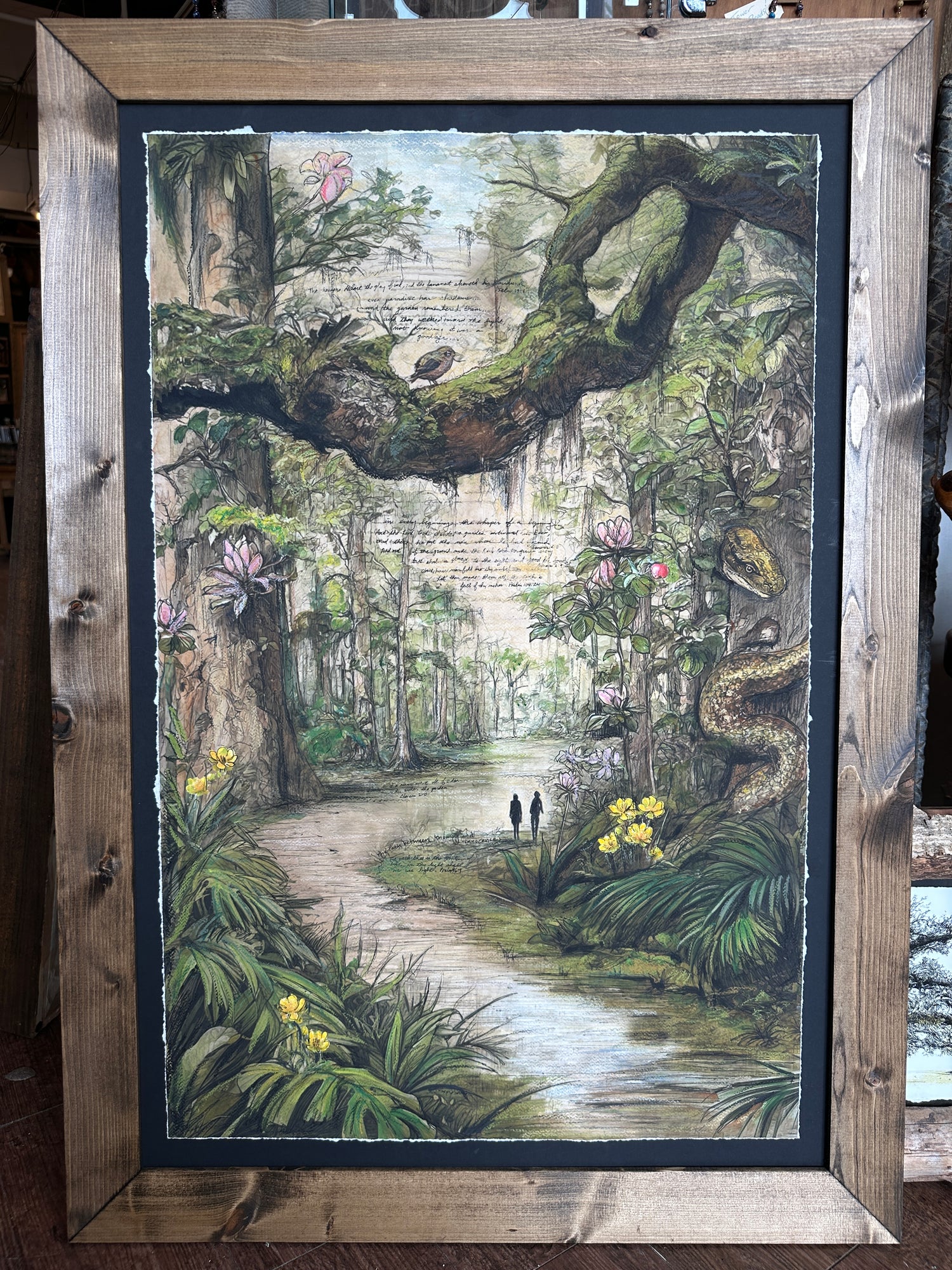 In Garden of Eden, the artist reimagines the ancient origin story through a lush, dreamlike landscape. This mixed media watercolor invites viewers into a primordial forest, alive with color, texture, and hidden symbolism.