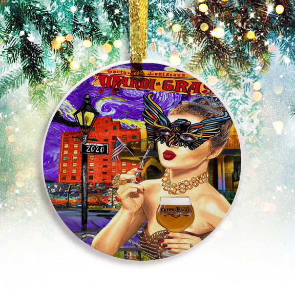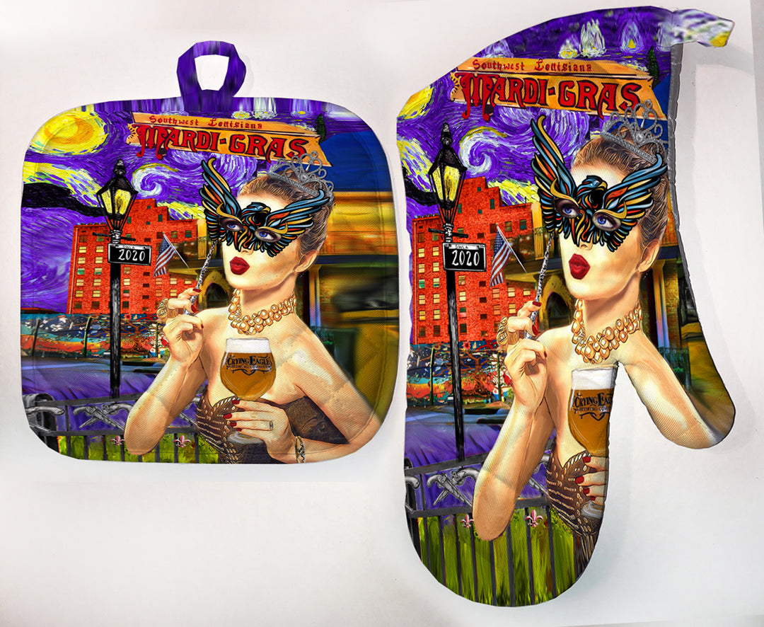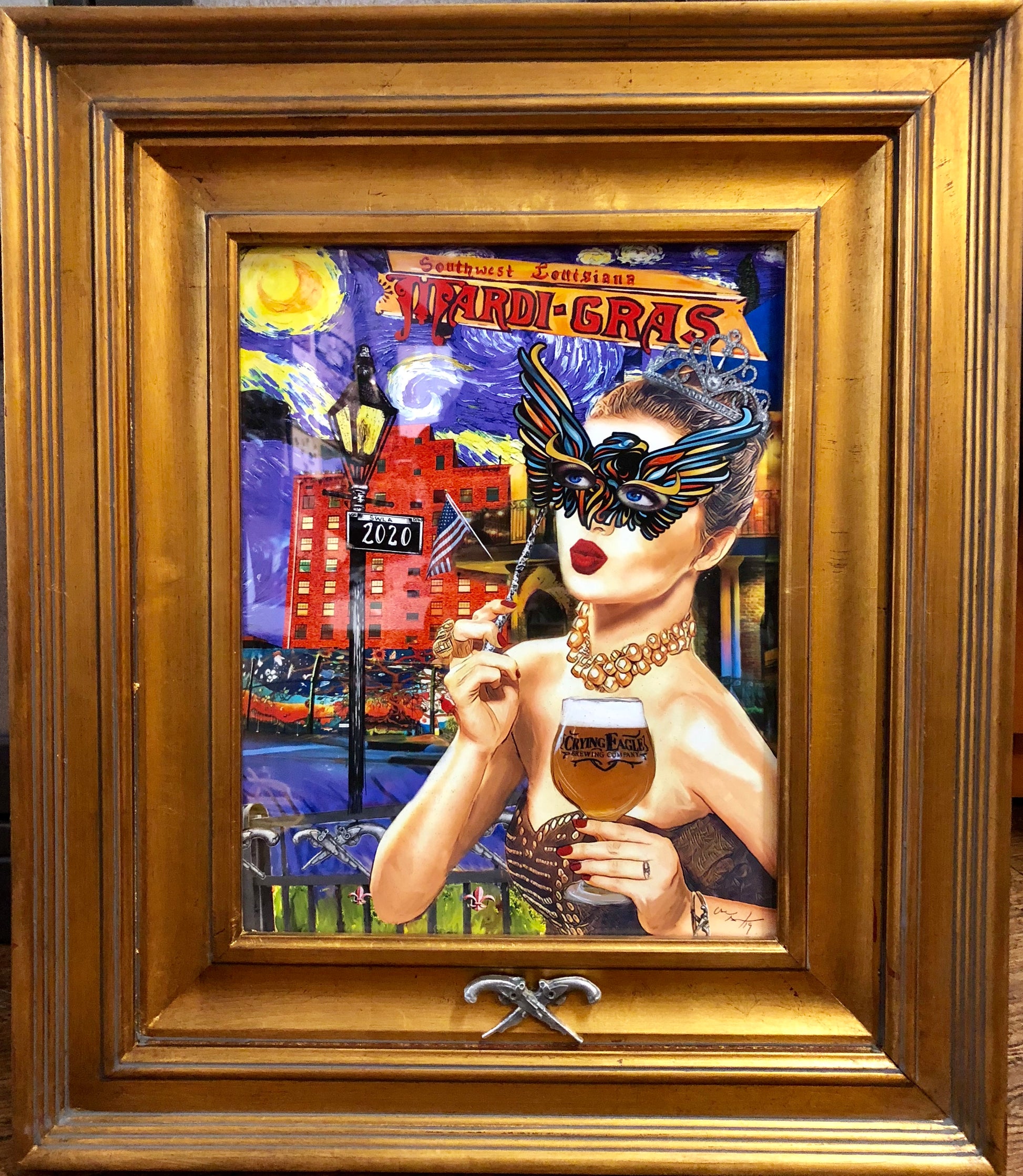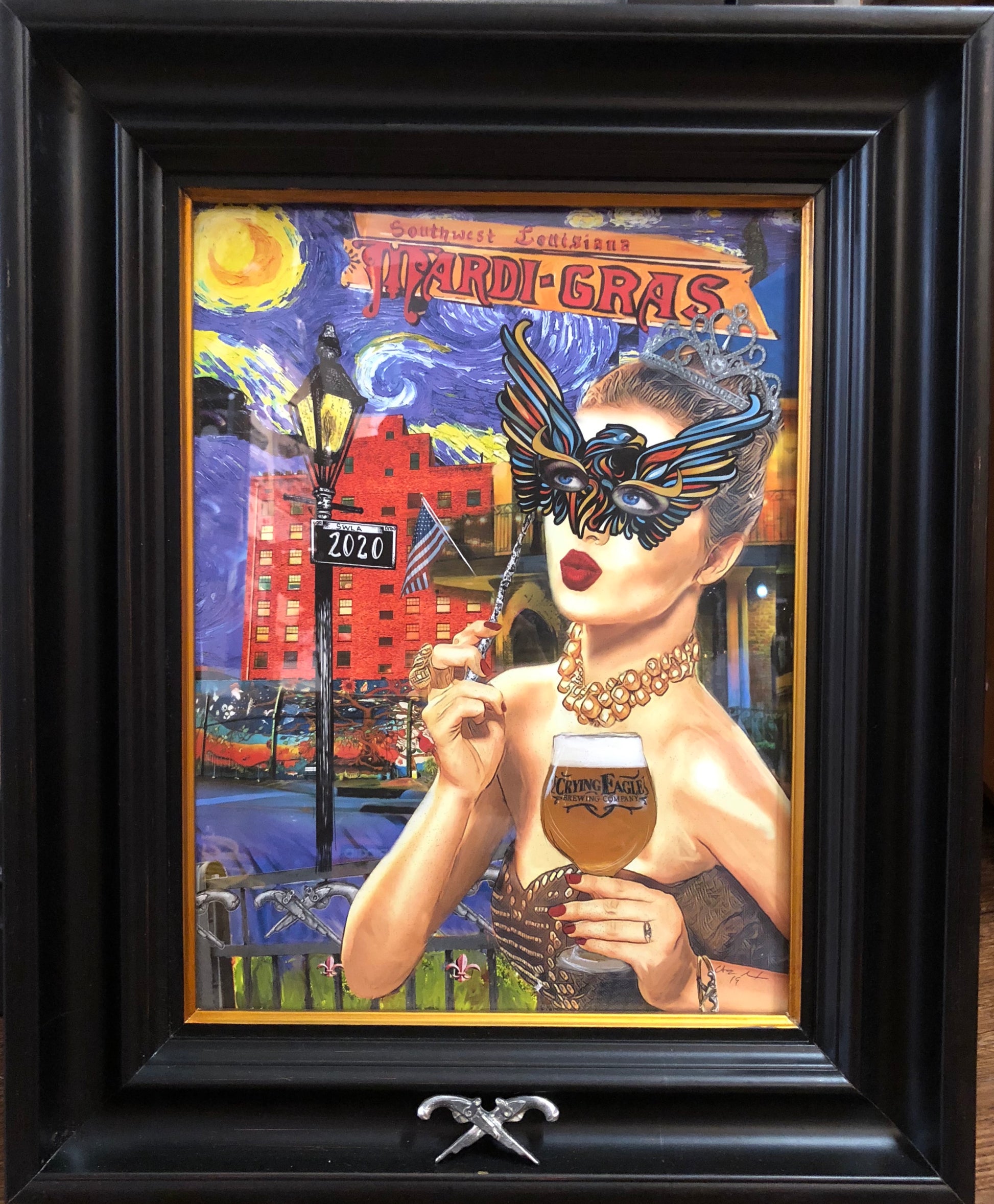 You will find that the woman is adorning a traditional Mardi Gras mask. The mask is the local Crying Eagle Brewery logo. The significance leads back to the most indigenous and primitive Indian tribe in the area, Atakapa or Ishak Indians. Crying Eagle was the name given to it’s chief.