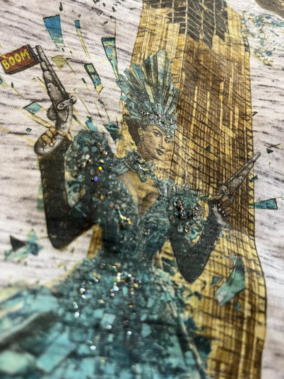 The artwork symbolizes resilience and rebirth, paying homage to the city's rich history and the enduring spirit of its landmarks. Get your T-Shirt (polyester / cotton blend) today!