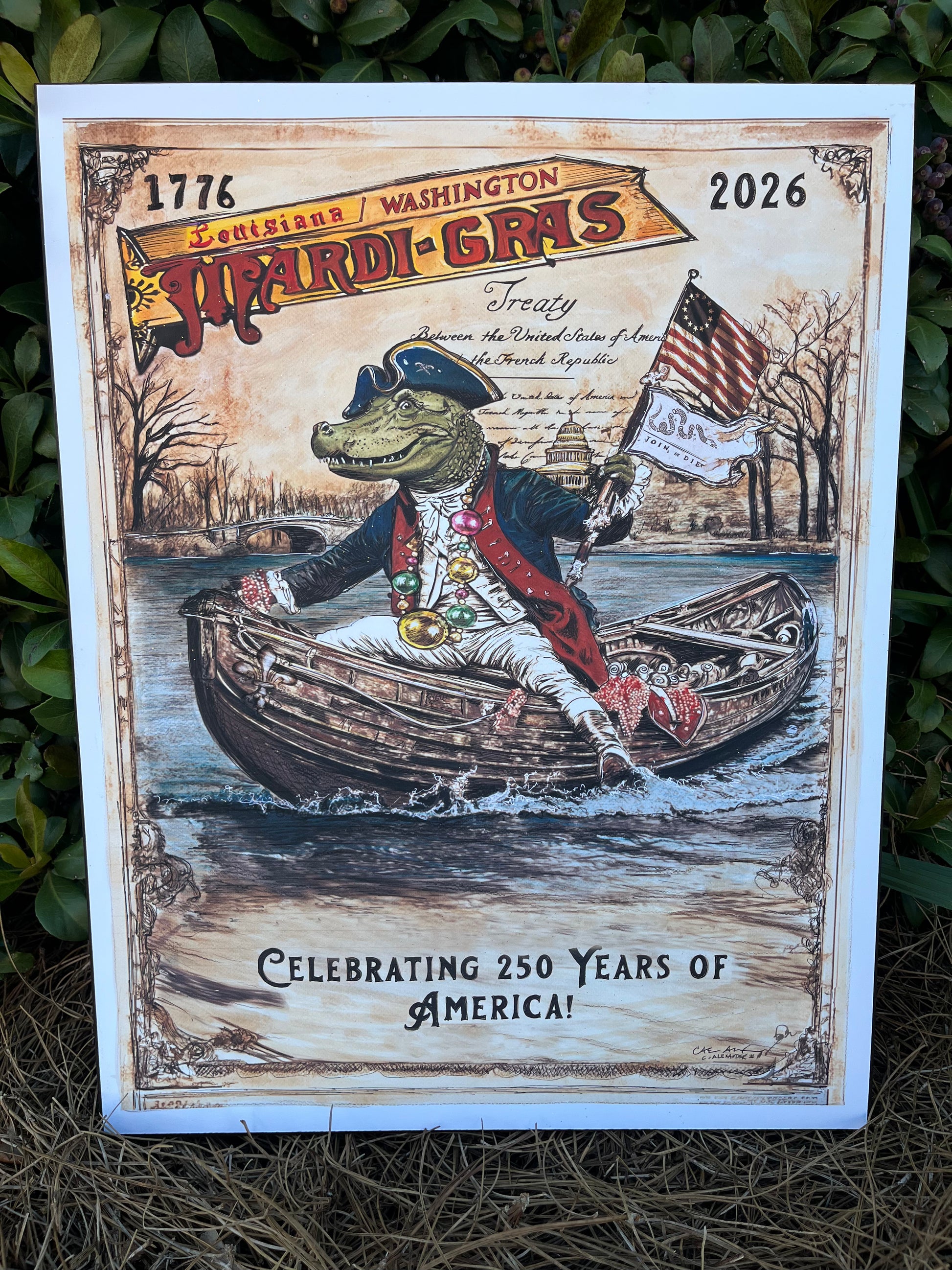 In Alexander's version, a proud Louisiana alligator leads the charge across the Potomac beneath the glowing U.S. Capitol. The alligator carries both the American and French flags — symbols of unity, resilience, and shared spirit — as the river reflects a journey of freedom, faith, and fortitude.