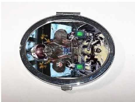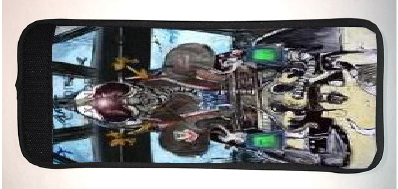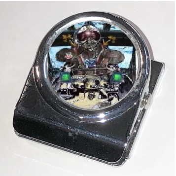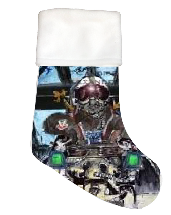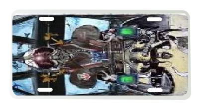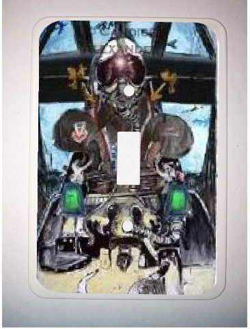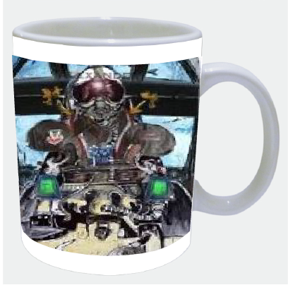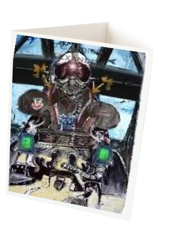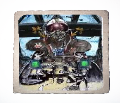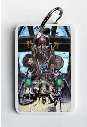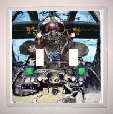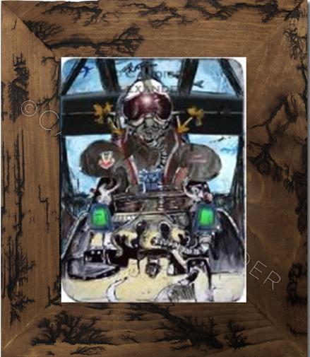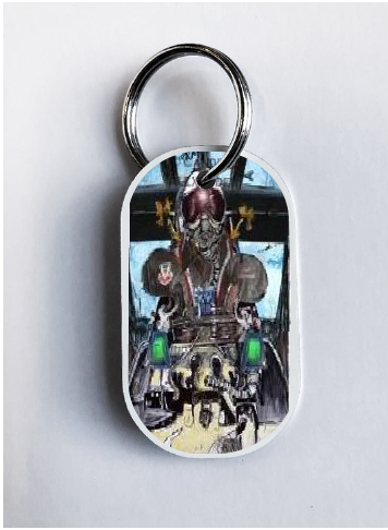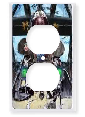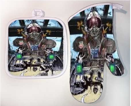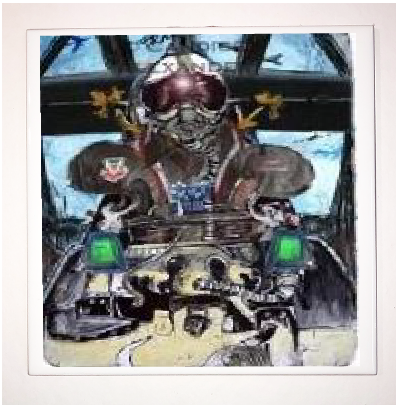 "Air Force Bomber" is a fleur de lis design by Candice Alexander depicting the inside of a cockpit as the background and a Fleur de Lis decked out as a bomber pilot complete with helmet, badges, and hoses, in the foreground.