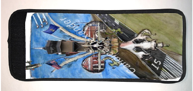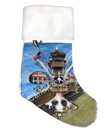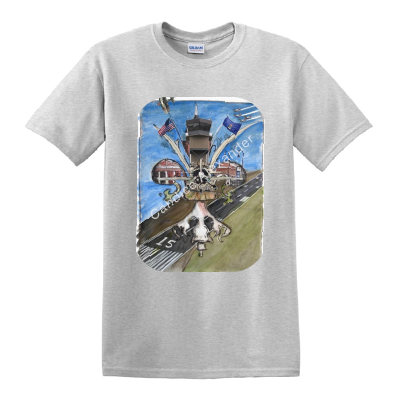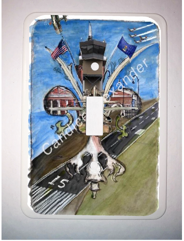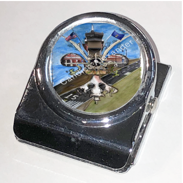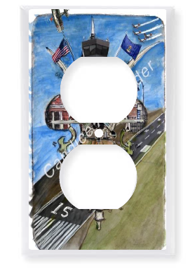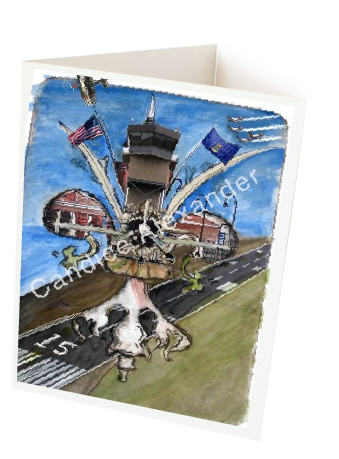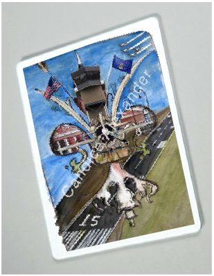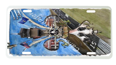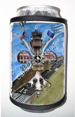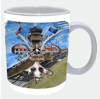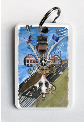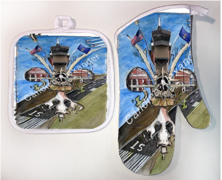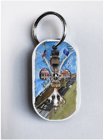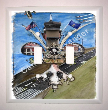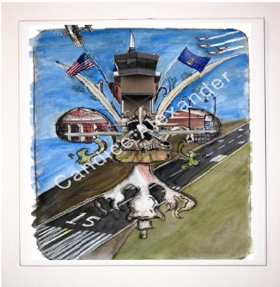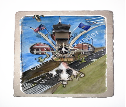 "Air Traffic Controller" is a fleur de lis design by Candice Alexander depicting a central propeller and plane centered on a Fleur de Lis made up of a control tower and brick building on a background of runway 15 with planes in the sky.