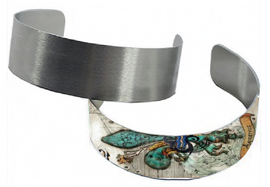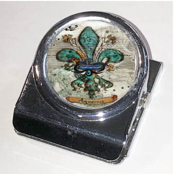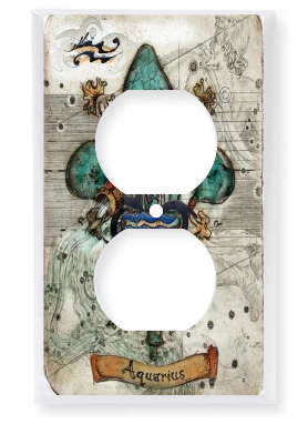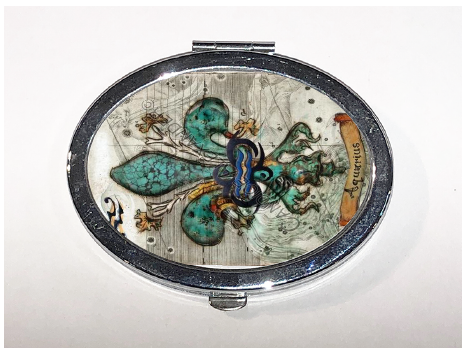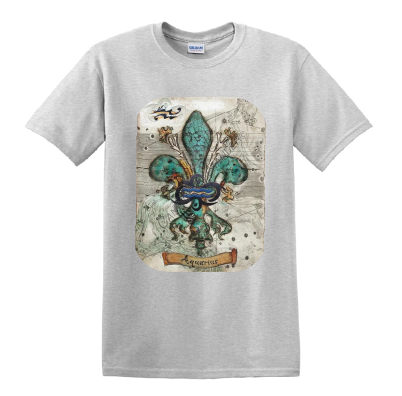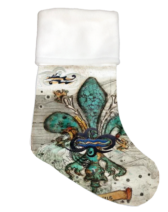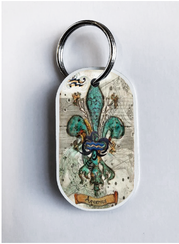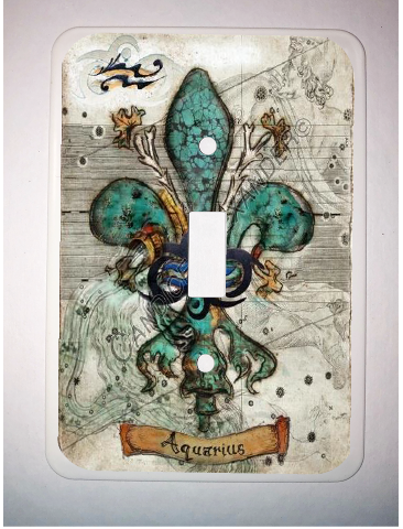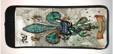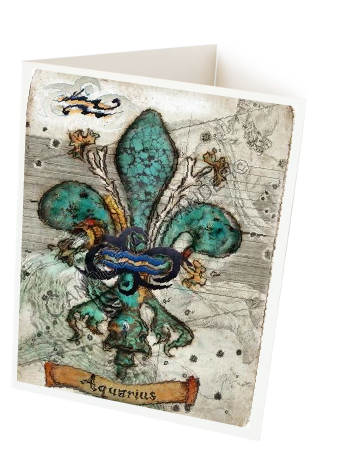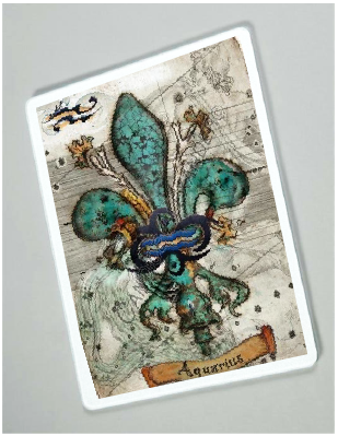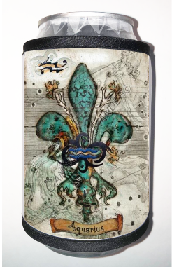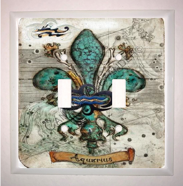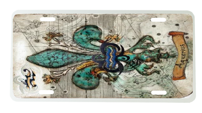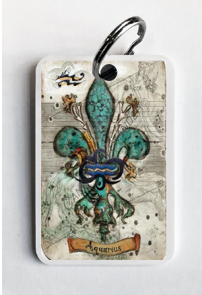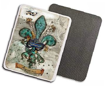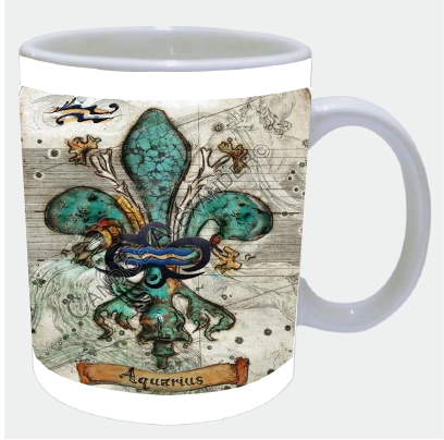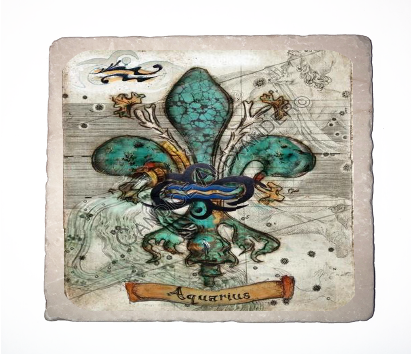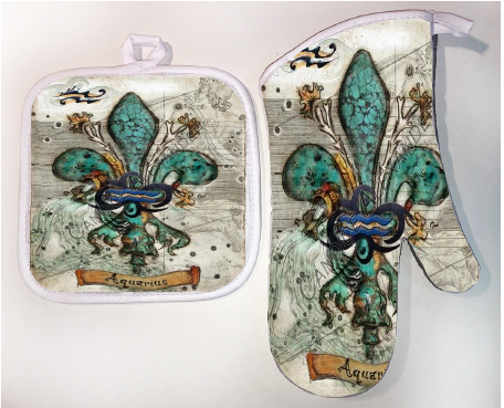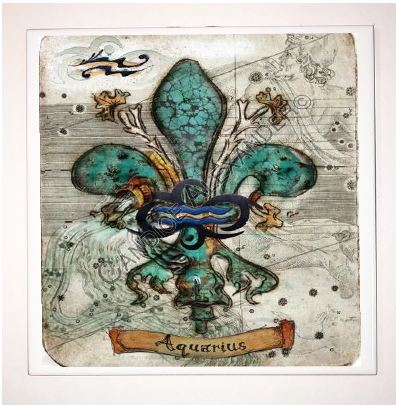 "Aquarius" is a fleur de lis design by Candice Alexander that features a constellation studded background with a green central fleur with imagery supporting the zodiac symbology.