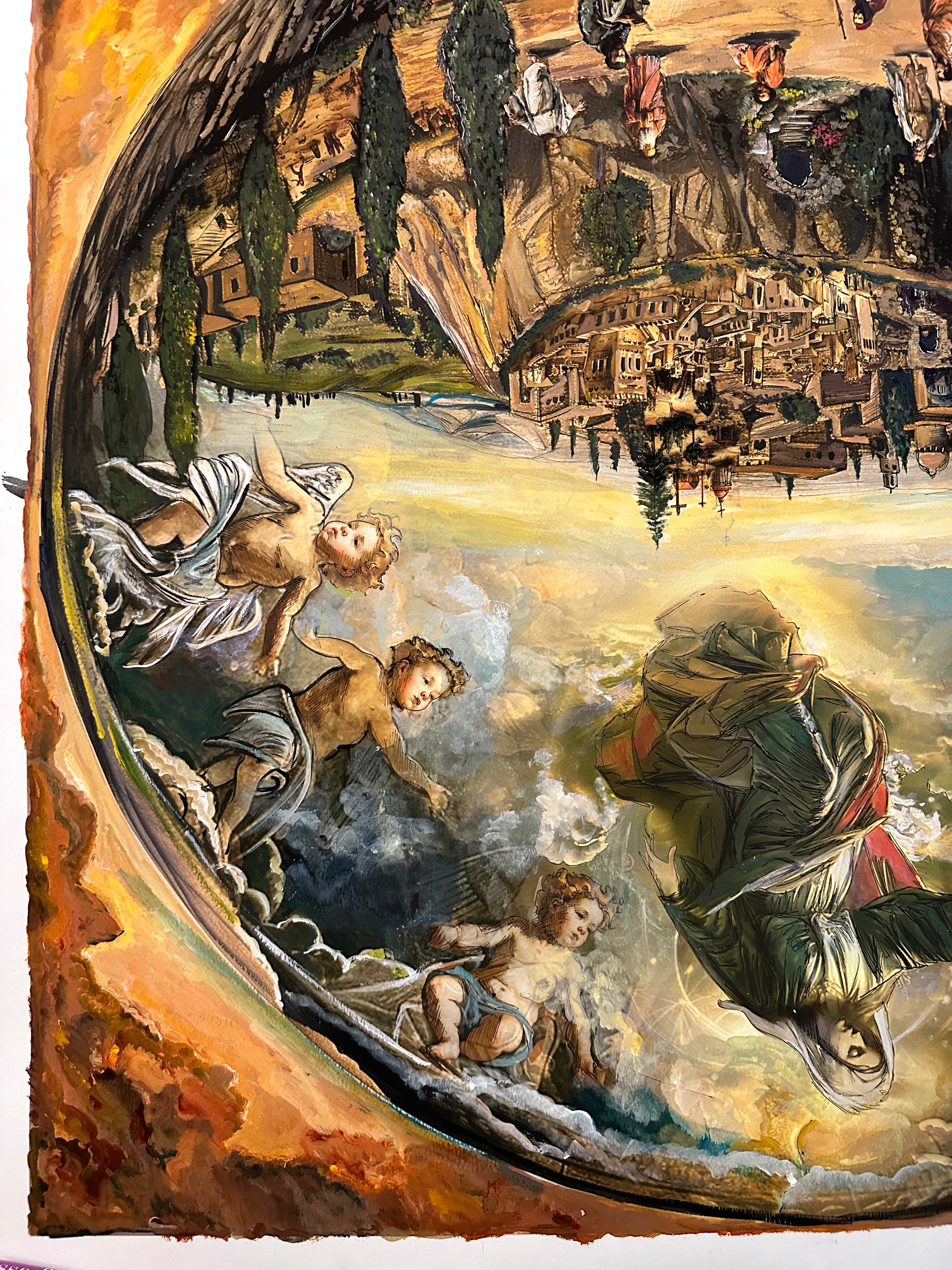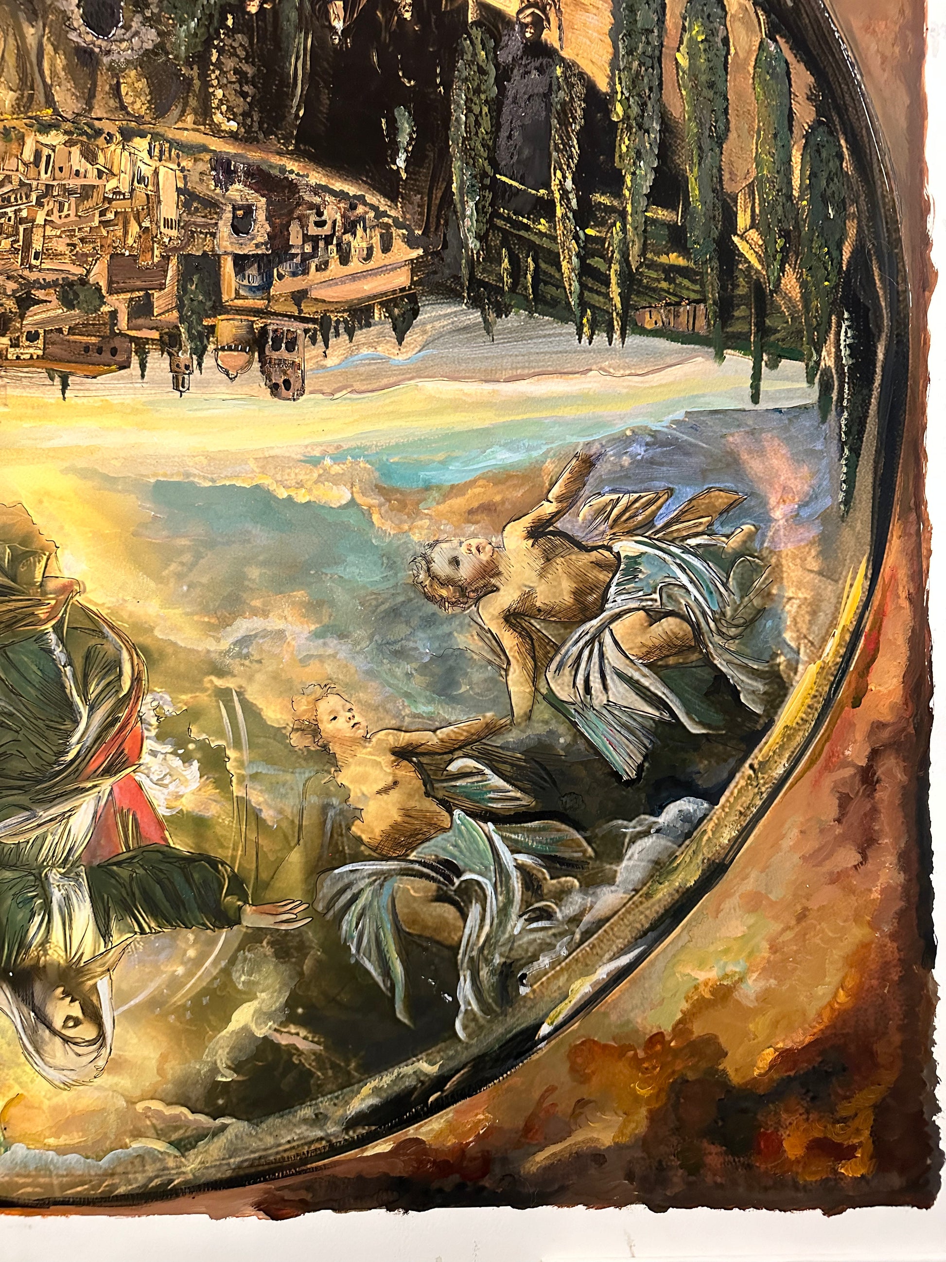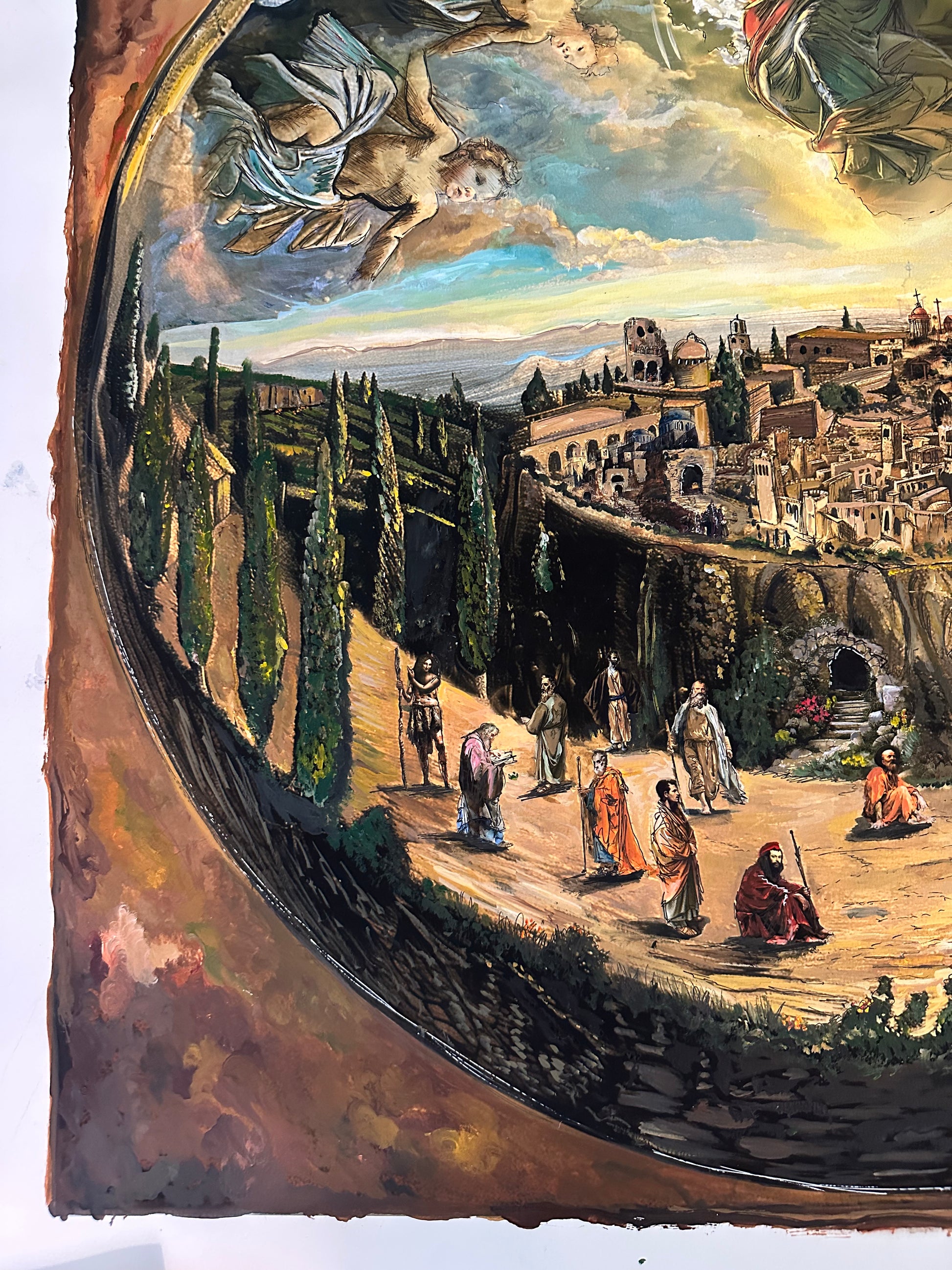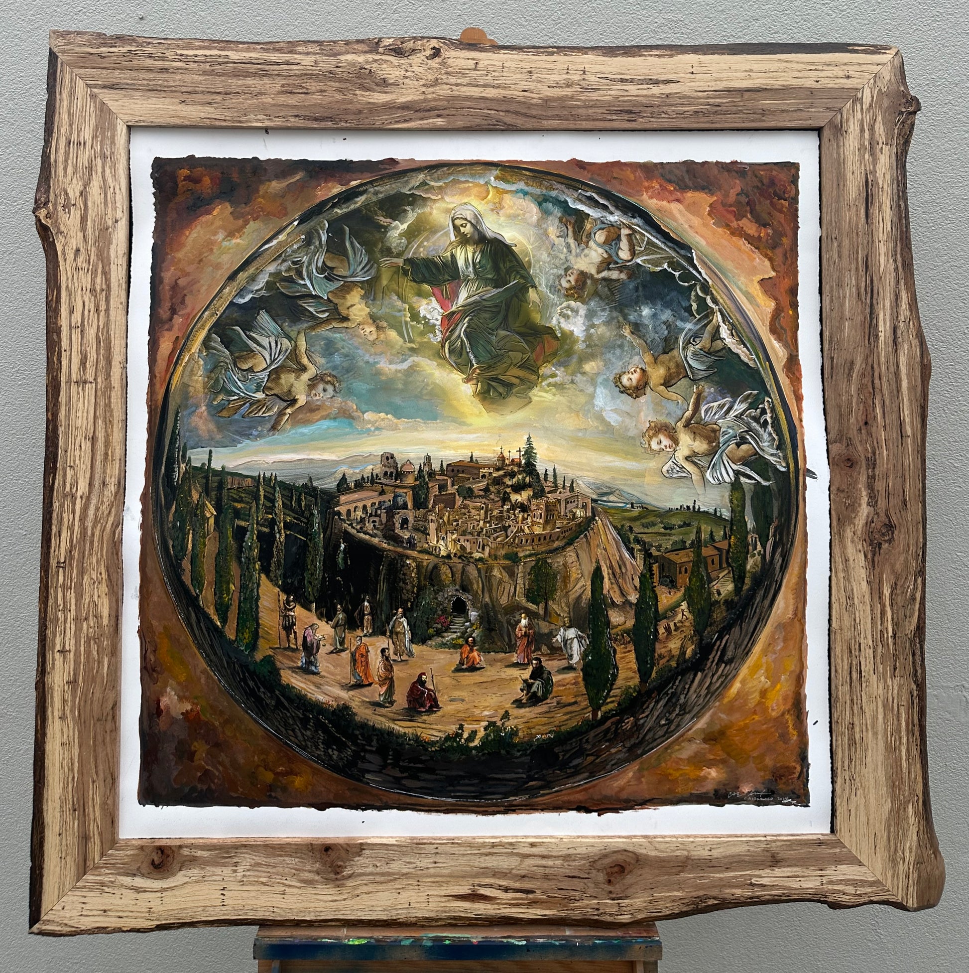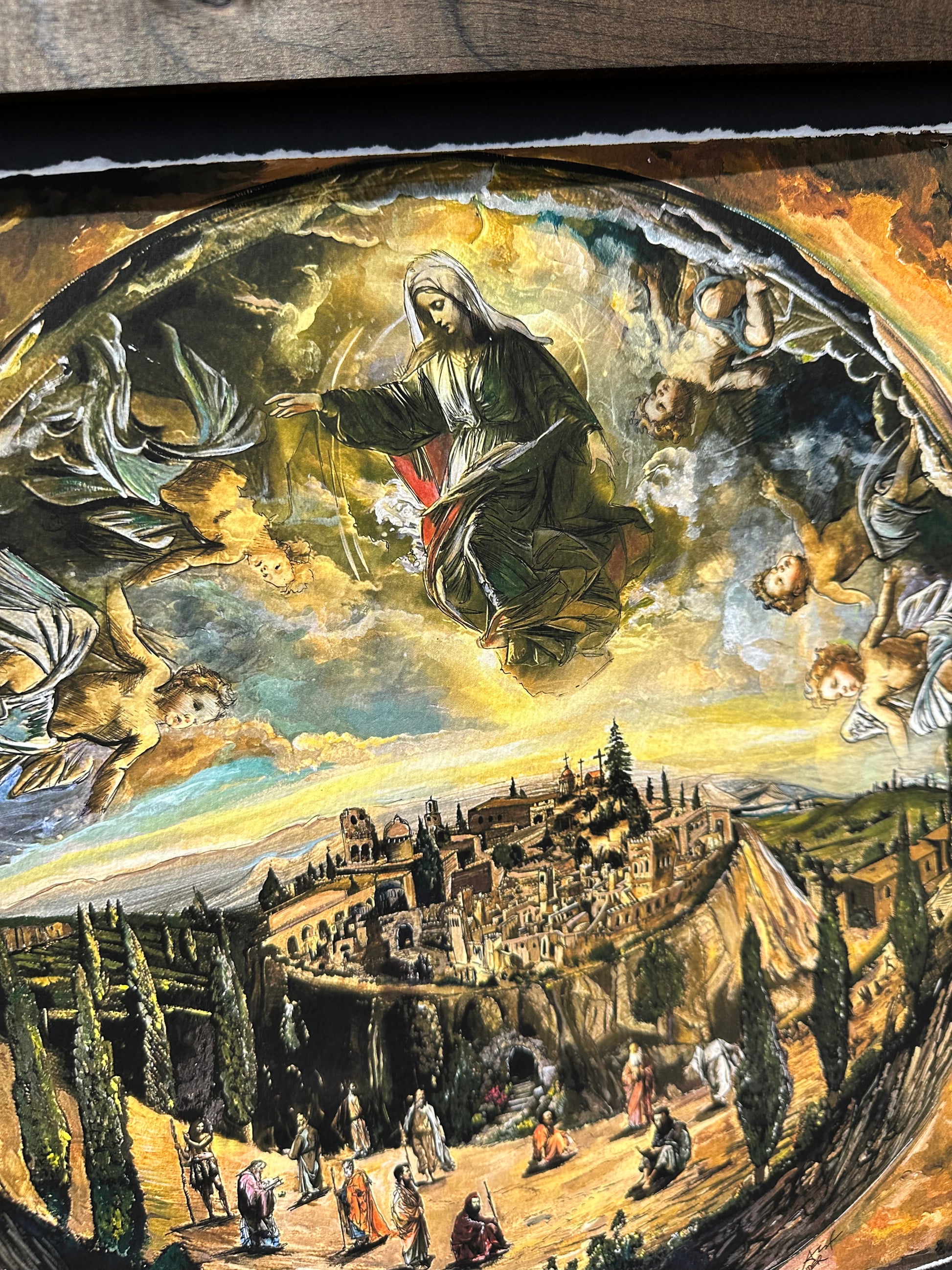 This captivating new artwork vividly portrays the Blessed Virgin Mary's ascension into heaven. This masterpiece captures the celestial moment when Mary, surrounded by a chorus of Michelangelo's angels, is assumed body and soul into eternal glory. Candice's use of radiant light and vibrant colors emphasizes the divine intervention and the beauty of this sacred event. The serene expression on Mary's face, combined with the dynamic composition of clouds and heavenly beings, invites viewers into a transcendent experience of faith and wonder.