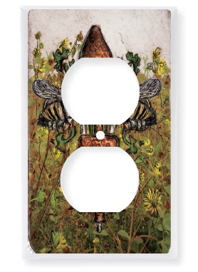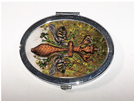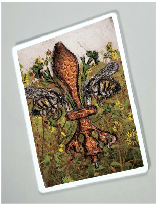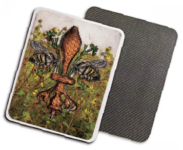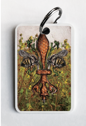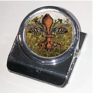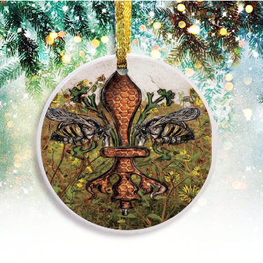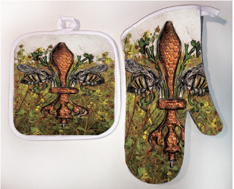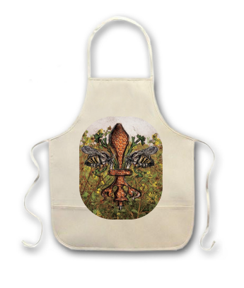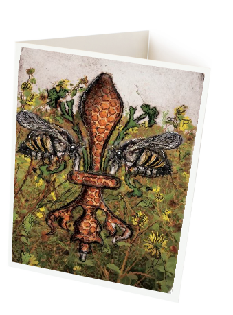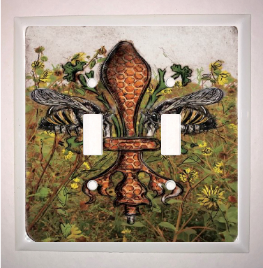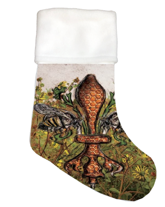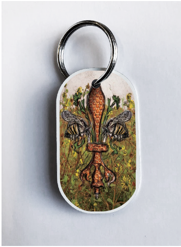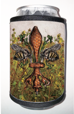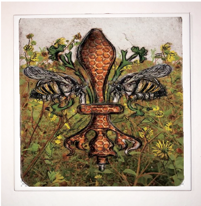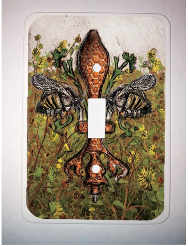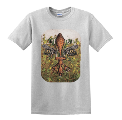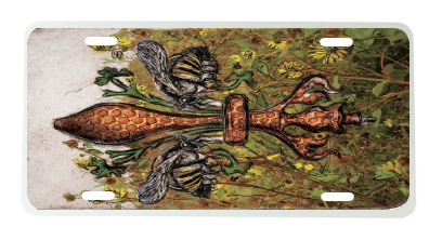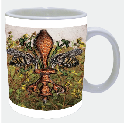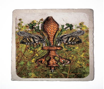 "Bee de Lis" is a fleur de lis design by Candice Alexander that was created to bring awareness to the declining population of the honey bee with a flower field background and central fleur of honeycomb and accented with two bees. Honeybees are a subset of bees in the genus Apis, primarily distinguished by the production and storage of honey and the construction of perennial, colonial nests out of wax. Beekeepers in Western countries have been reporting slow declines of stocks for many years, apparently due to impaired protein production, changes in agricultural practice, or unpredictable weather.