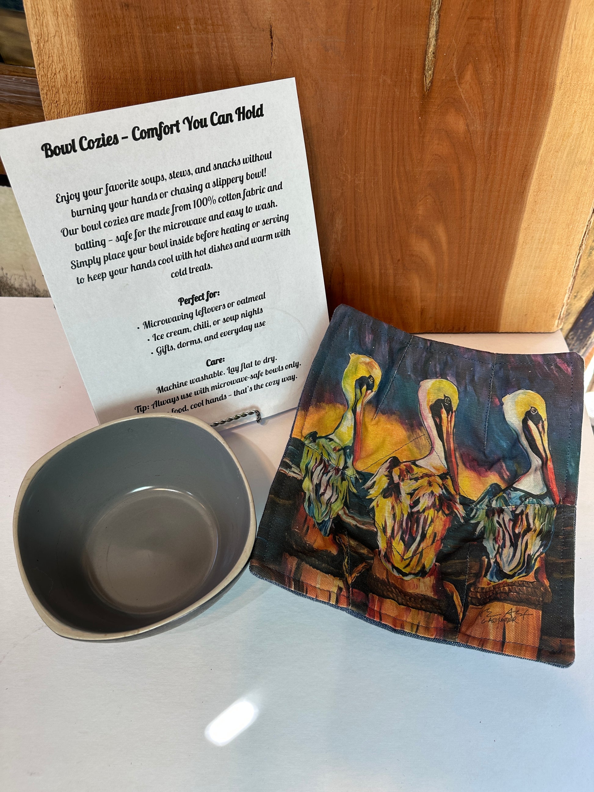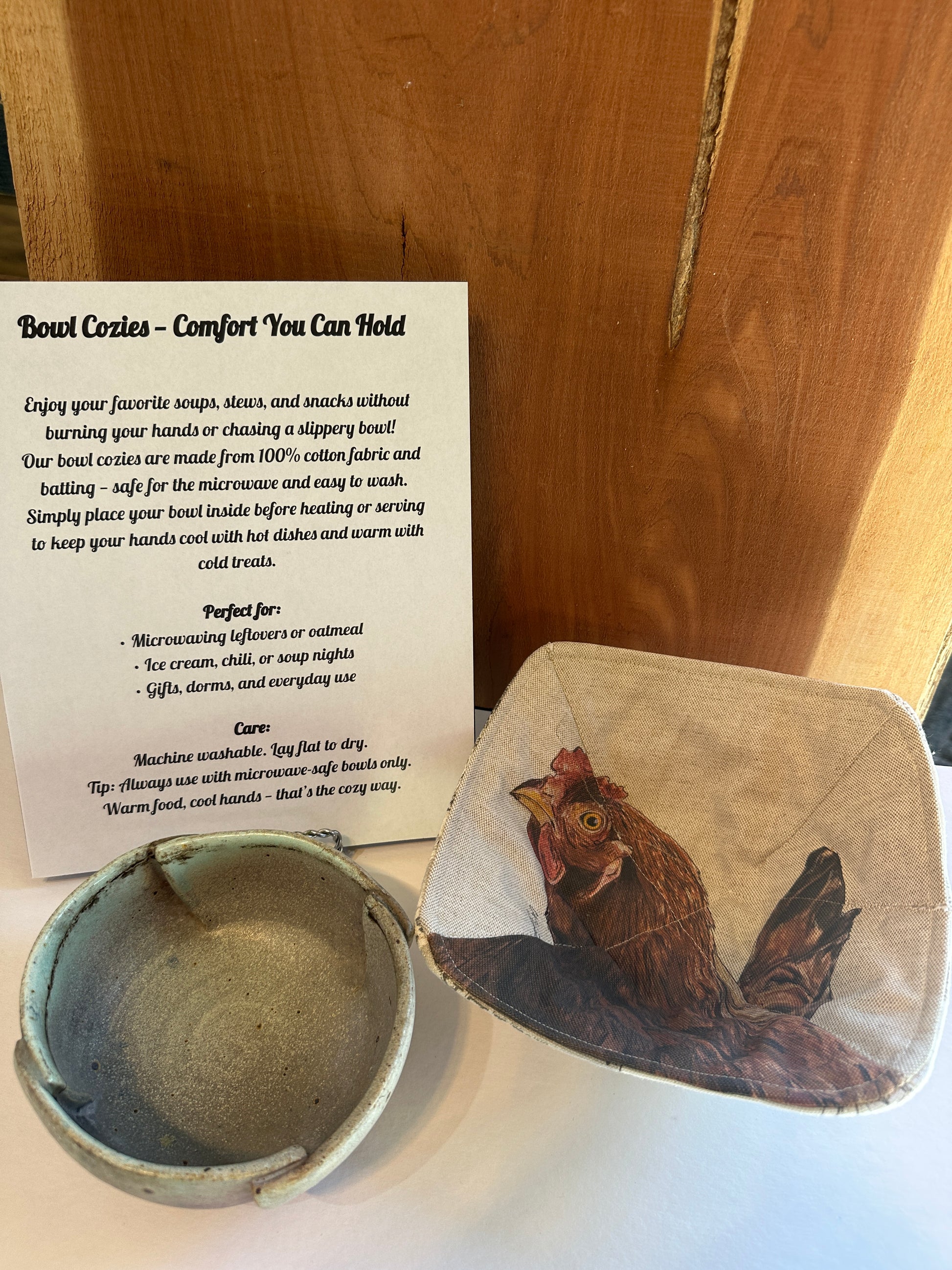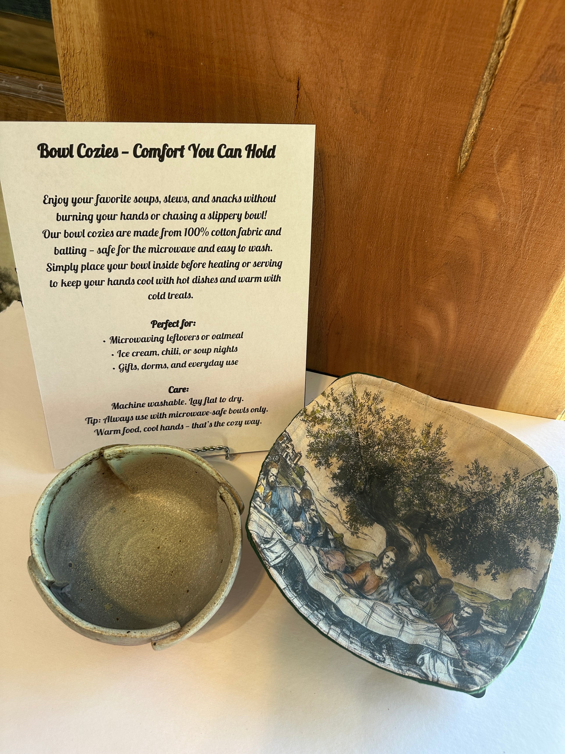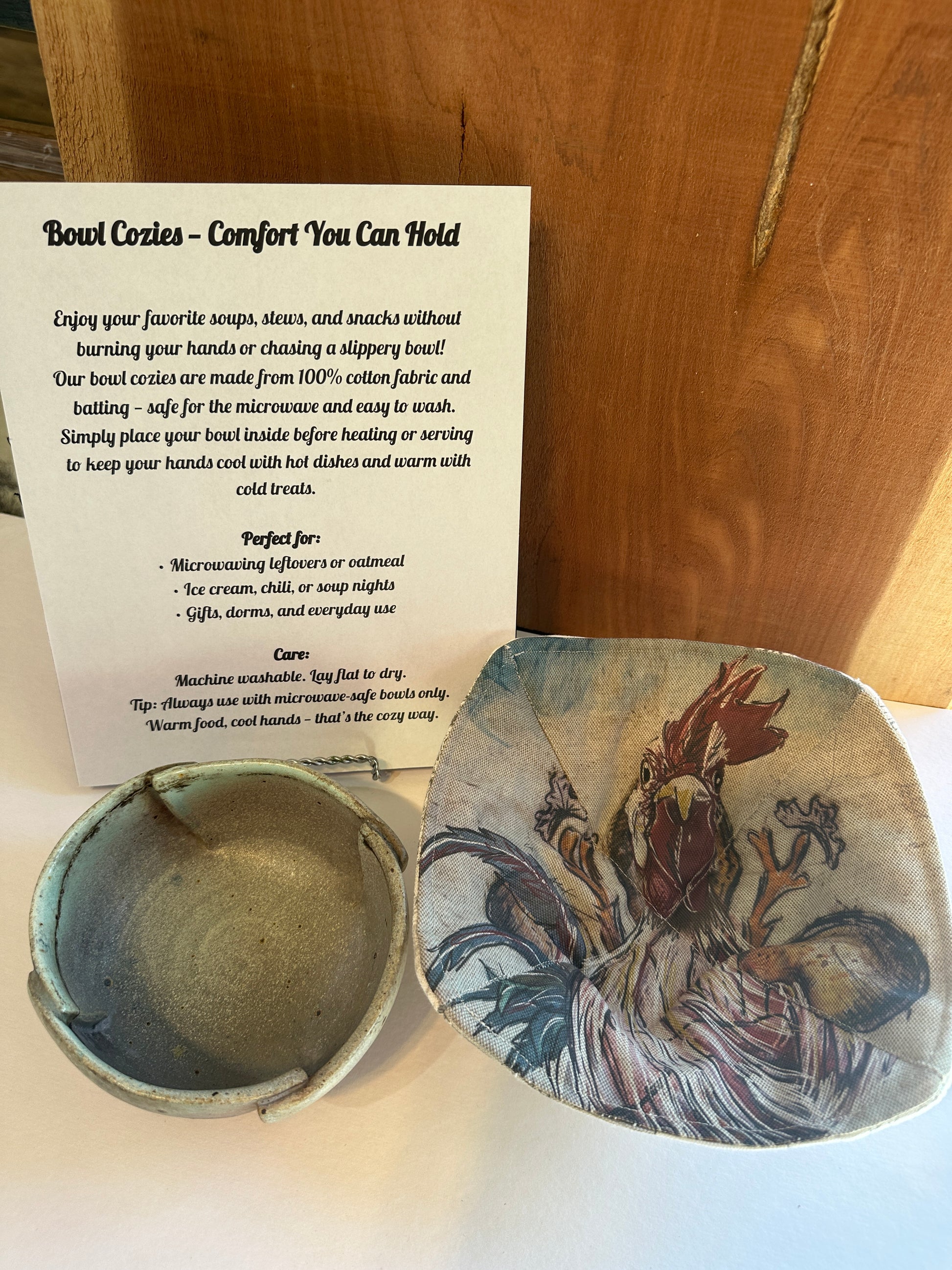 Our bowl cozies are made from 100% cotton fabric and batting — safe for the microwave and easy to wash. Simply place your bowl inside before heating or serving to keep your hands cool with hot dishes and warm with cold treats.