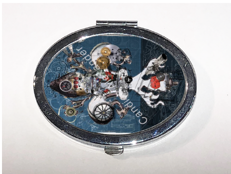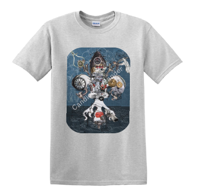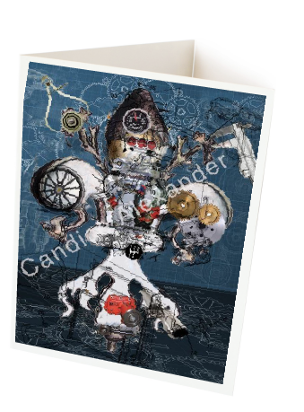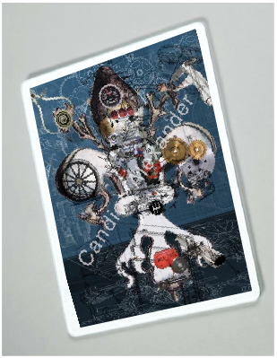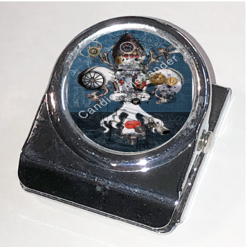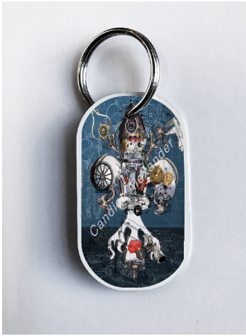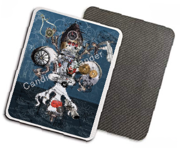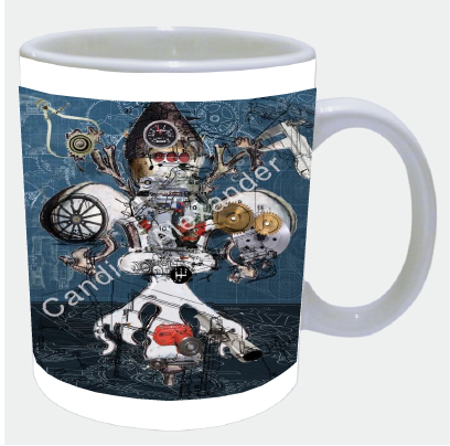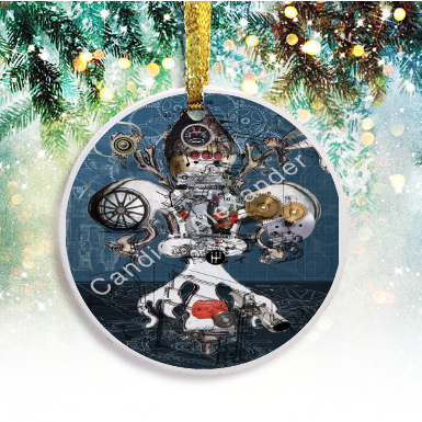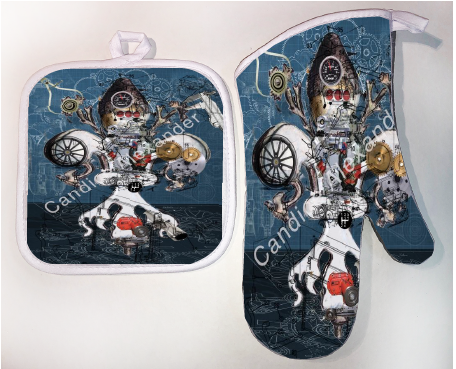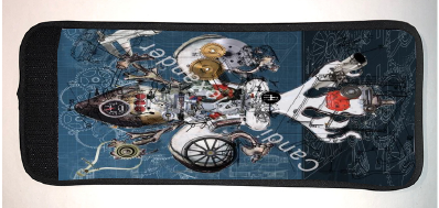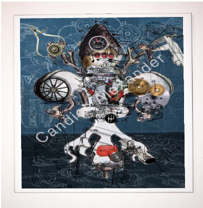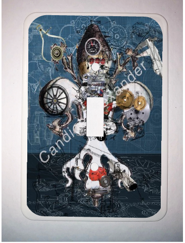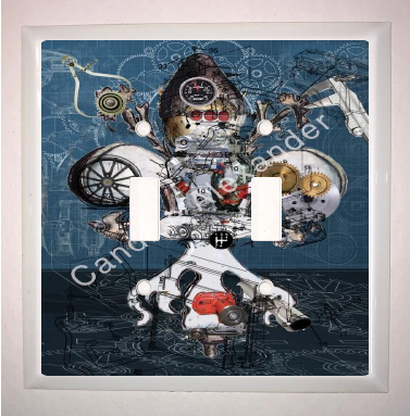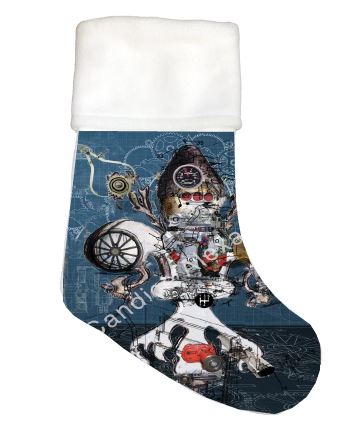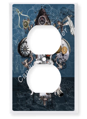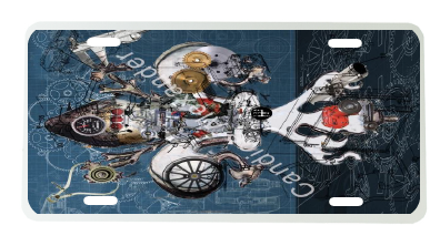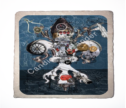 "Car Parts" is a Fleur de Lis design by Candice Alexander that was commissioned for a mechanical minded car enthusiast and features a background of blueprints with a central fleur of white littered with imagery related to vehicles and the internal combustion engine.