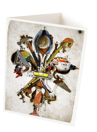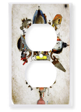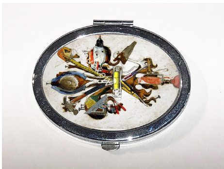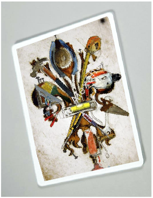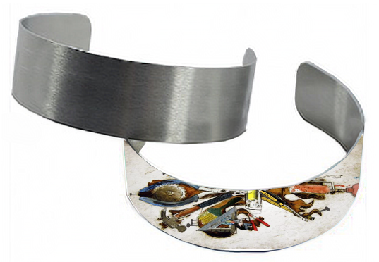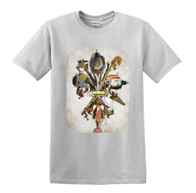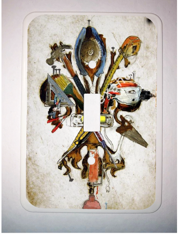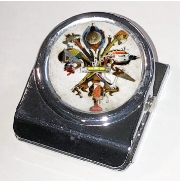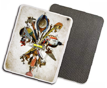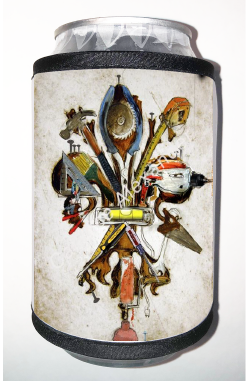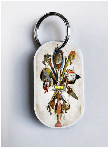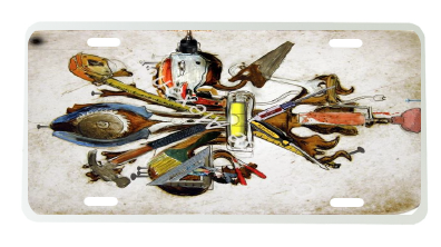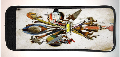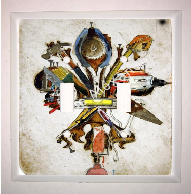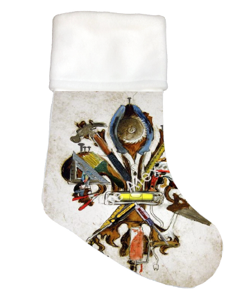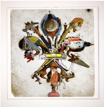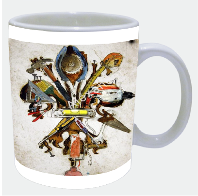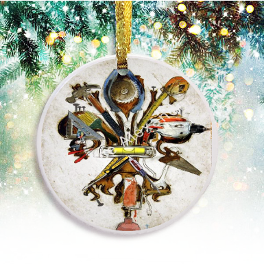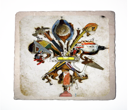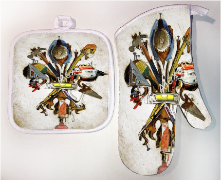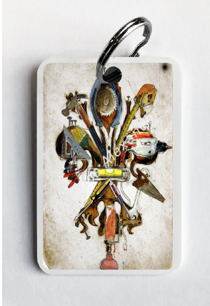 "Carpenter" a Fleur de Lis design by Candice Alexander that was commissioned to represent the Carpentry career and features a neutral background with a central fleur embellished with measuring tape, saw, hammer drill and other carpentry tools.