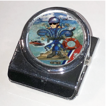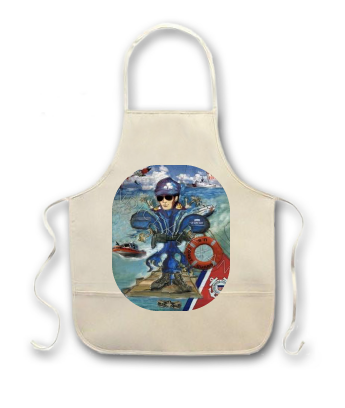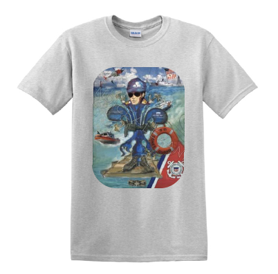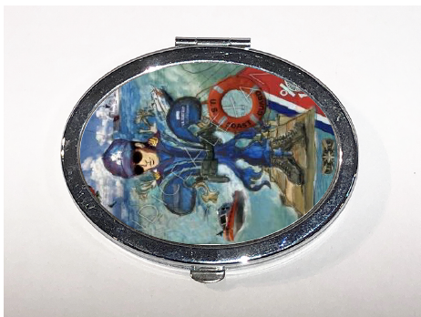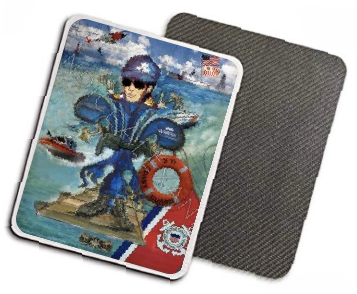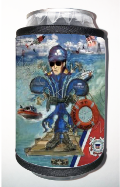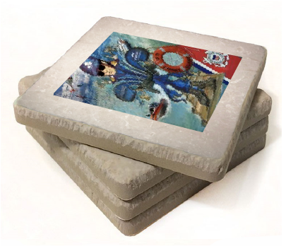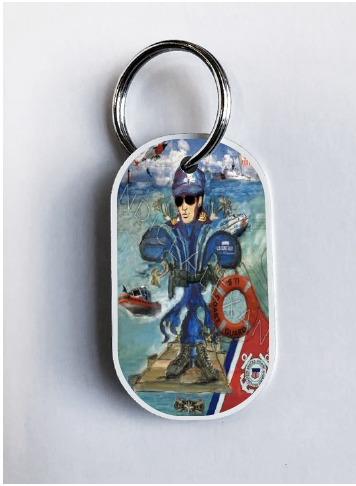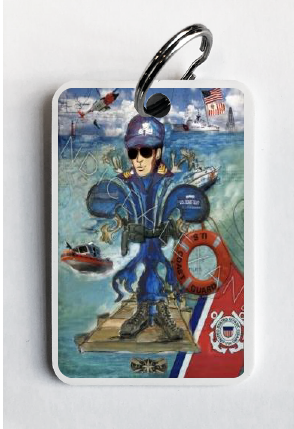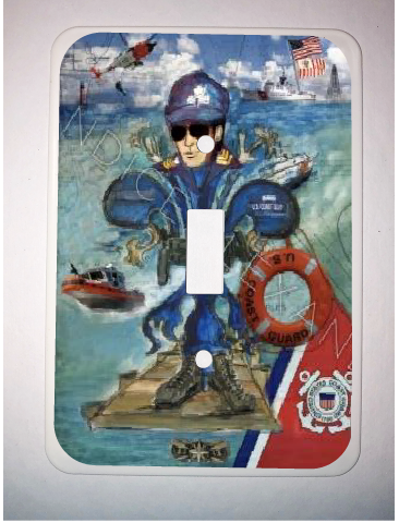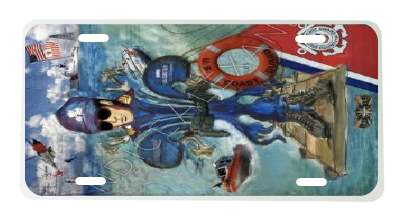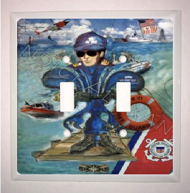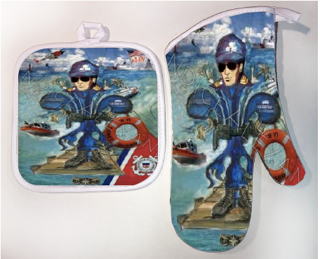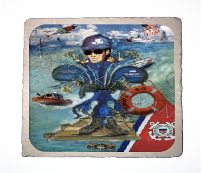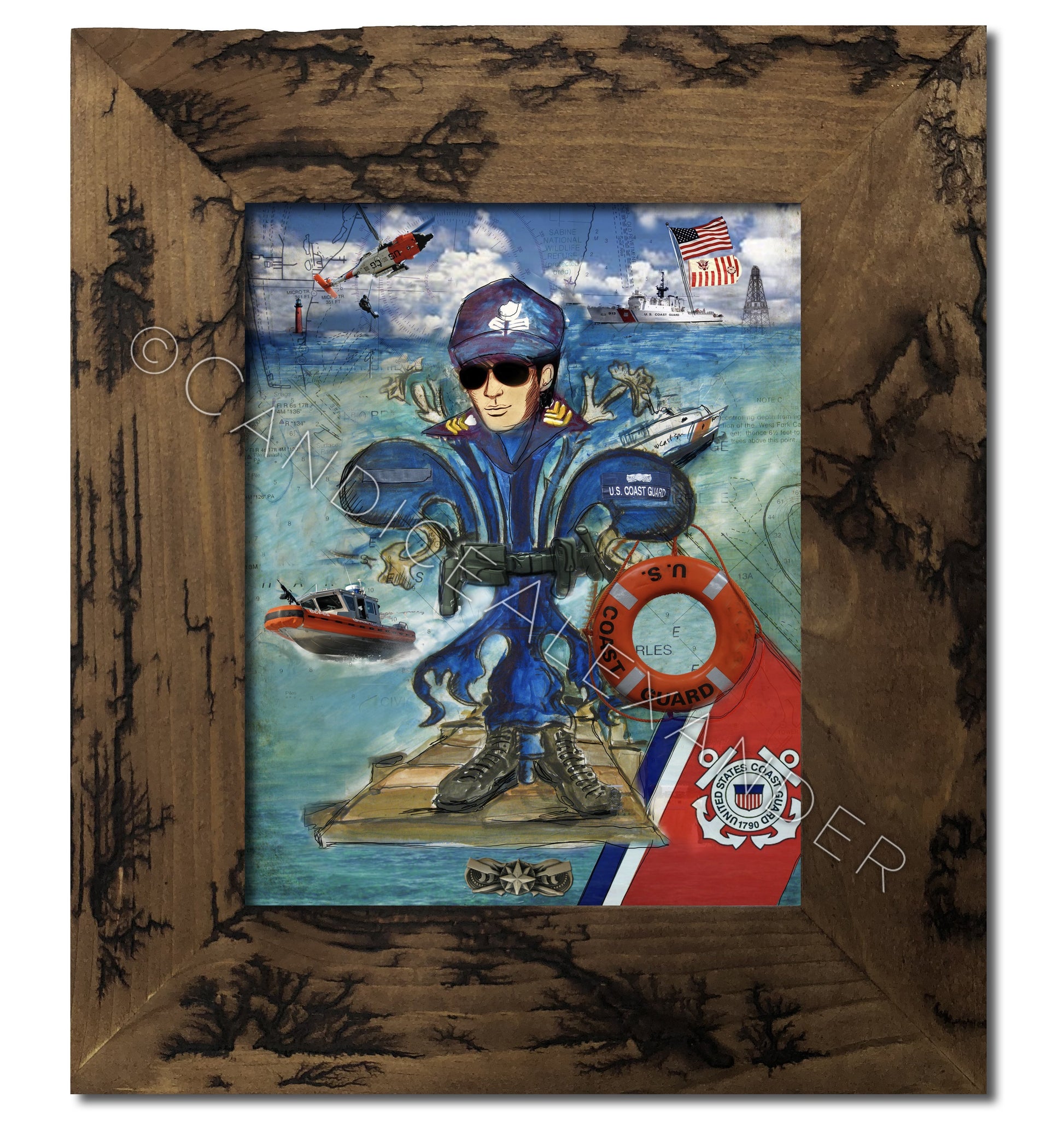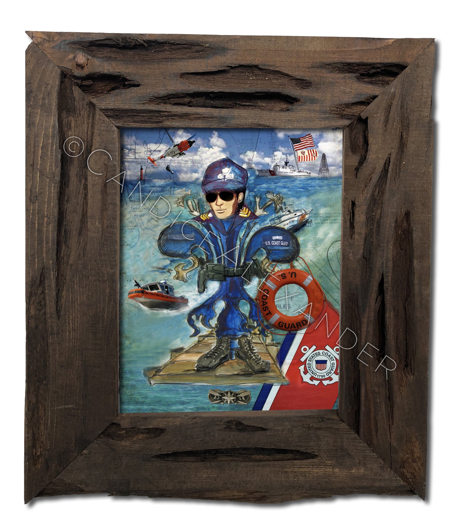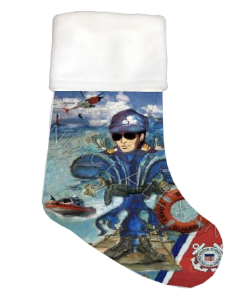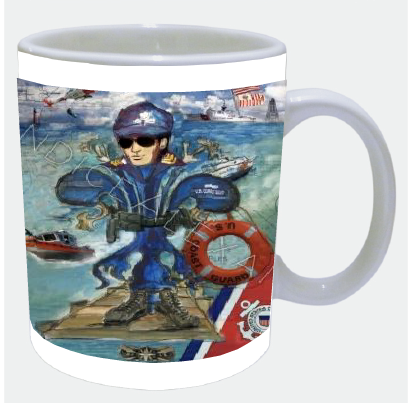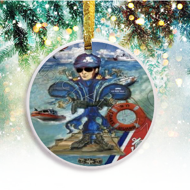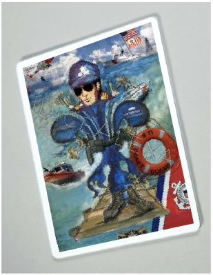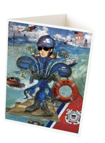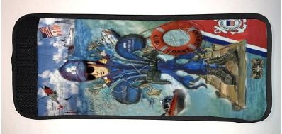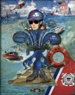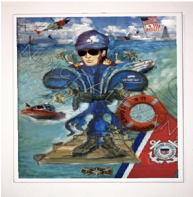 "Coast Guard" is a fleur de lis design by Candice Alexander featuring a seascape background complete with boats, flags, pier, and coast guard logo and a centrally located fleur dressed up in the blue coast guard uniform intended to honor those in this branch of service working hard to protect us every day.