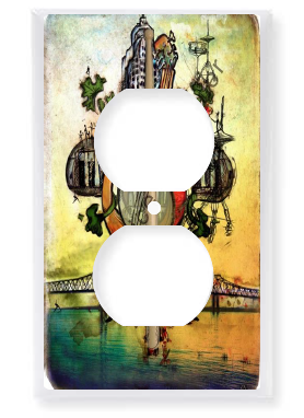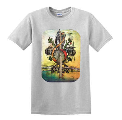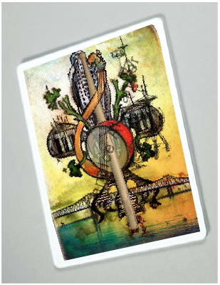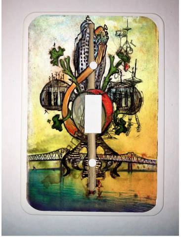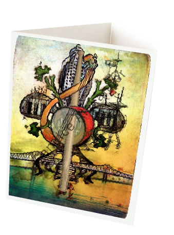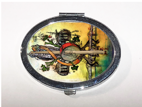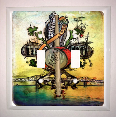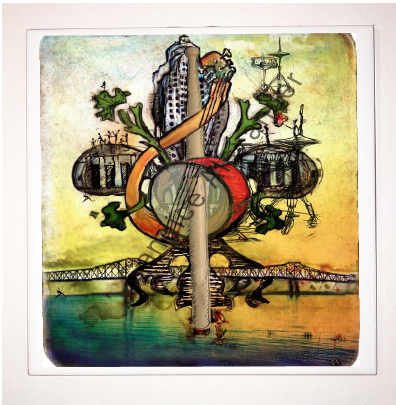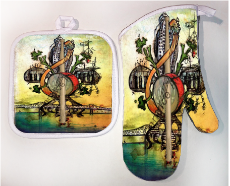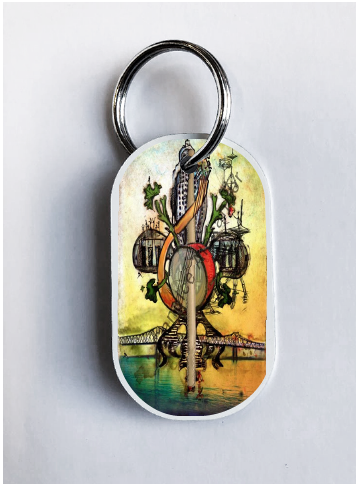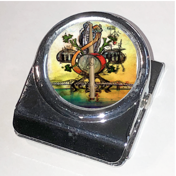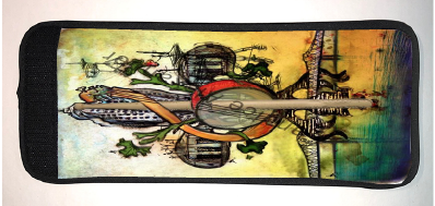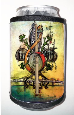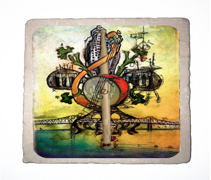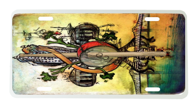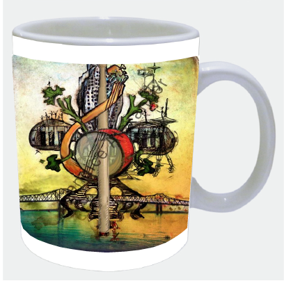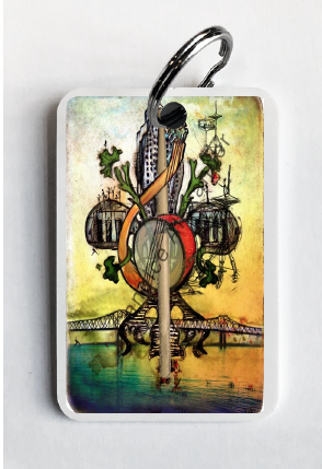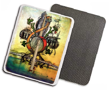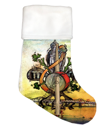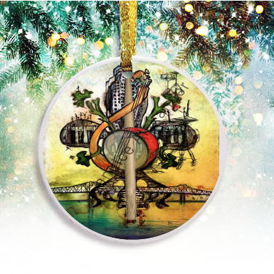 "Drum" is a Fleur De Lis design by Candice Alexander made to represent the musical instrument, Drums. A bridge stretches across a mild background of flowing colors of sky and water while a fleur de lis, consisting of elegant classic buildings and embellished with a drum and accompanying drumstick, is prominently displayed in the center.