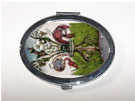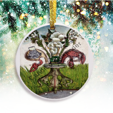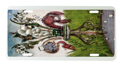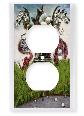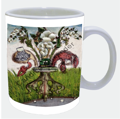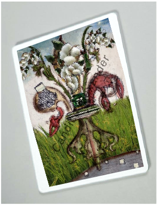"Farm De Lis Cotton" is a fleur de lis design by Candice Alexander that features a rice/crawfish field background with a central fleur embellished with a combine, crawfish, crawfish net and cotton to complement the farming lifestyle represented in this design.