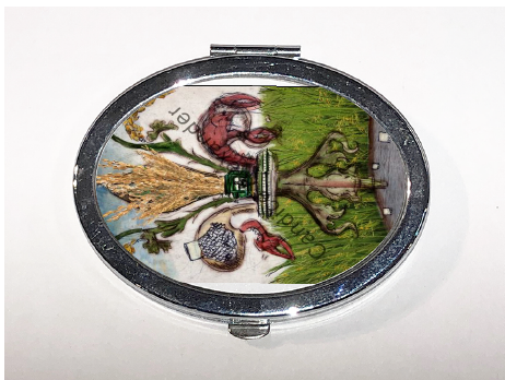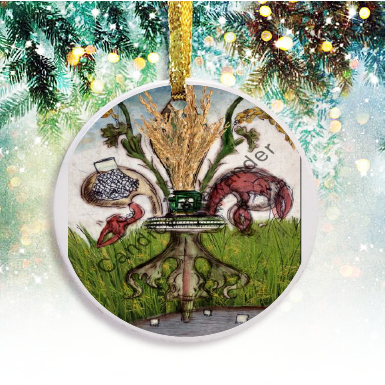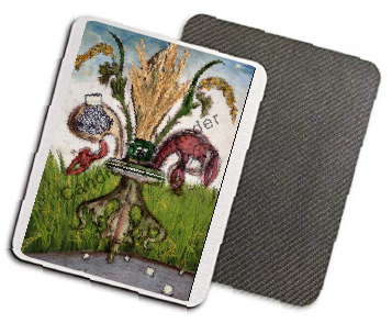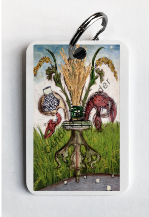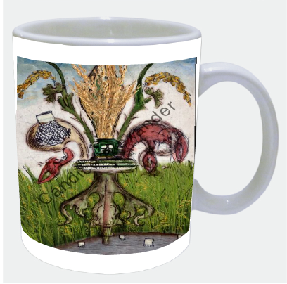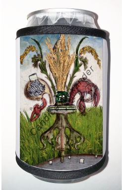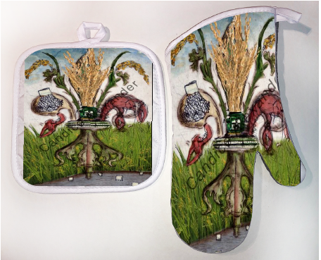 "Farm De Lis Rice" is a fleur de lis design by Candice Alexander that features a rice/crawfish field background with a central fleur embellished with a combine, crawfish, crawfish net and rice to complement the farming lifestyle represented in this design.