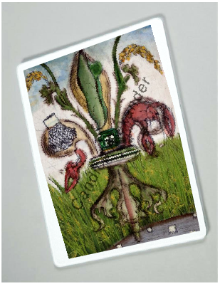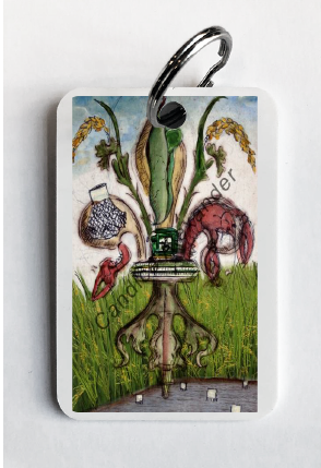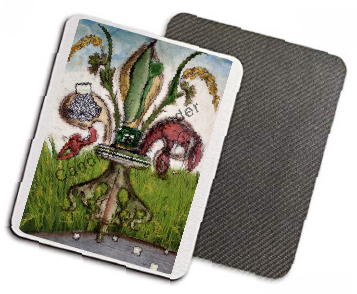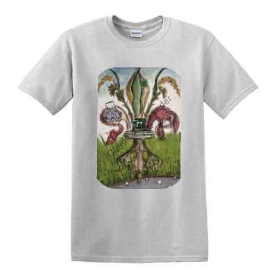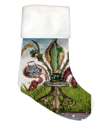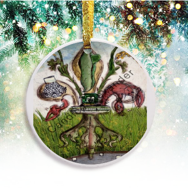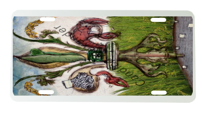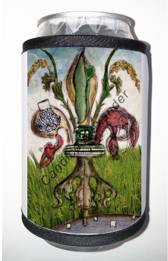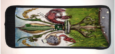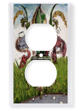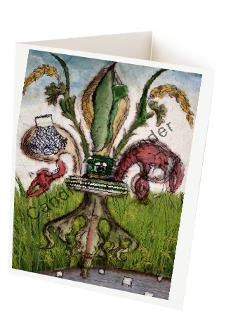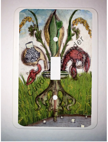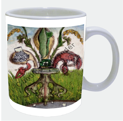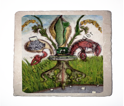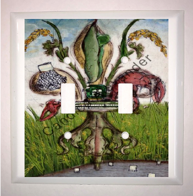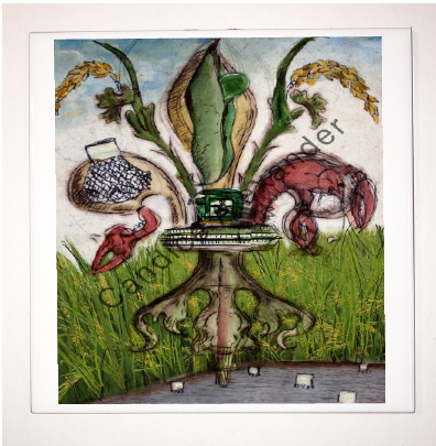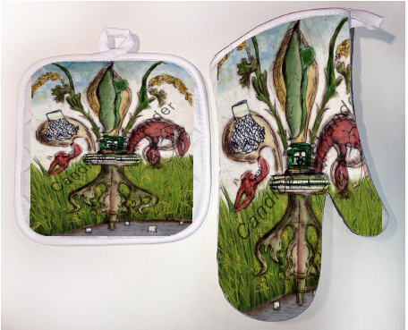 "Farm De Lis Soybean" is a fleur de lis design by Candice Alexander that features a rice/crawfish field background with a central fleur embellished with a combine, crawfish, crawfish net and soybeans to complement the farming lifestyle represented in this design.