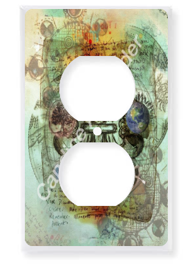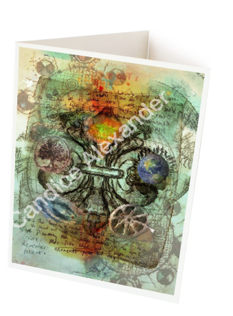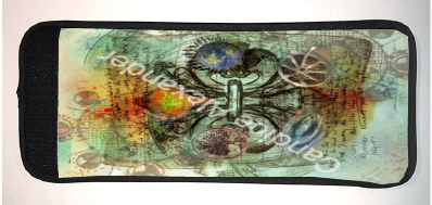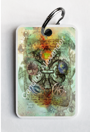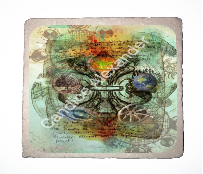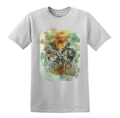 "Five Elements" is a fleur de lis design by Candice Alexander intended to represent the five elements of wind, fire, earth, sea, and sky and does so on a background of muted classical style blueprint drawings with a central fleur highlighting each of the individual elements.