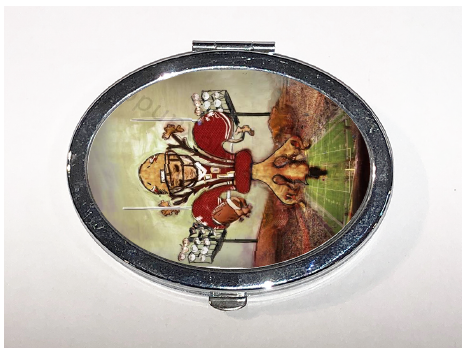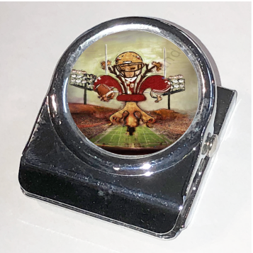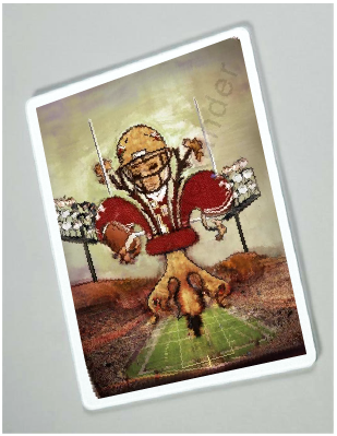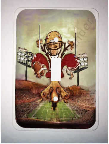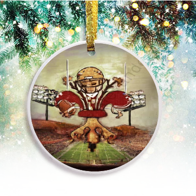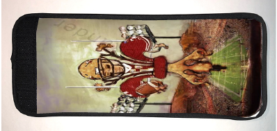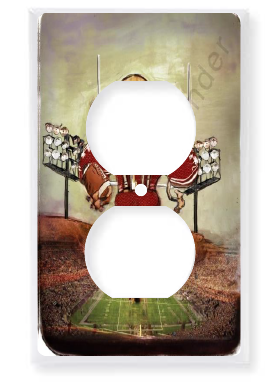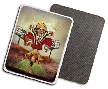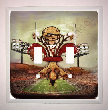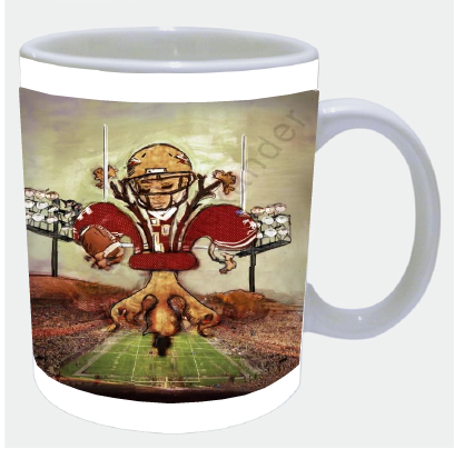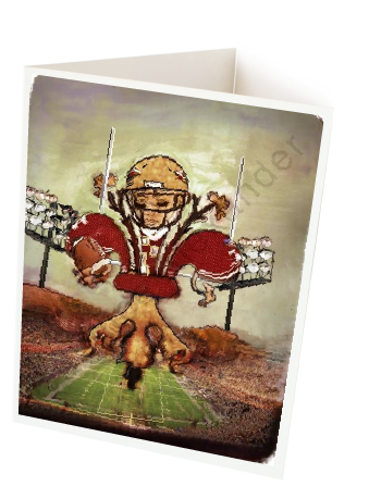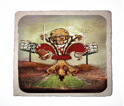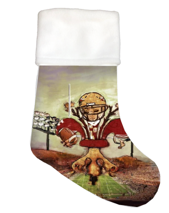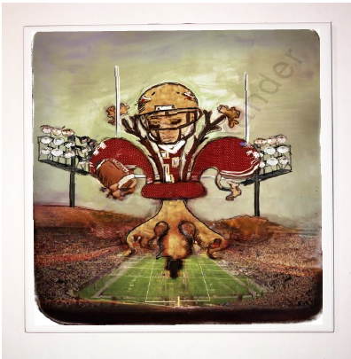 "Florida State Football" is a Fleur De Lis design by Candice Alexander that features a football stadium background with a central fleur in the Florida state team uniform carrying a football.