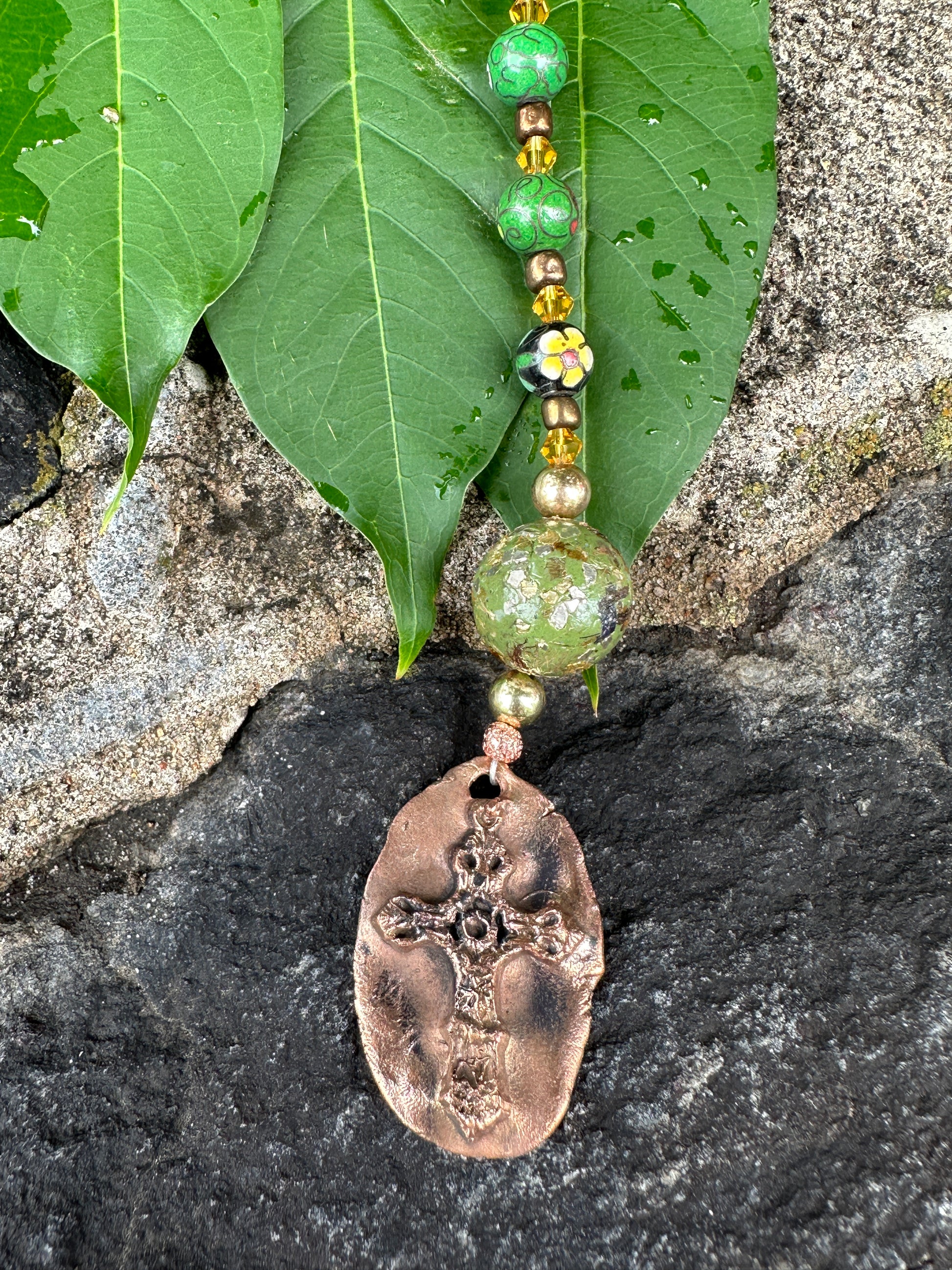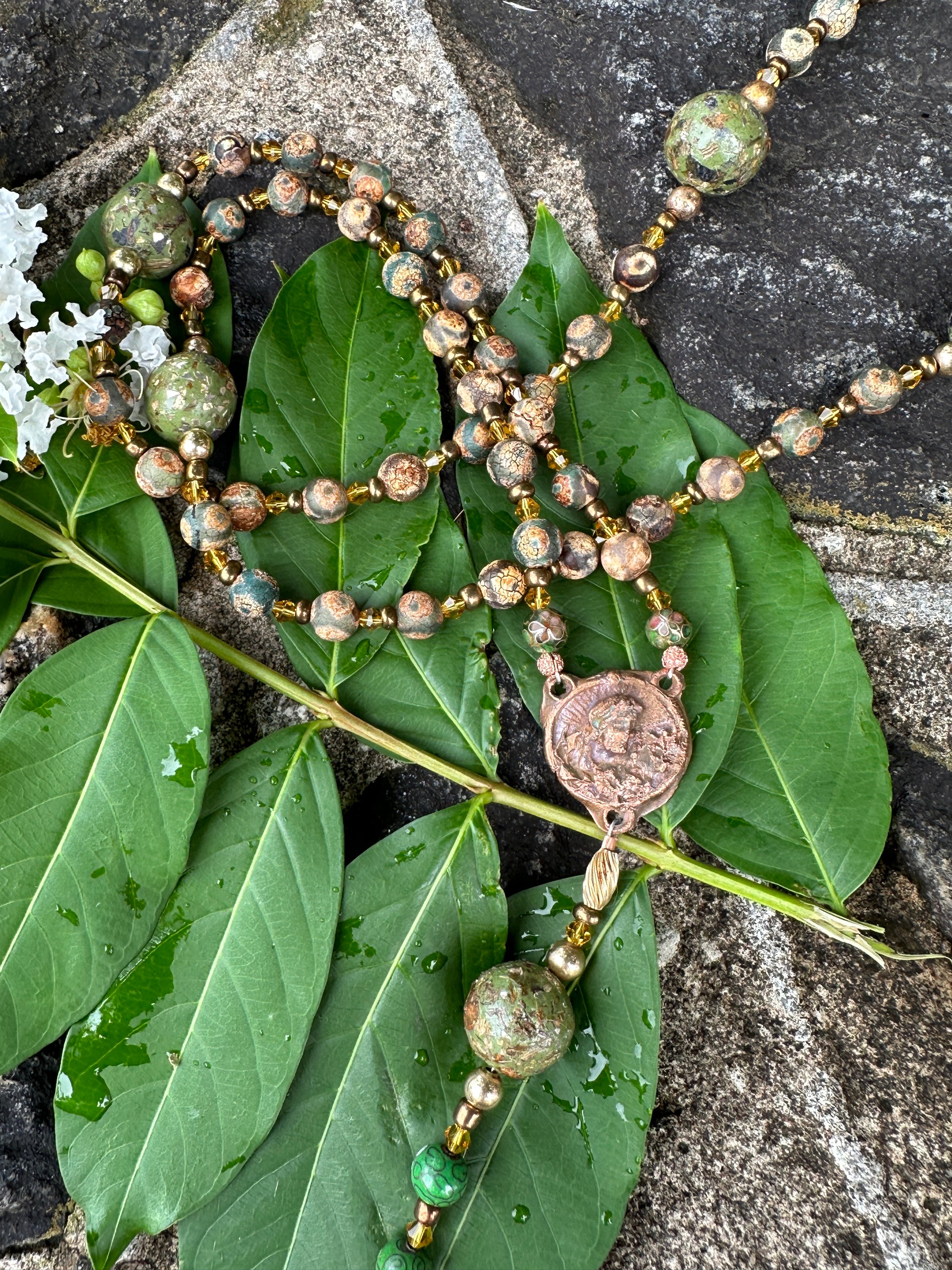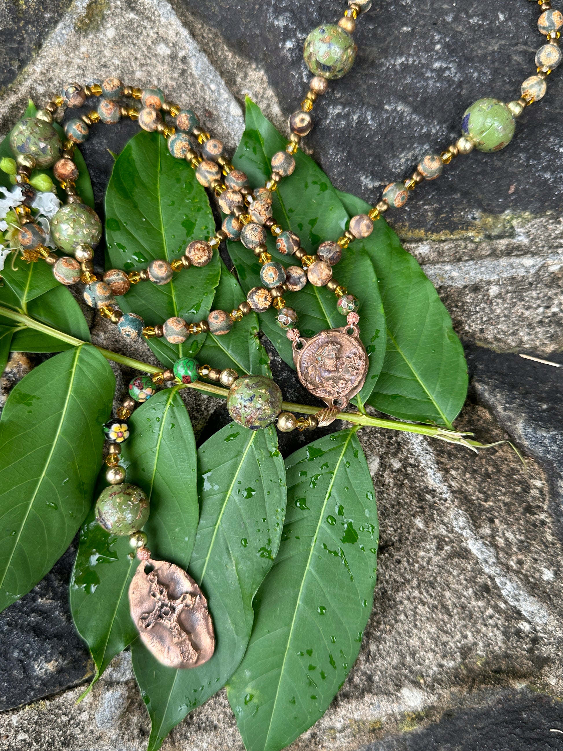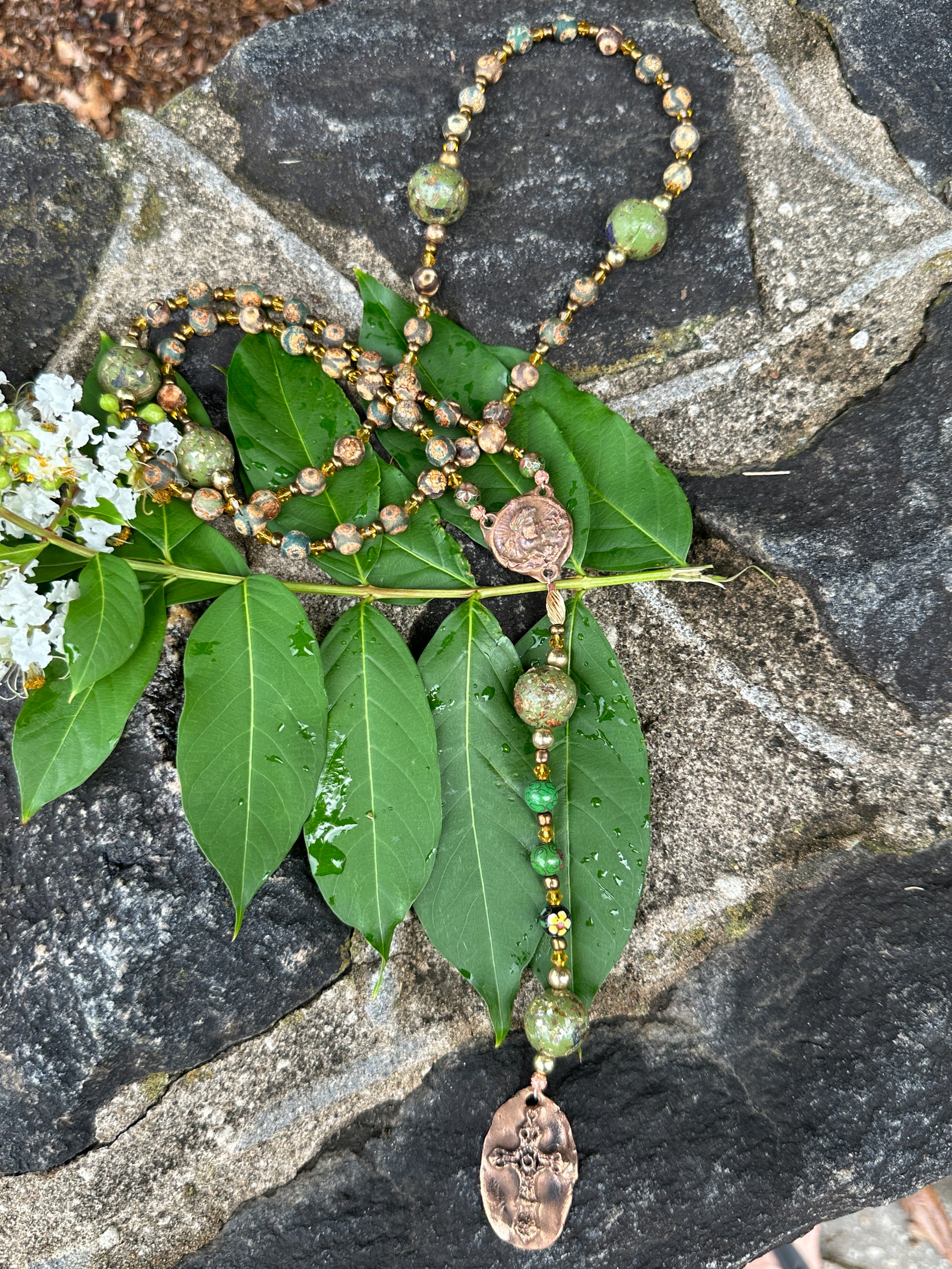 (Green) Dried Flower and Semi-precious Stones with Kiln Fired Copper Handmade Rosary