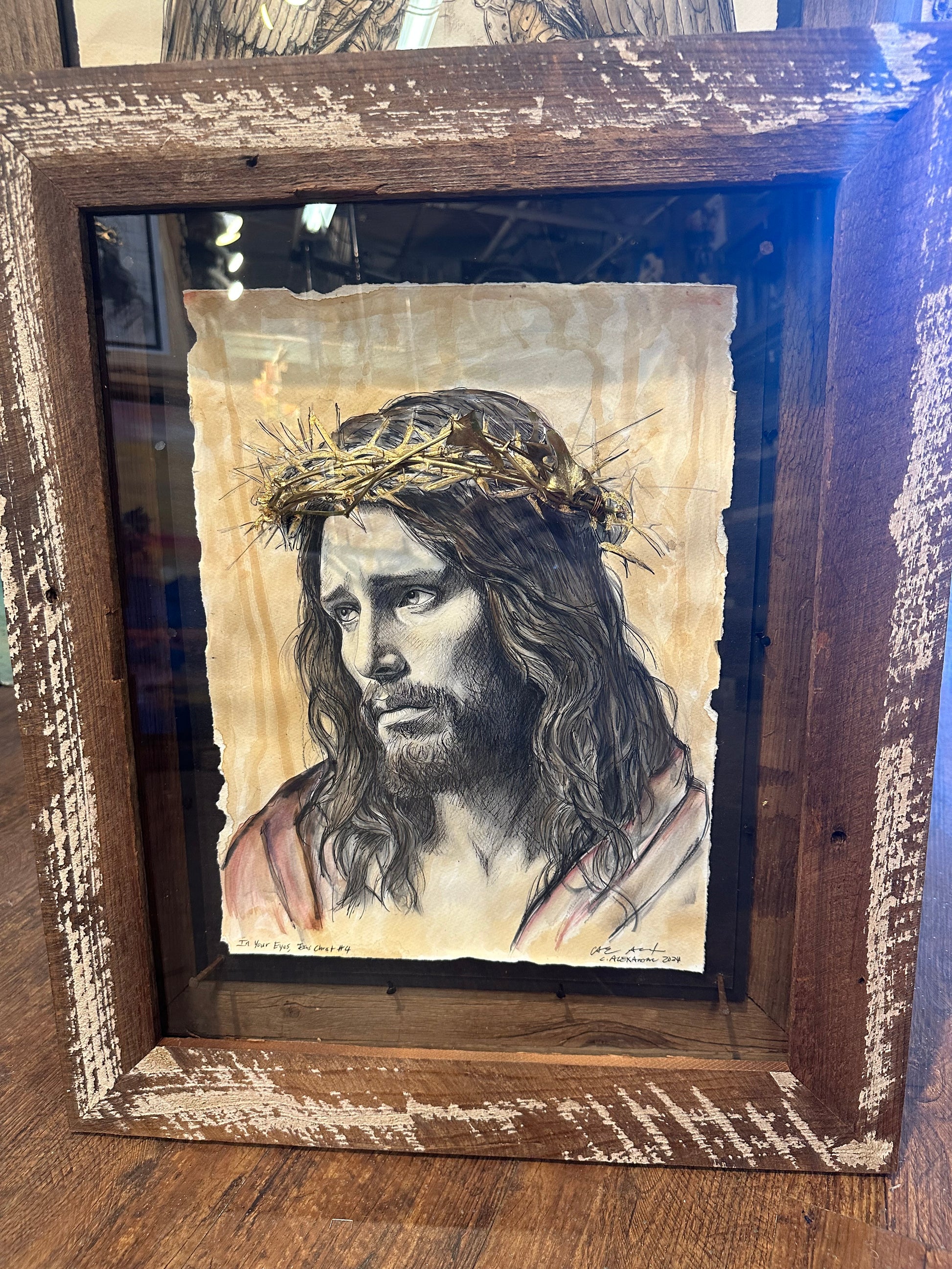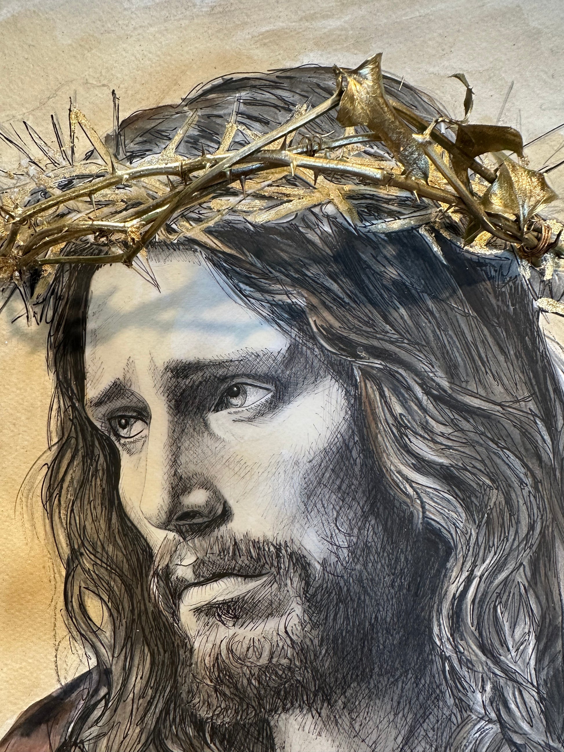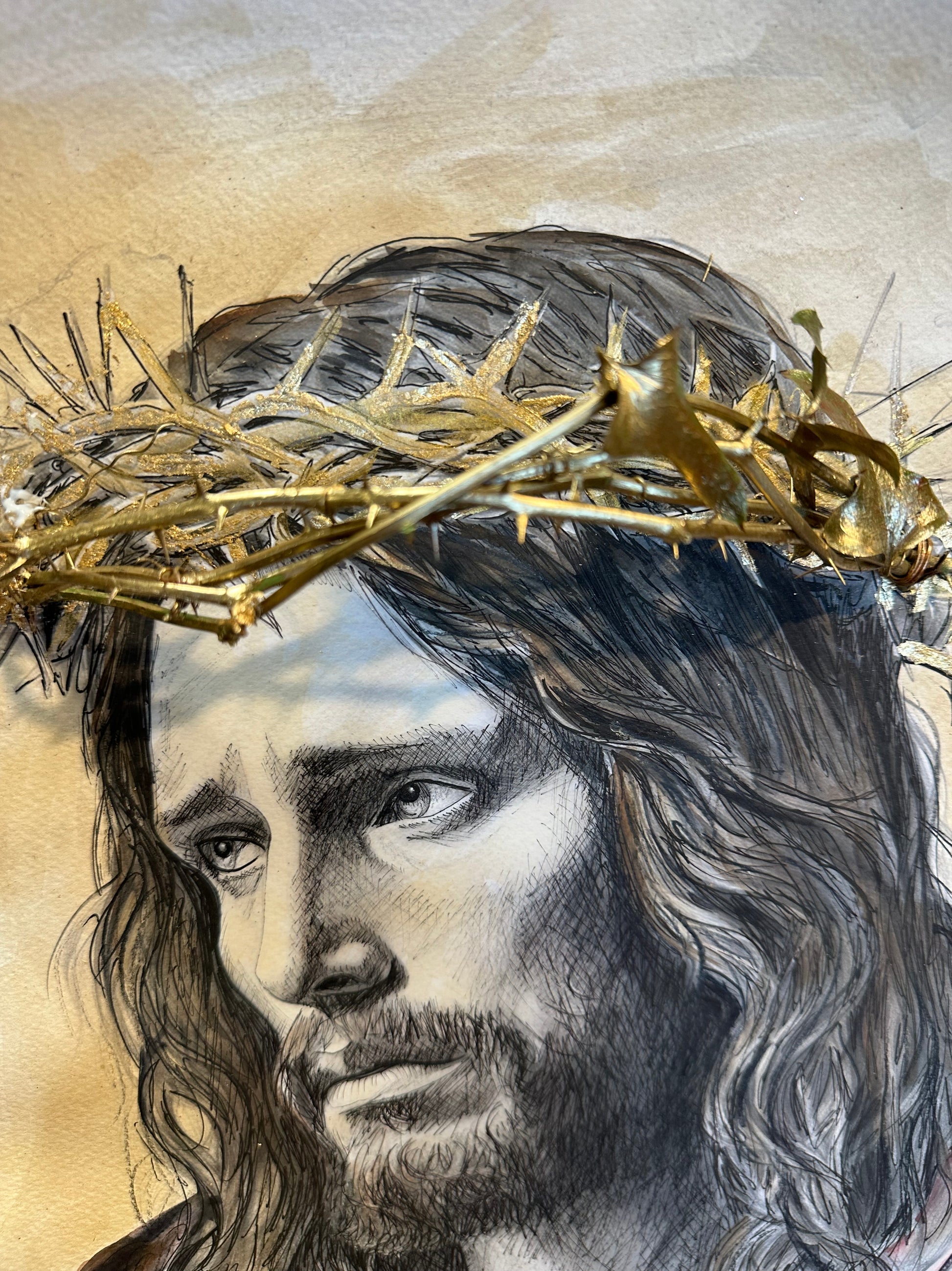 Jesus in watercolor, pencil, and pen. Using charcoal and graphite. Stained with Community Coffee.