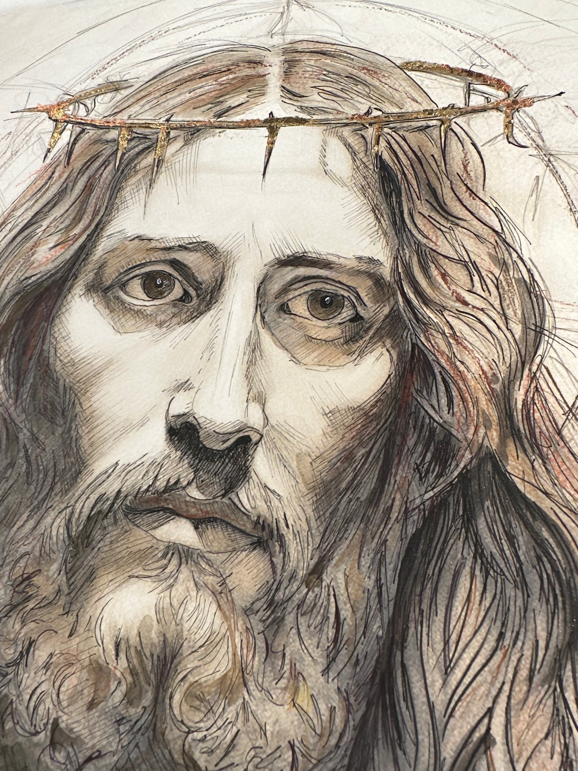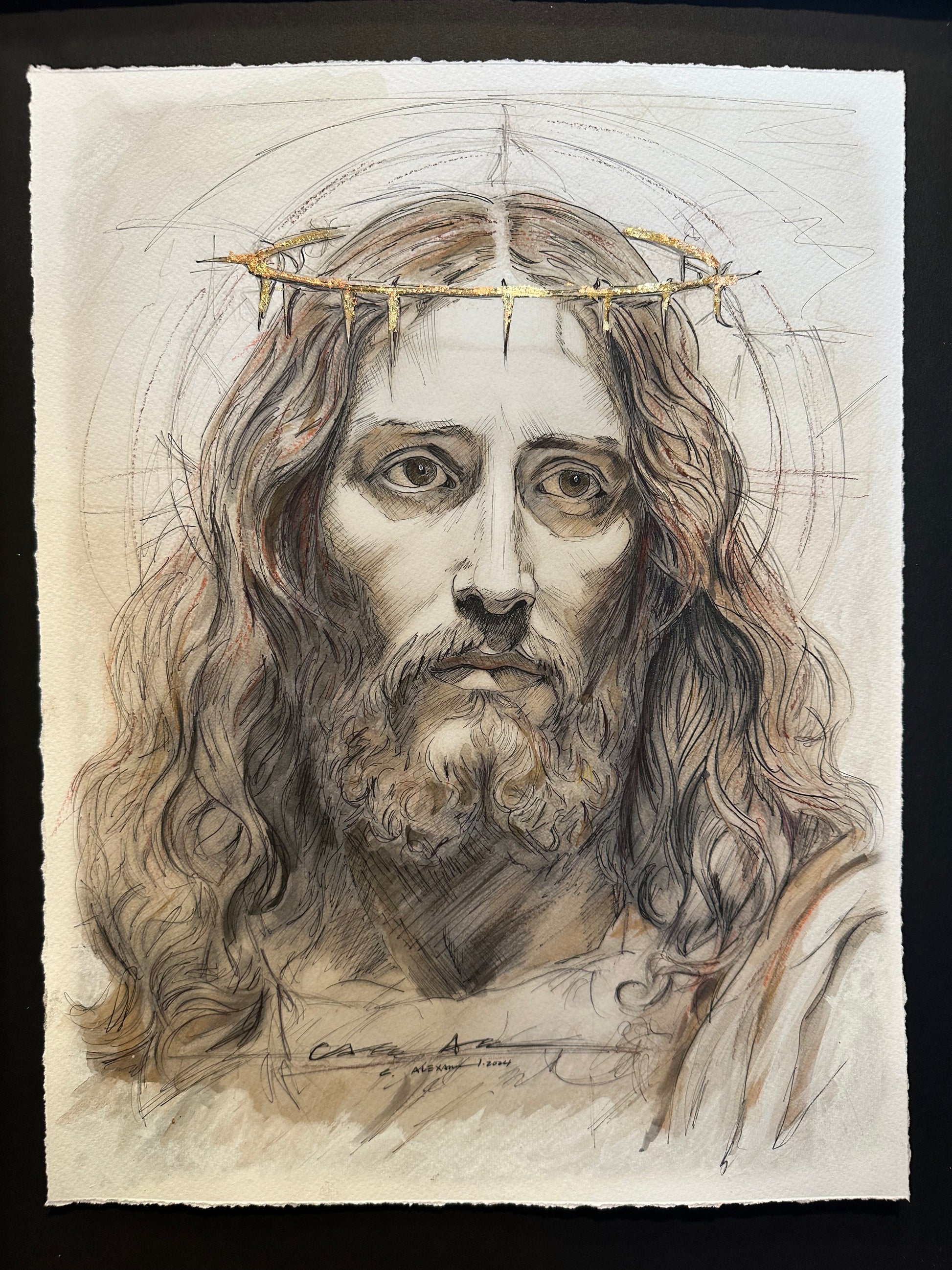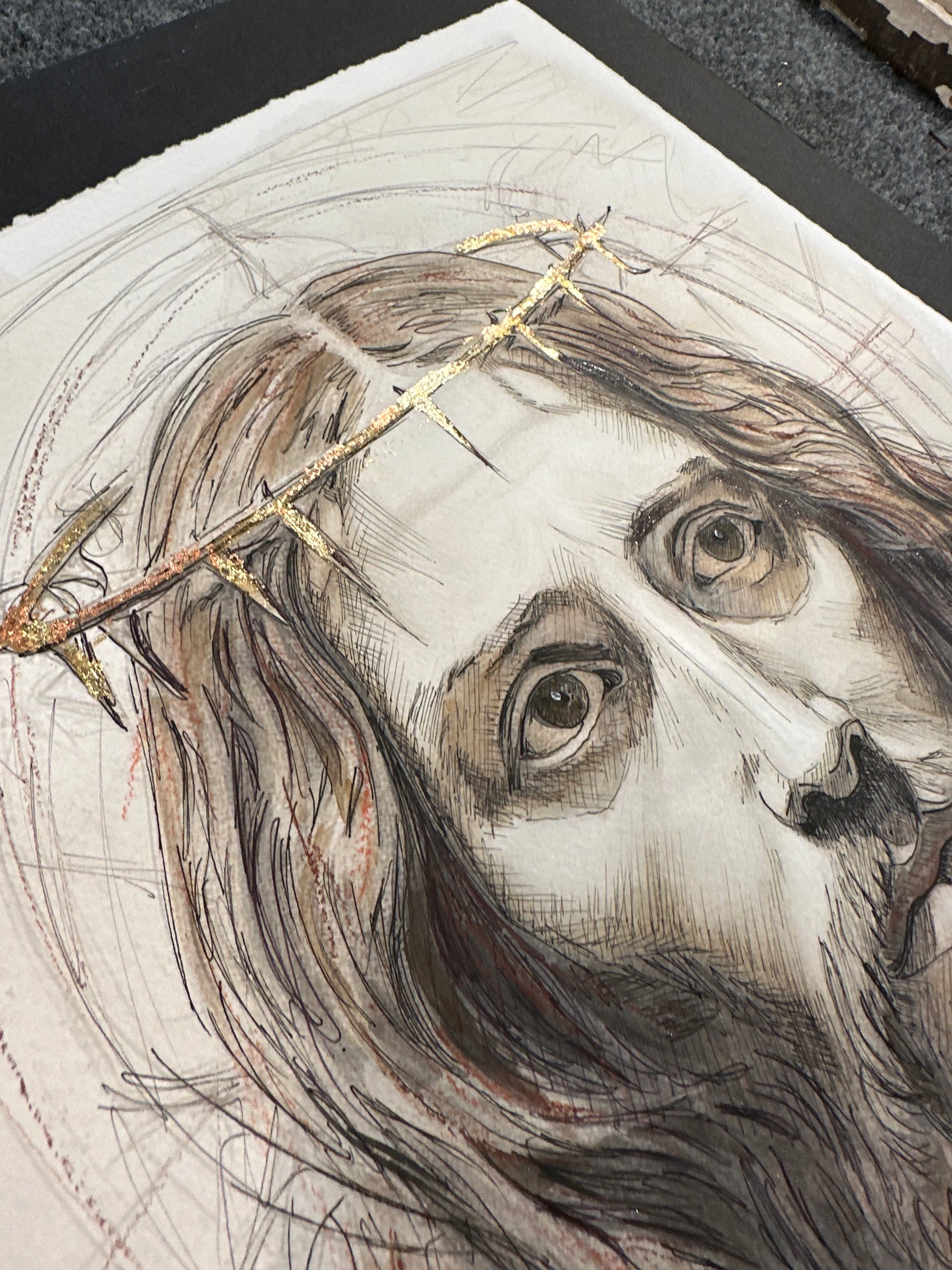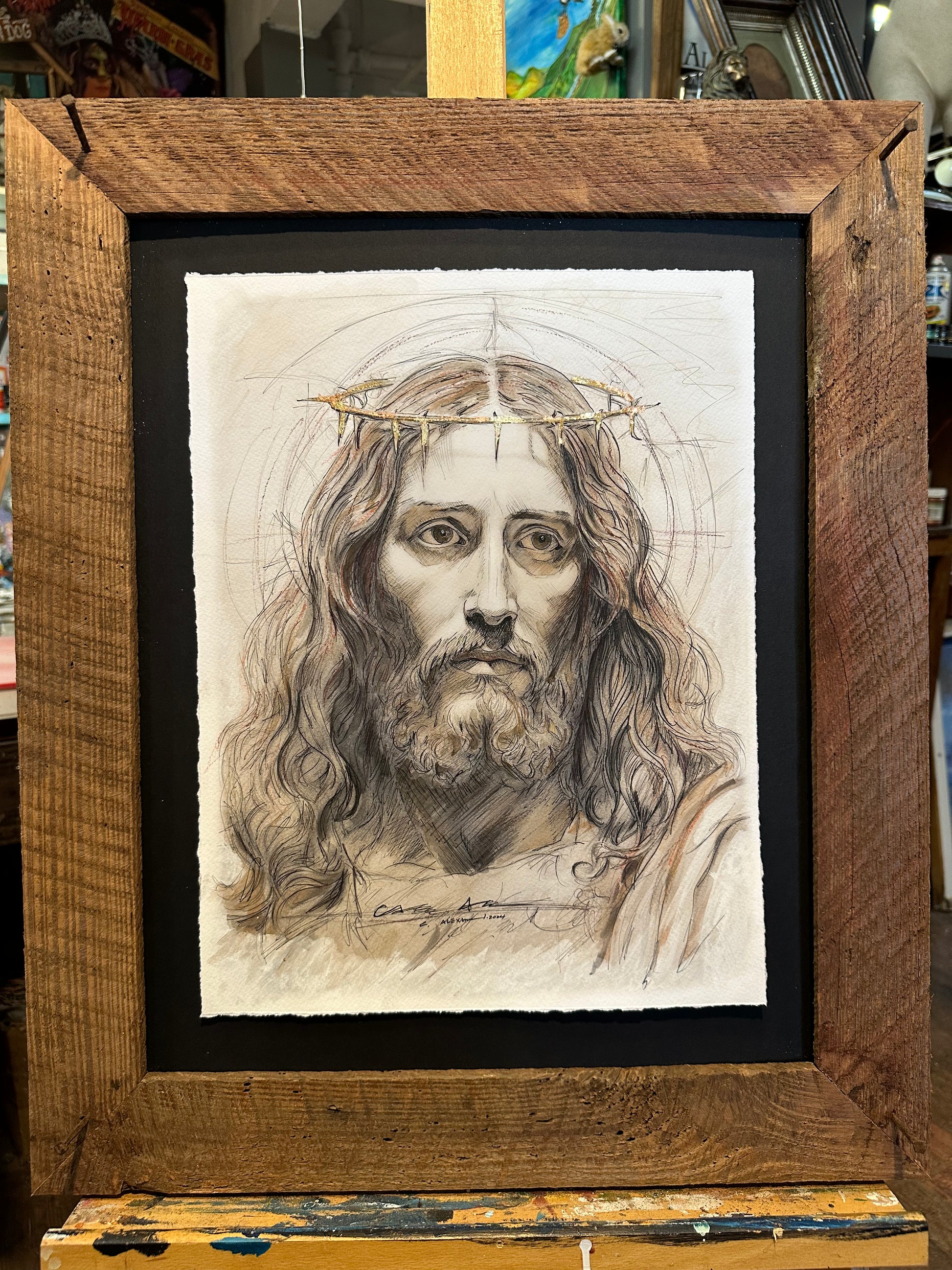 Jesus in watercolor, pencil, and pen. Using charcoal and graphite. Stained with Community Coffee.