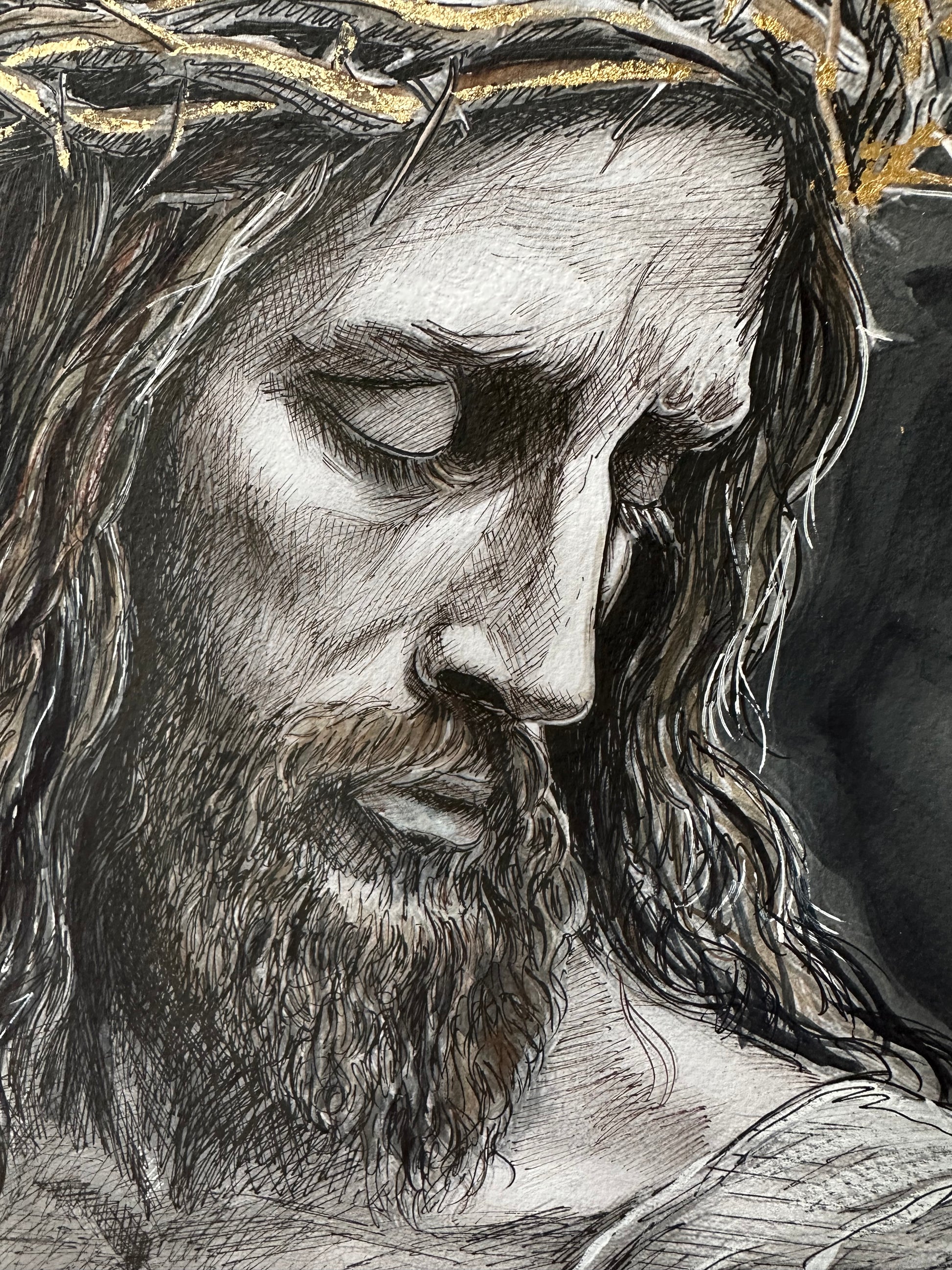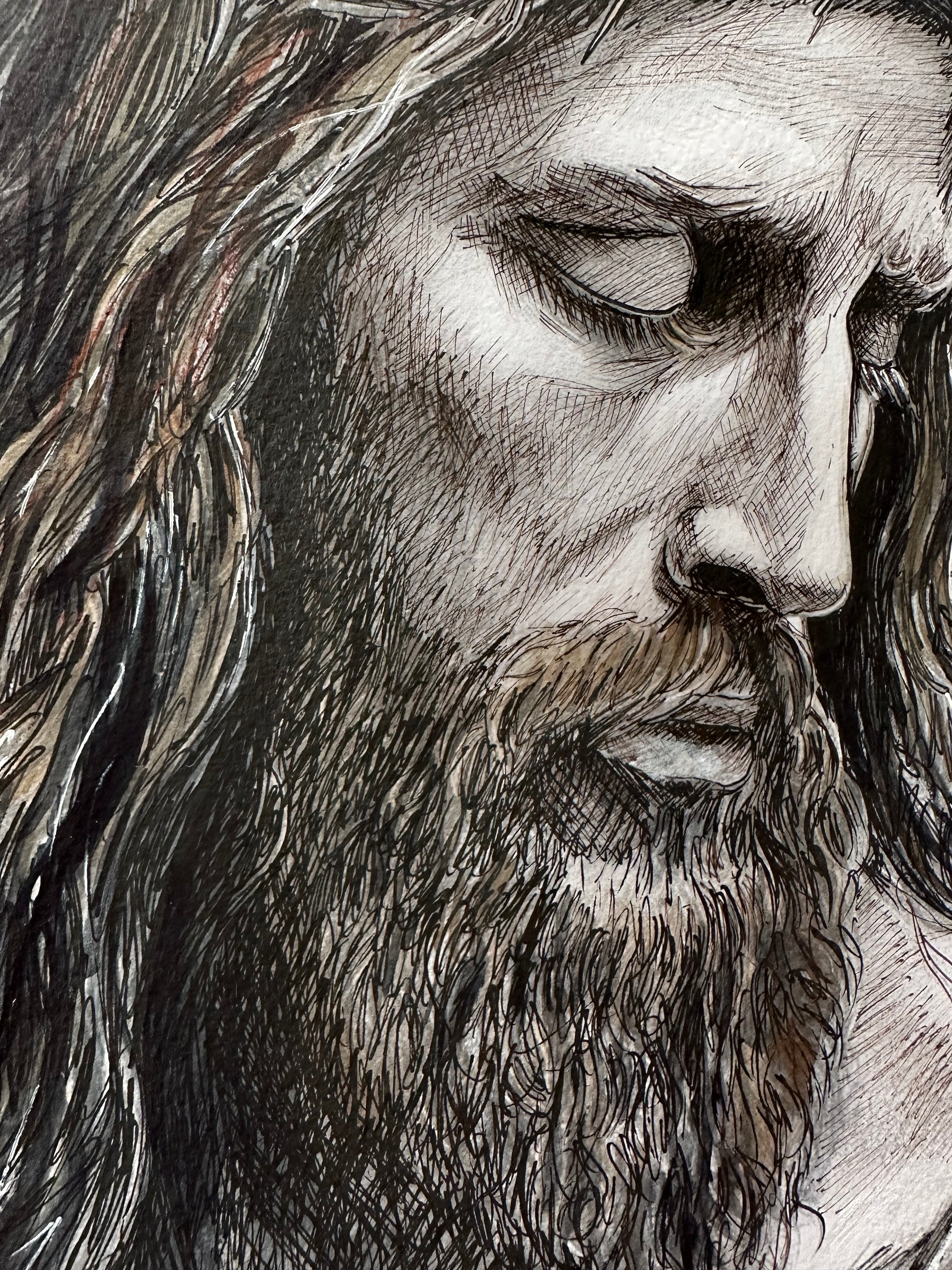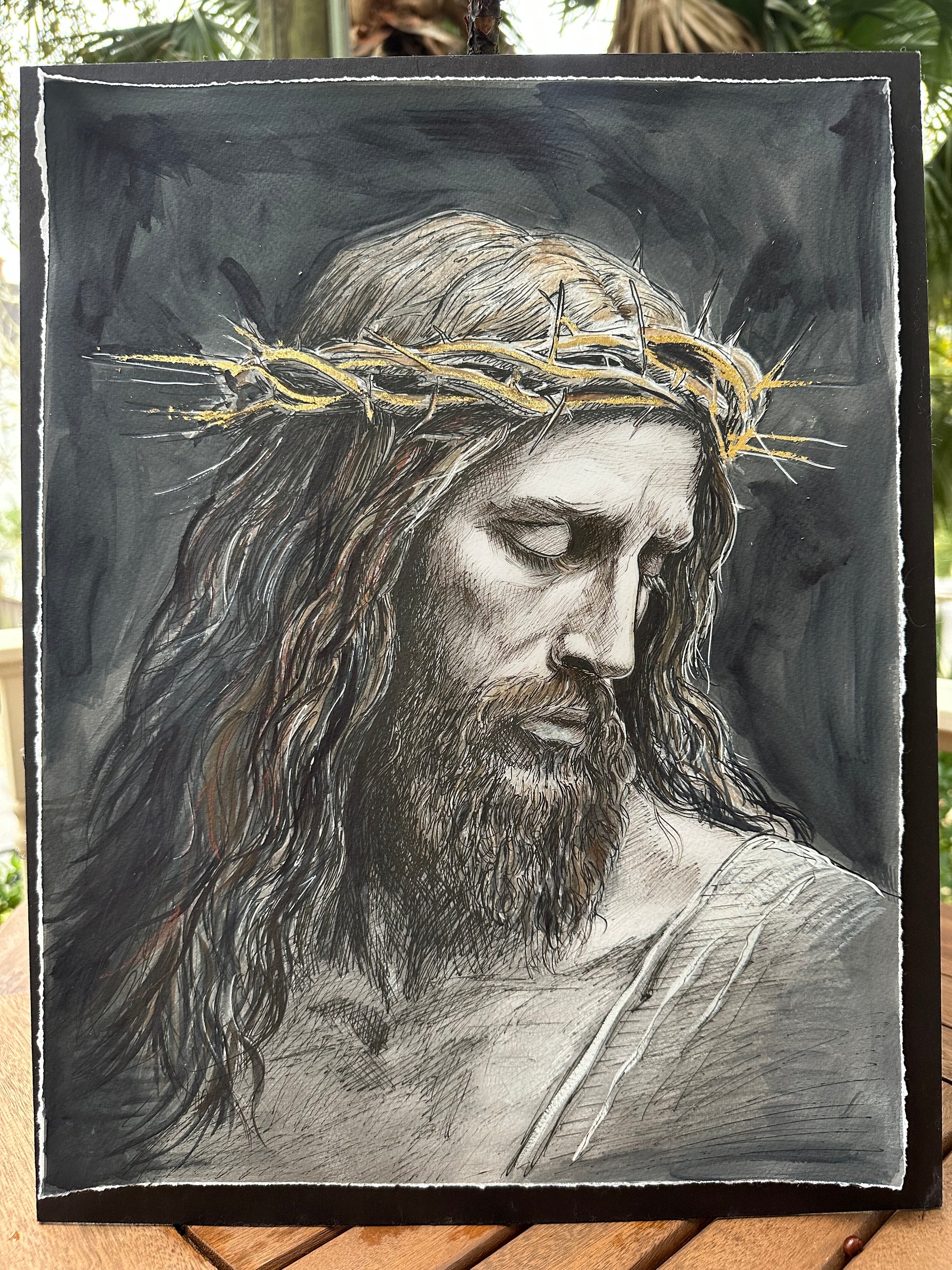 Jesus in watercolor, pencil, and pen. Using charcoal and graphite. Stained with Community Coffee.