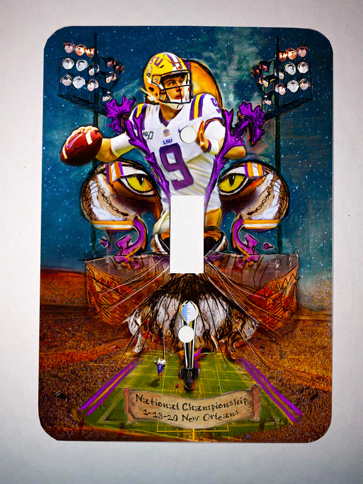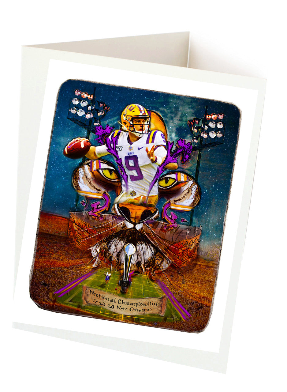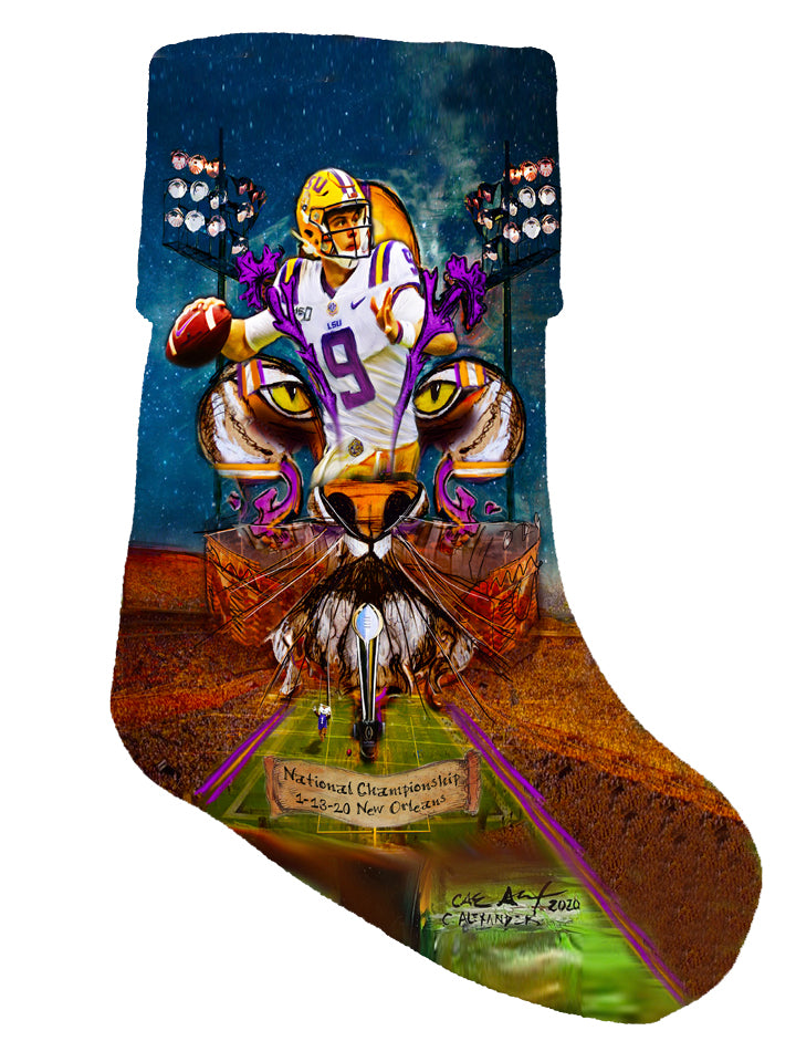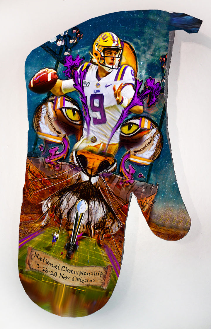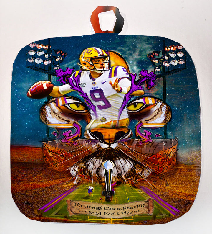"Joe Burrow" LSU Football quarterback painting was created to honor the outstanding athlete. Burrow was awarded the Heisman Trophy in 2019. Candice Alexander incorporated her famous Fleur De Lis design, the Bengal Stadium and her original Joe Burrow painting to make this one of a kind art piece.