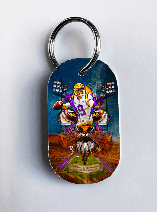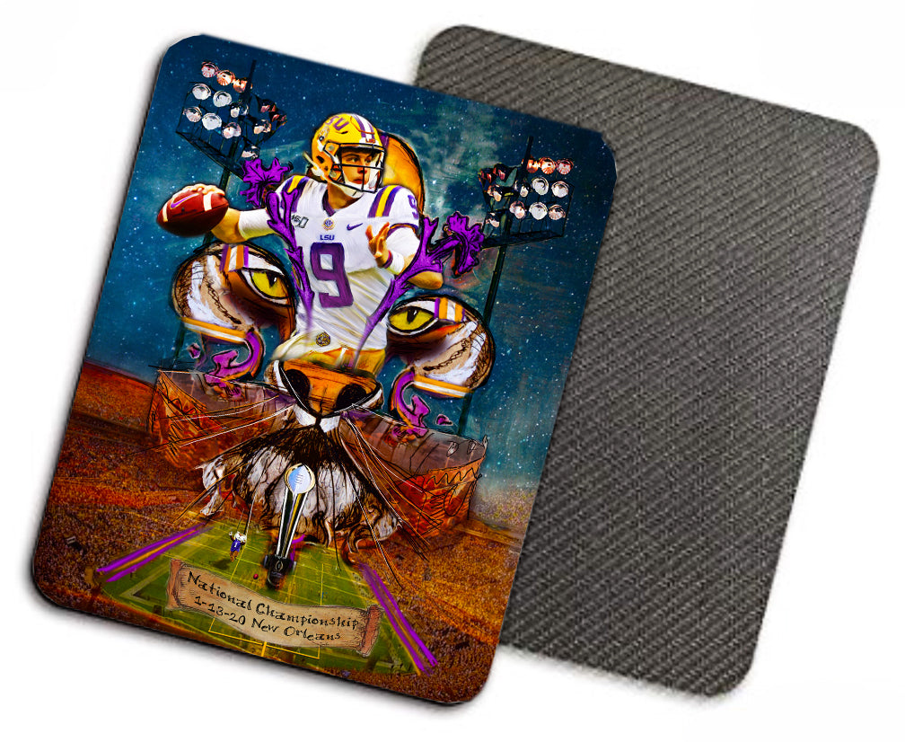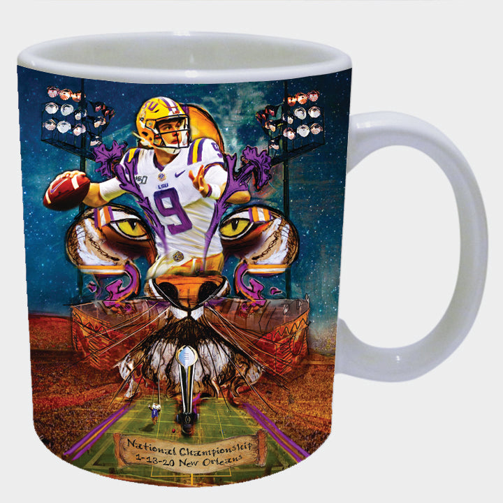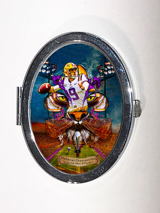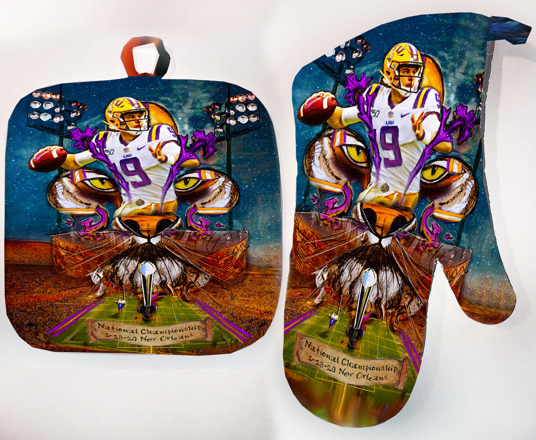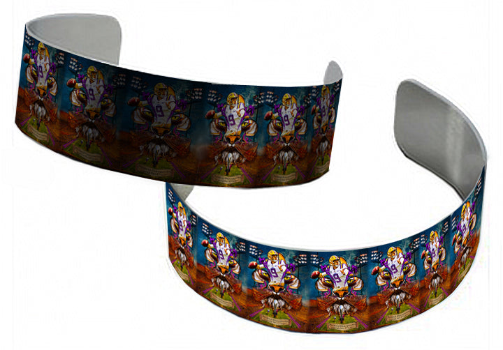 "Joe Burrow" LSU Football quarterback painting was created to honor the outstanding athlete. Burrow was awarded the Heisman Trophy in 2019. Candice Alexander incorporated her famous Fleur De Lis design, the Bengal Stadium and her original Joe Burrow painting to make this one of a kind art piece.