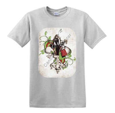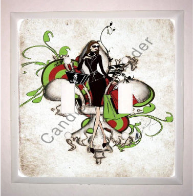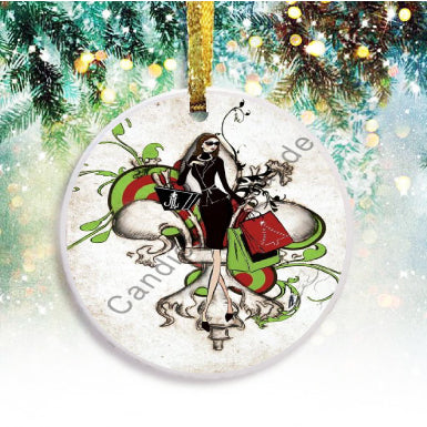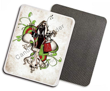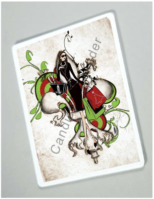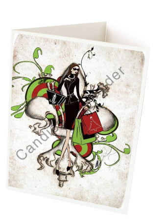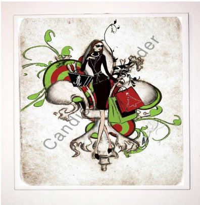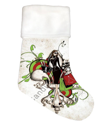 "Junior League Lafayette" is a Fleur De Lis resembling Tinsel & Treasures Holiday Market and displaying bright splashes of green and red holiday colors and a fashionista in black garb.