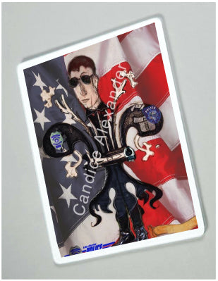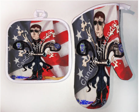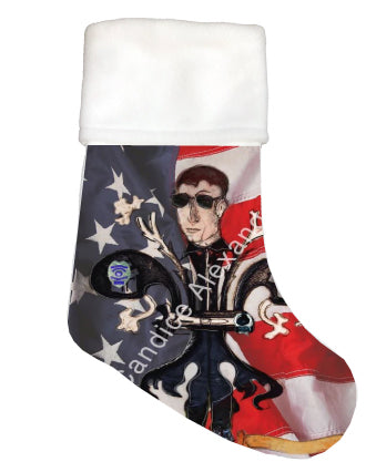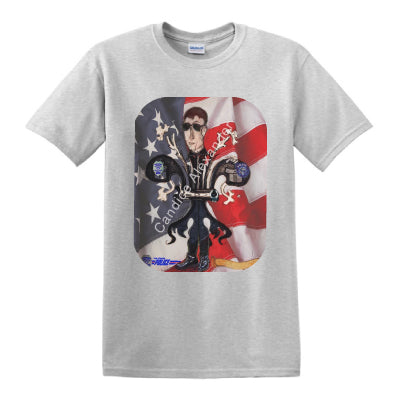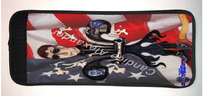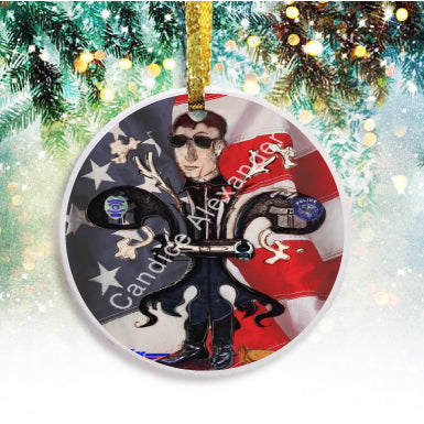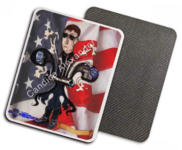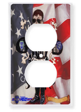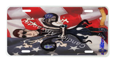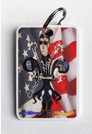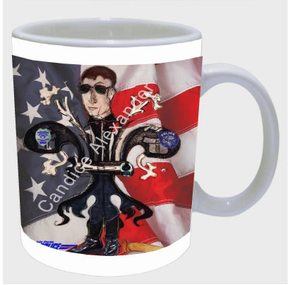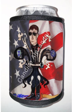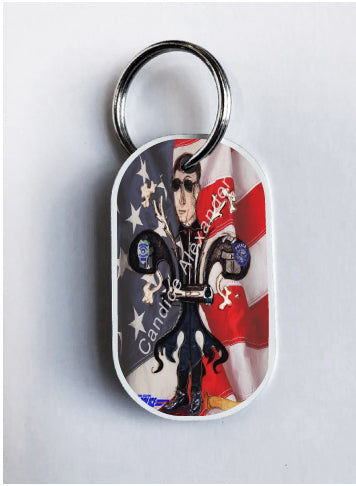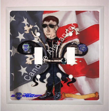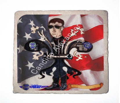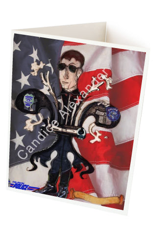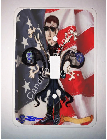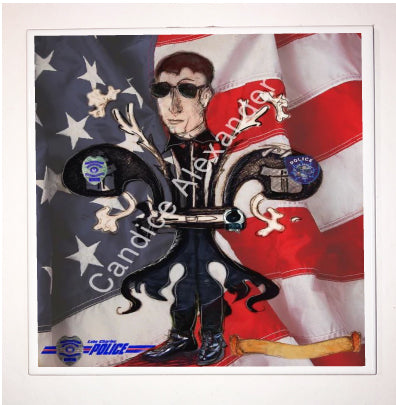 "Lake Charles Police" is a Fleur De Lis design by Candice Alexander honoring the Lake Charles Police Department with an America flag background and central officer fleur in full uniform.