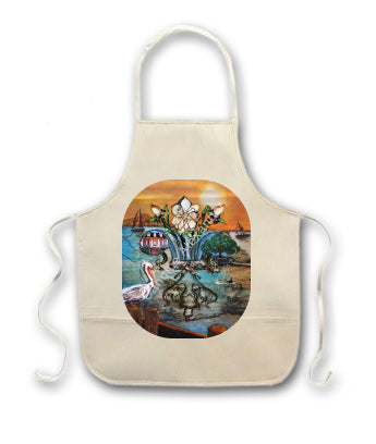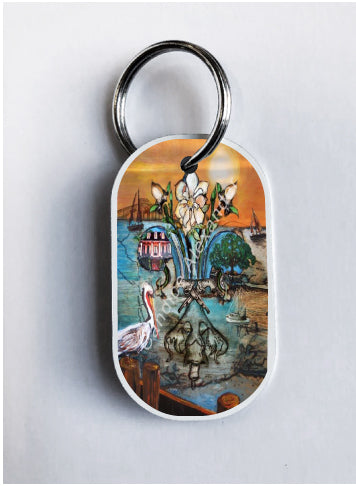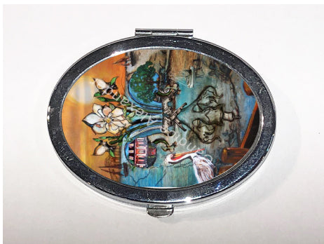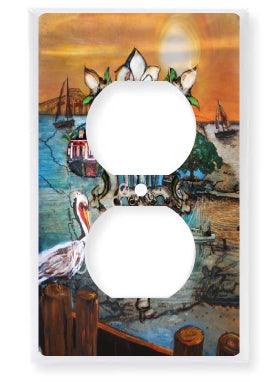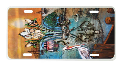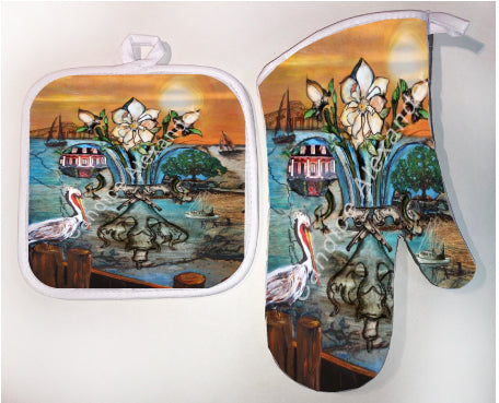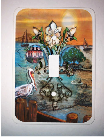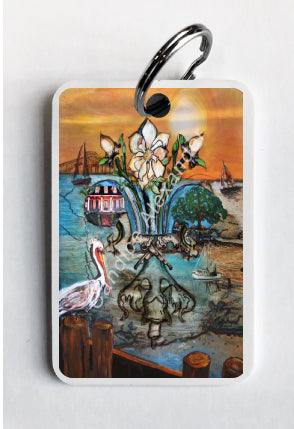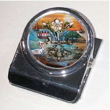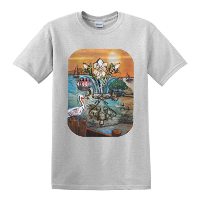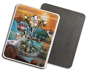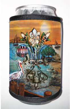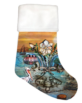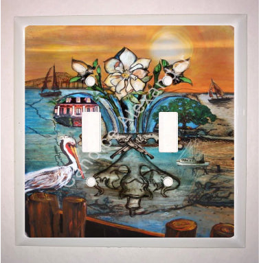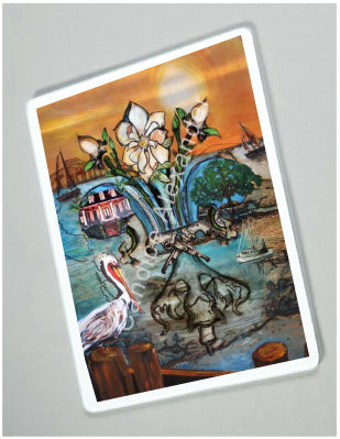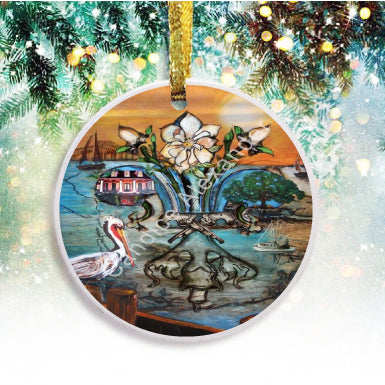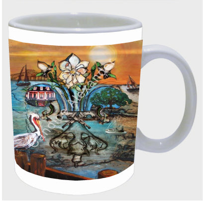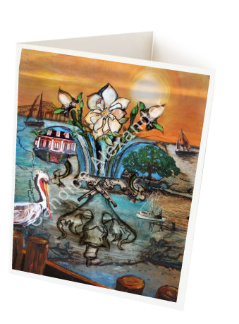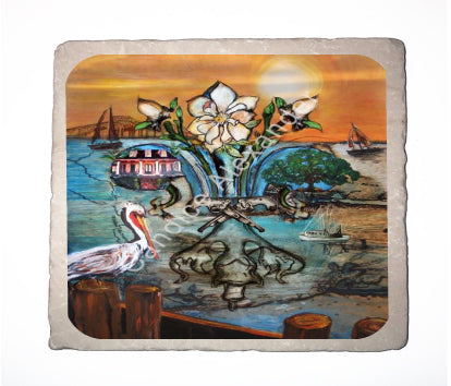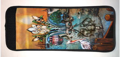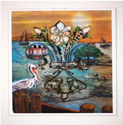 "Lake Charles Special" is a Fleur De Lis design by Candice Alexander representing the city in Louisiana with a sunset bayou landscape with a central fleur embellished with Louisiana flora and Jean Lafitte pistols.