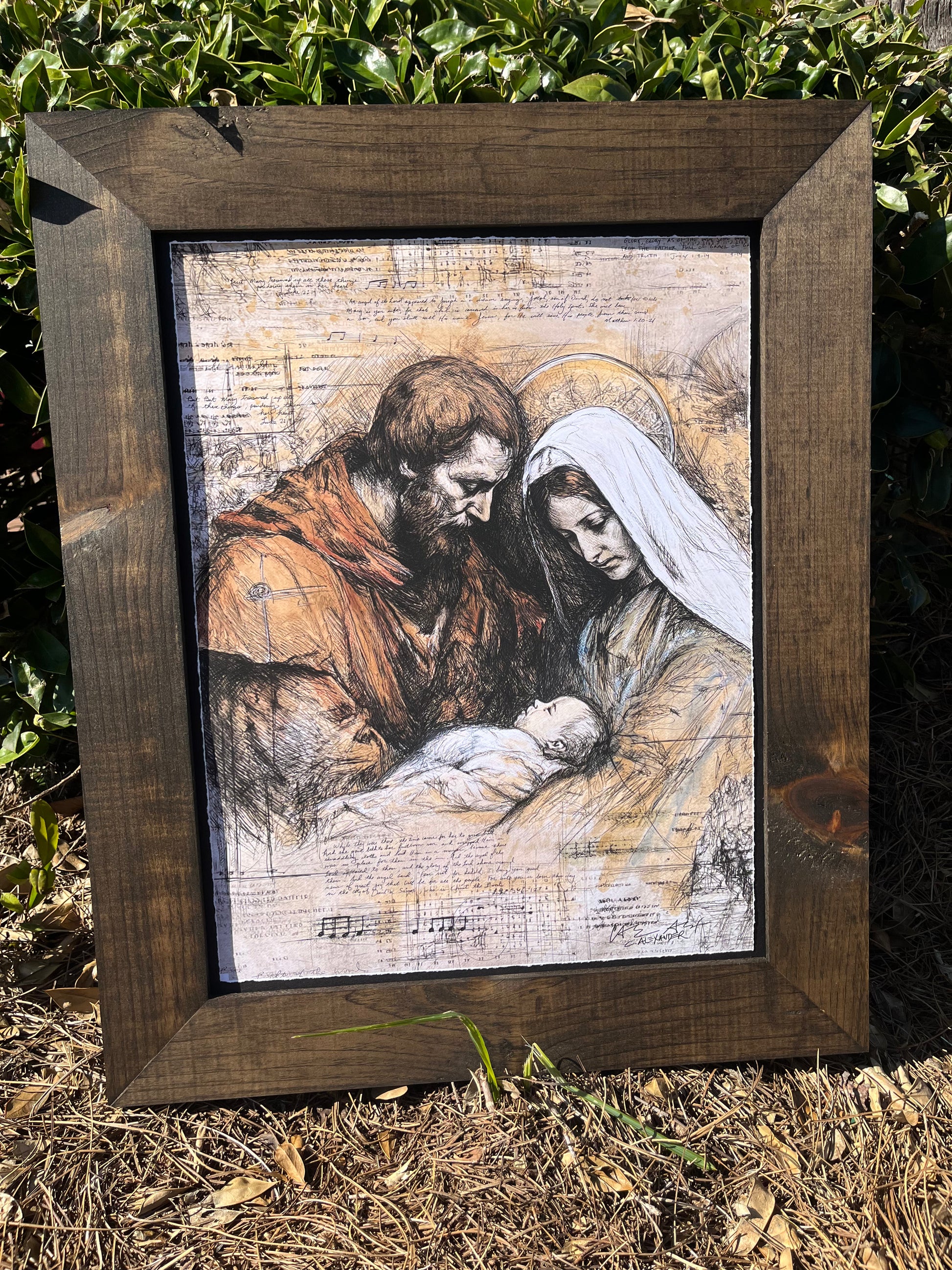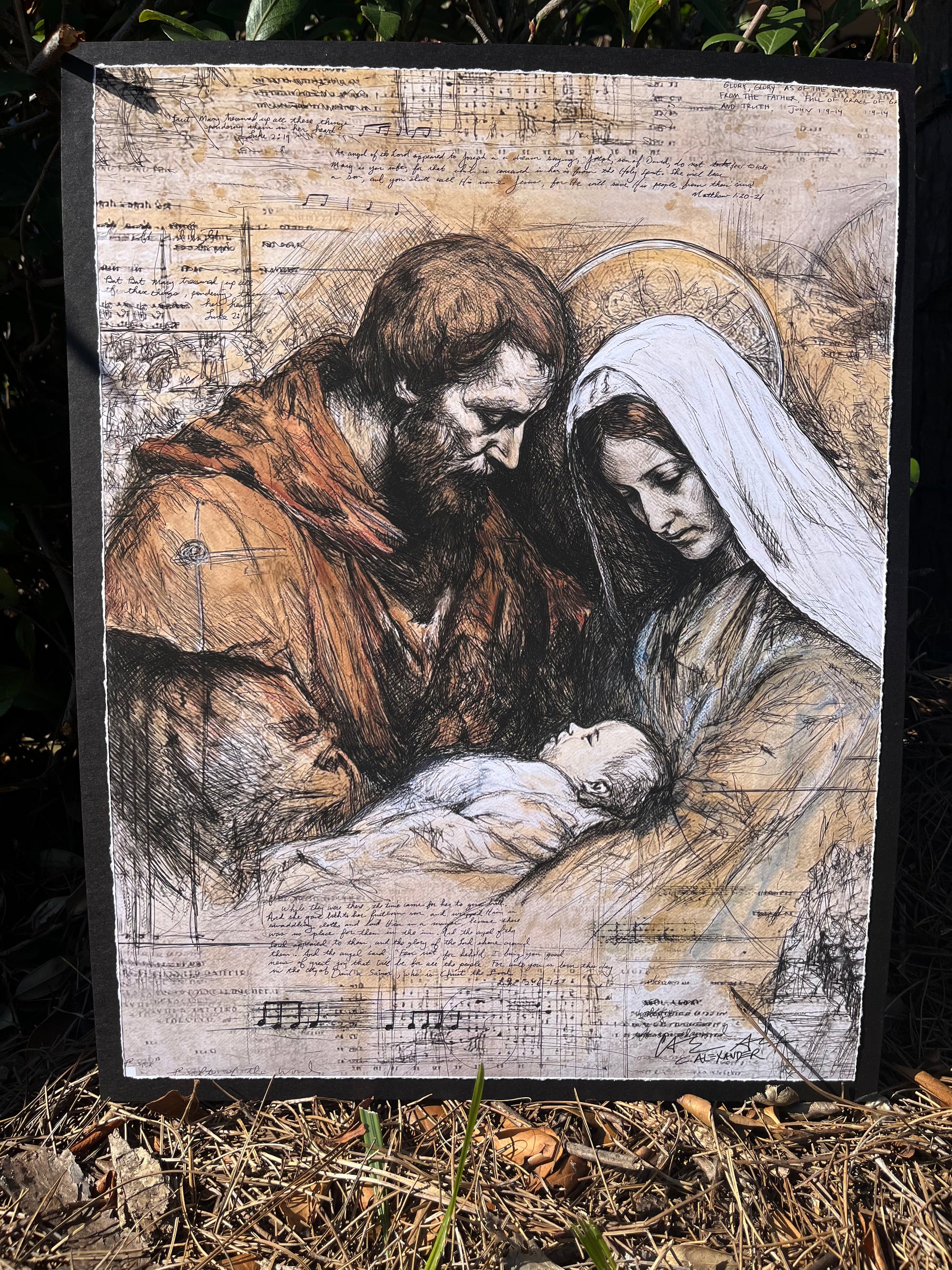 Mary and Joseph lean tenderly over the newborn Christ, capturing the stillness and wonder of the moment Heaven meets Earth. The sketch remains intentionally unfinished, with faint notes, diagrams, and architectural lines creating a layered, timeless feel.