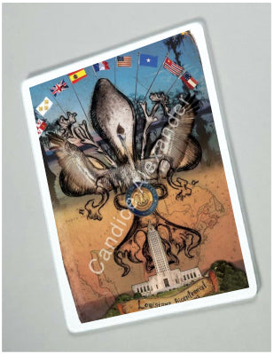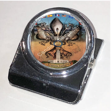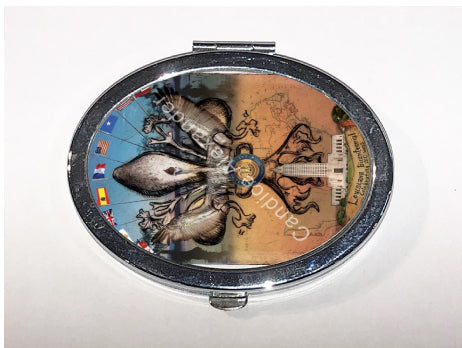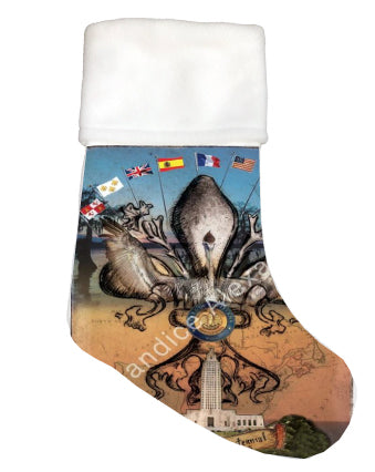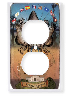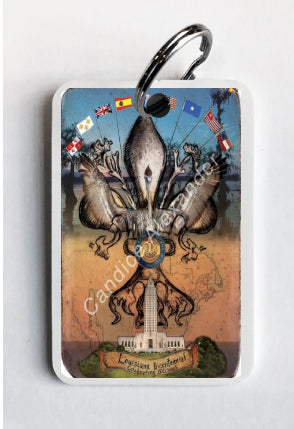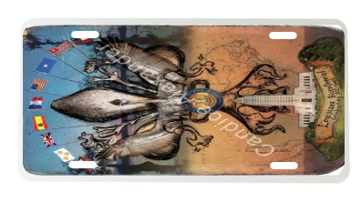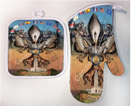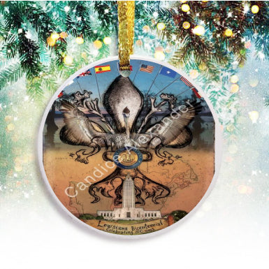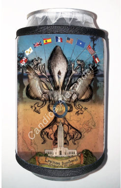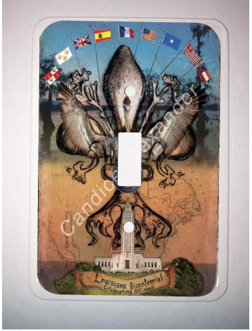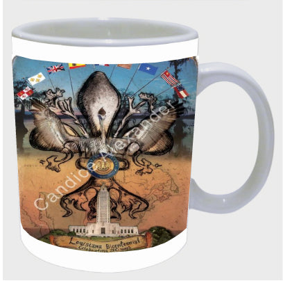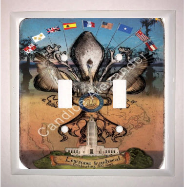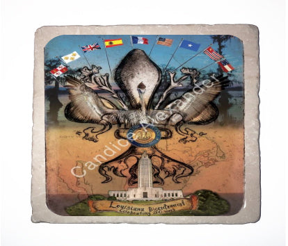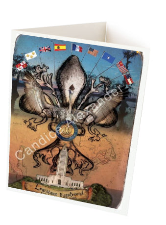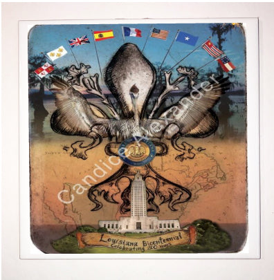 "Louisiana Bicentennial" is a Fleur De Lis design by Candice Alexander intended to honor and celebrate 200 years of statehood for Louisiana with a landscape background and map with a central fleur decorated with a bicentennial coin and numerous flags.