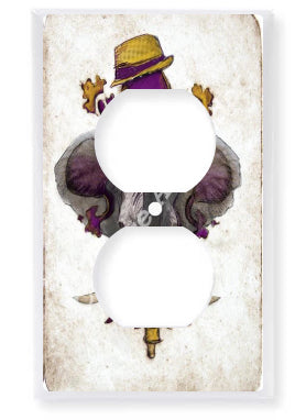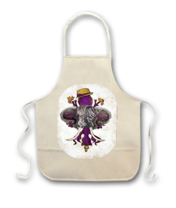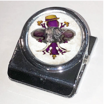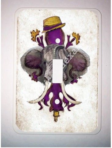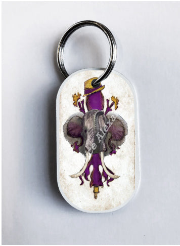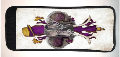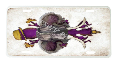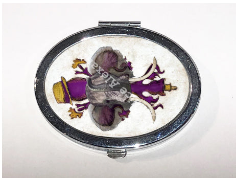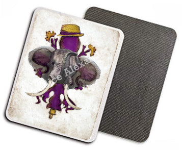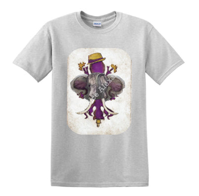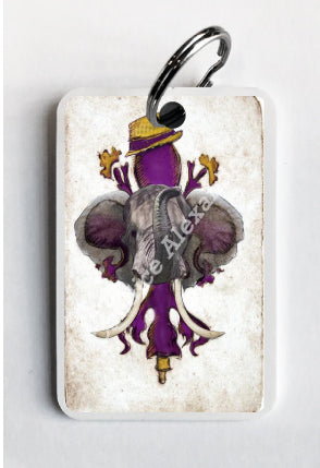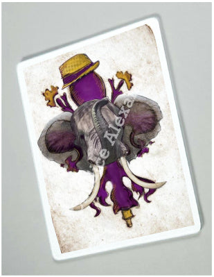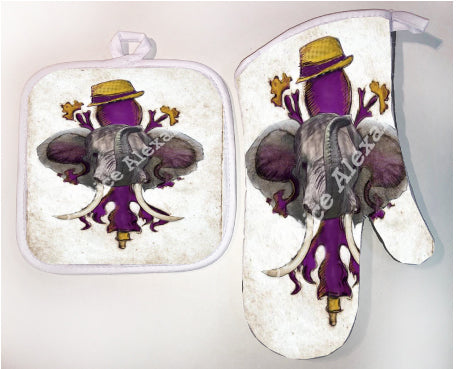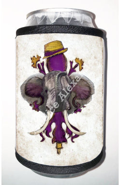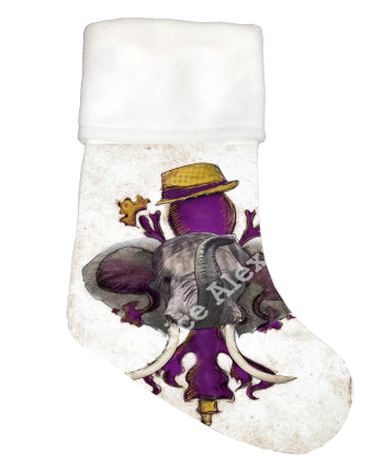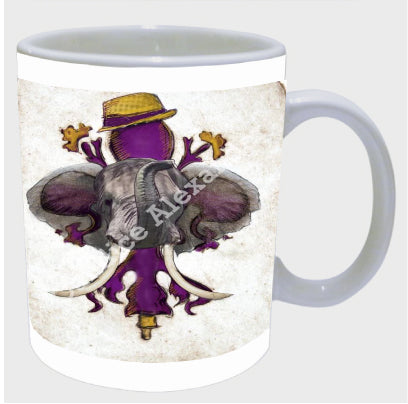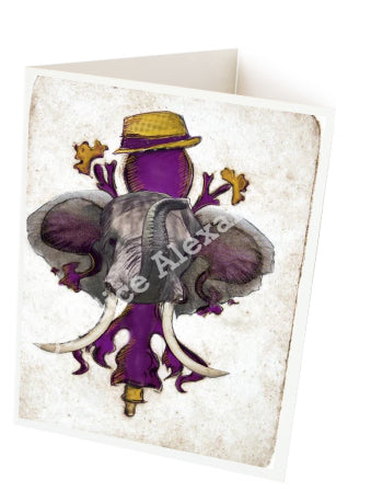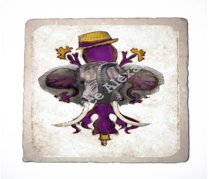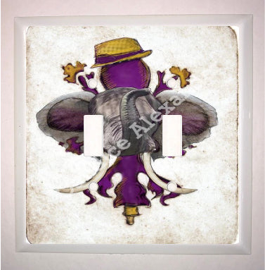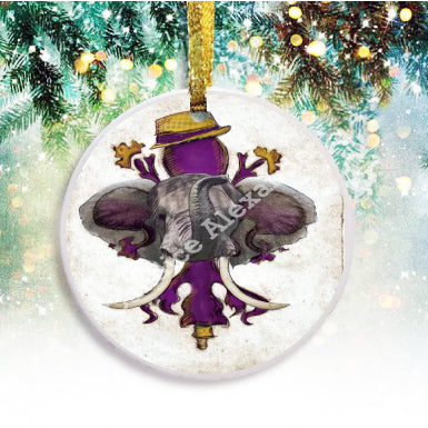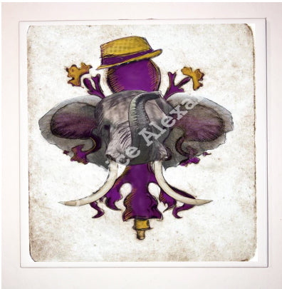 "LSU Crimson" is a fleur de lis design by Candice Alexander for households that cheer for both Alabama and the LSU Tigers; it features a neutral background with a central purple fleur with gold accents and fedora laid over with an elephant with raised trunk.