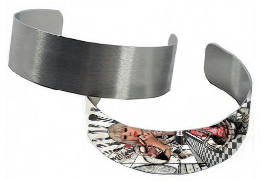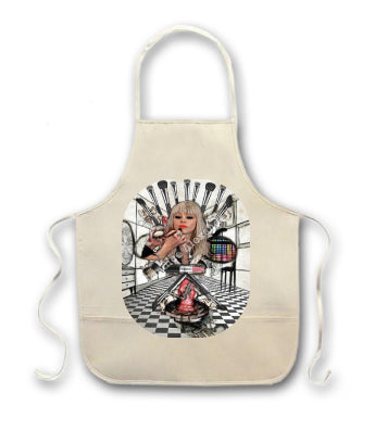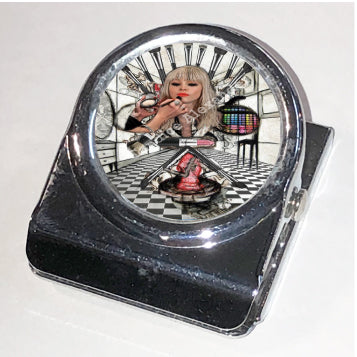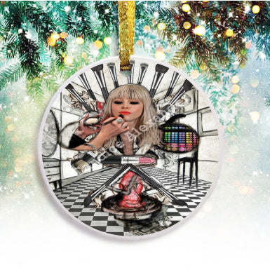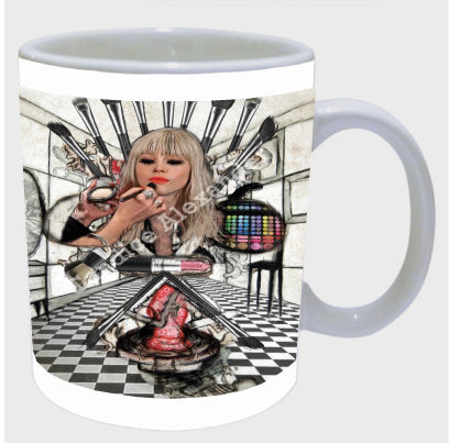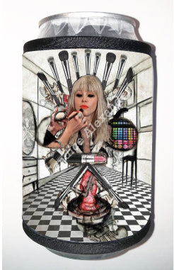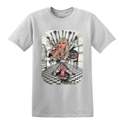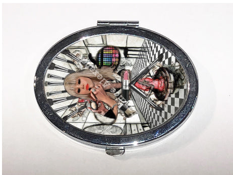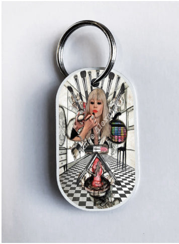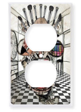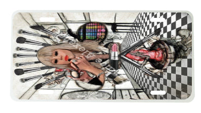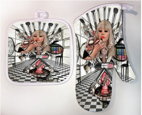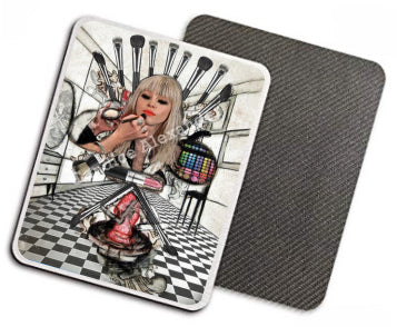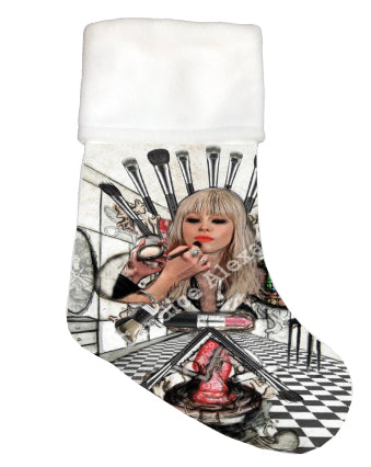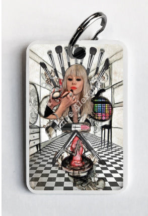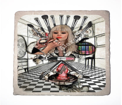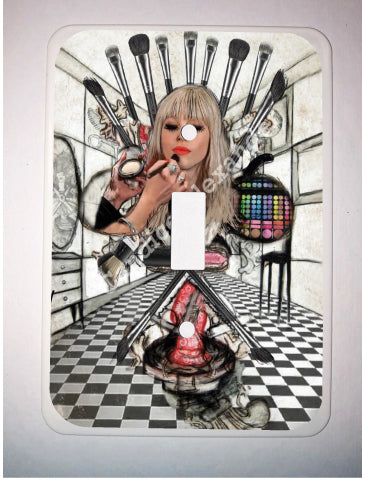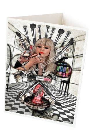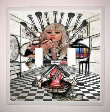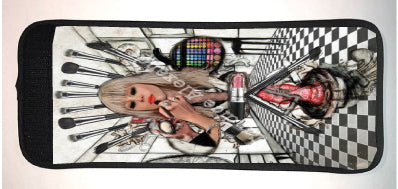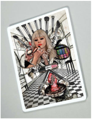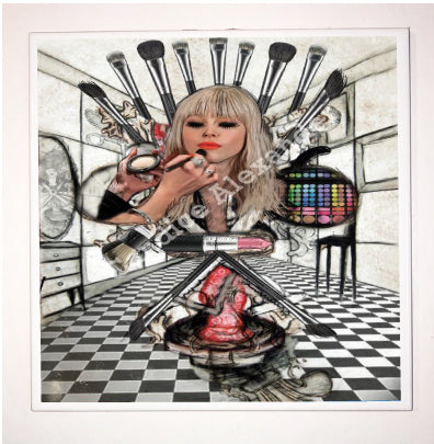 "Make up Artist" is a fleur de lis design by Candice Alexander that features a black and white studio background with a central fleur decorated with makeup products and a face being made up by an artist.