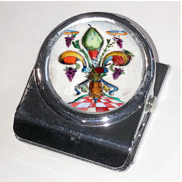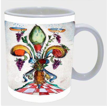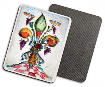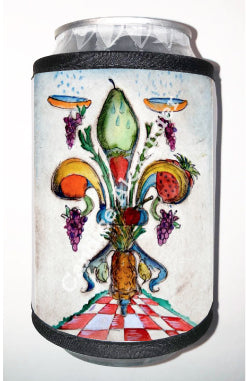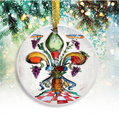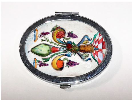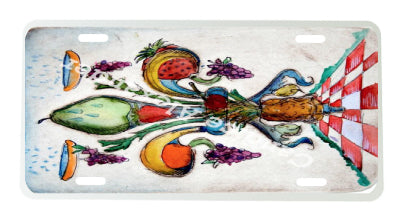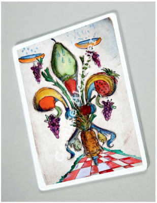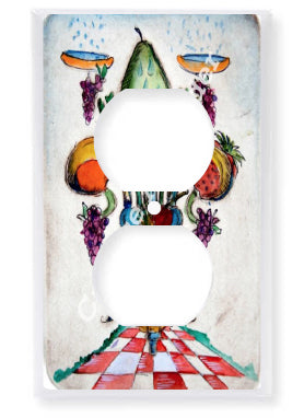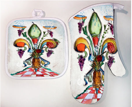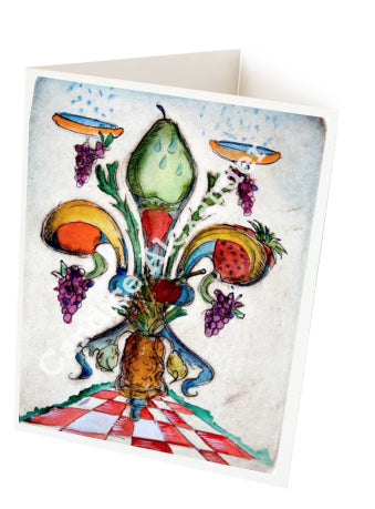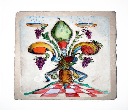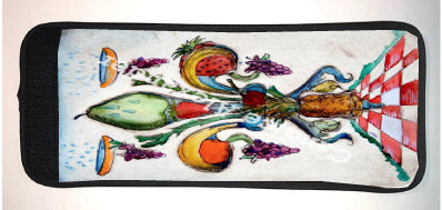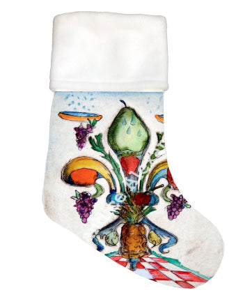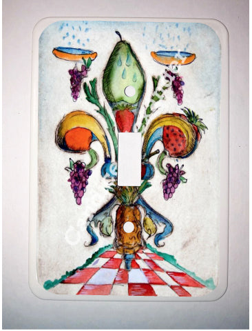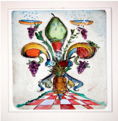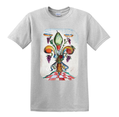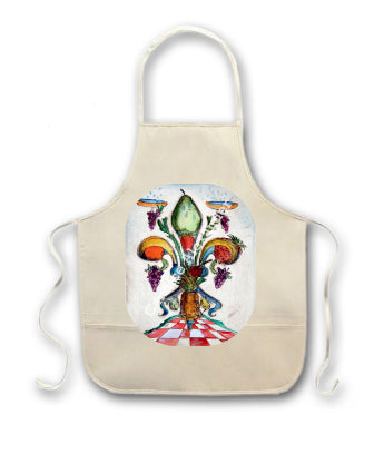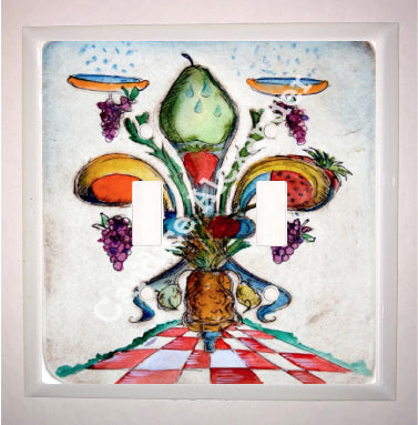 "Market" is a Fleur De Lis design by Candice Alexander displaying a variety of fruits on a central fleur with a neutral background with red and white checkered picnic blanket below.