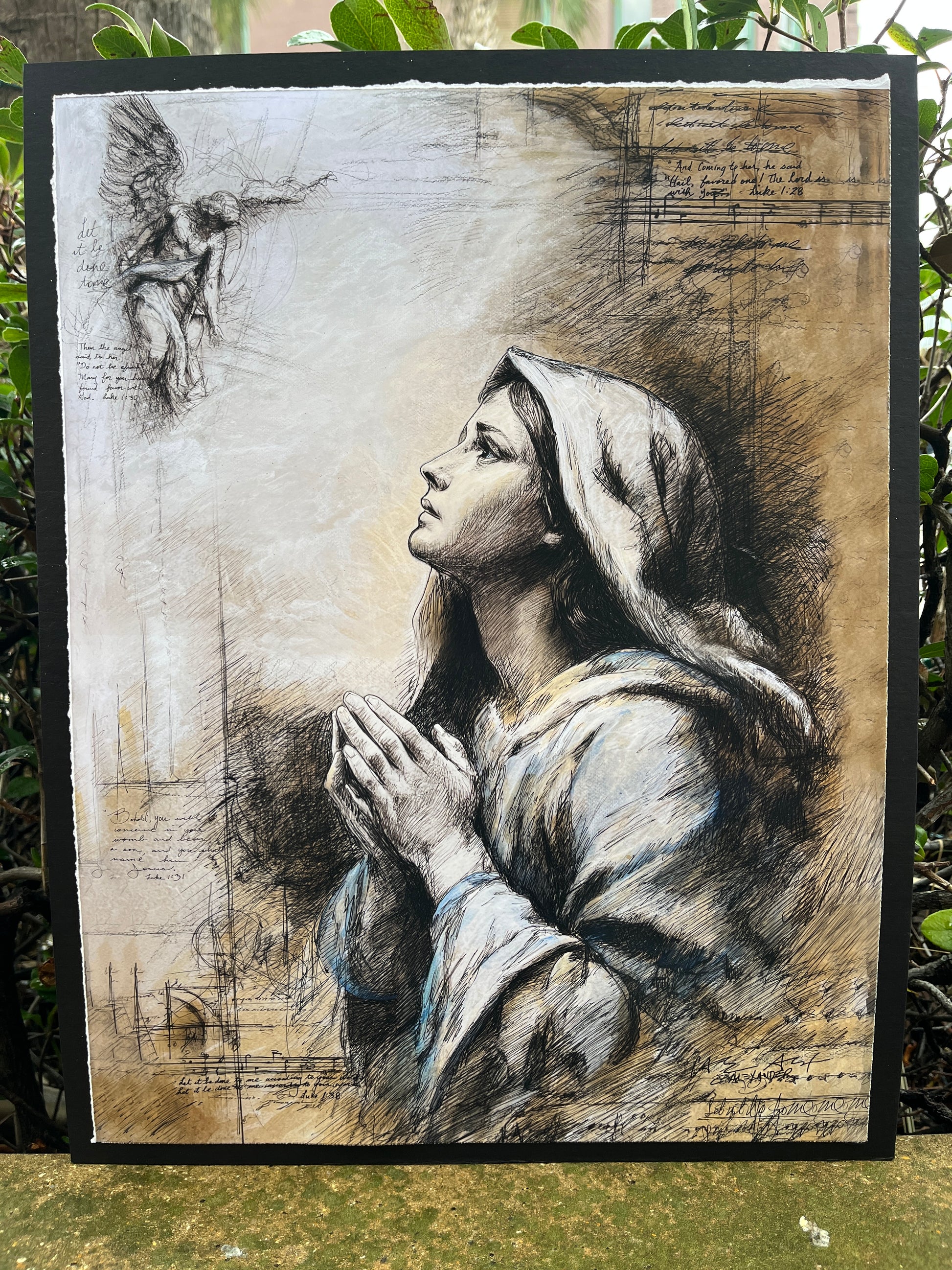 This artwork captures the sacred moment of Mary’s fiat—her quiet, world-altering “yes” to God. In stillness and humility, Mary receives the angel’s message not with fear, but with trust, surrender, and profound courage. Her posture and expression reflect a heart fully open to the divine will, embodying the words that echo through history: “Let it be to me according to Your word.”