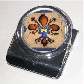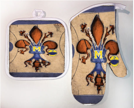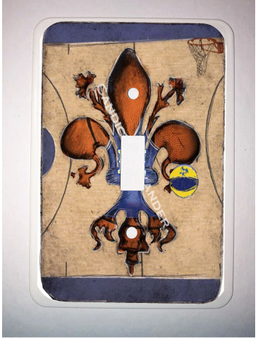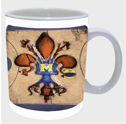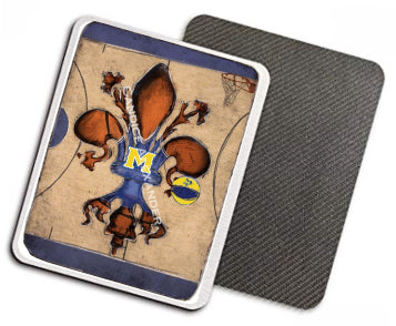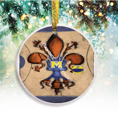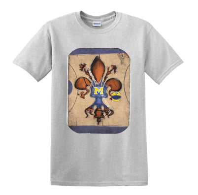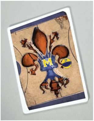 "McNeese Baseball" is a fleur de lis design by Candice Alexander that features a baseball diamond behind a fleur de lis in McNeese baseball garb sporting a bat, ball, and glove.