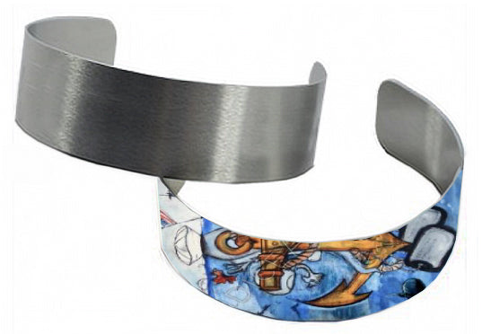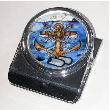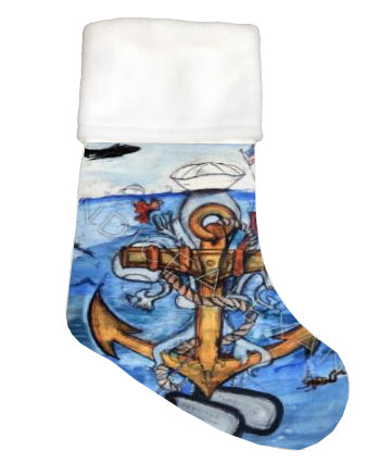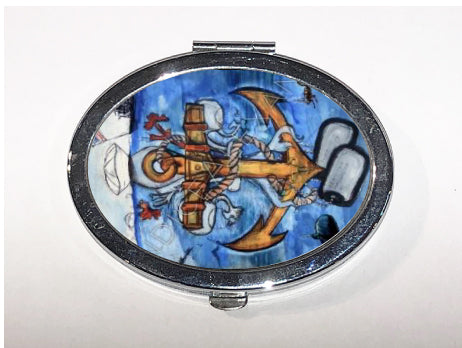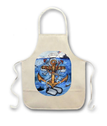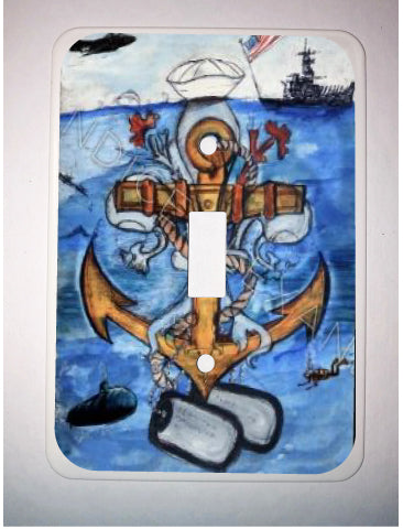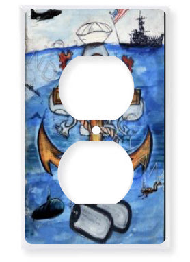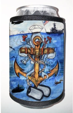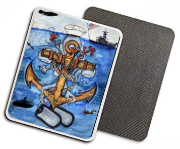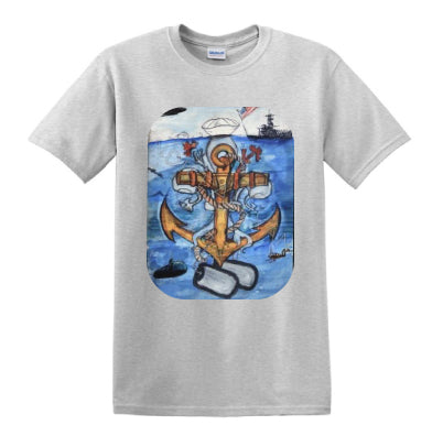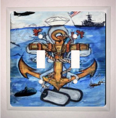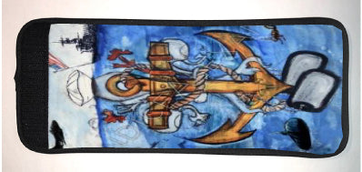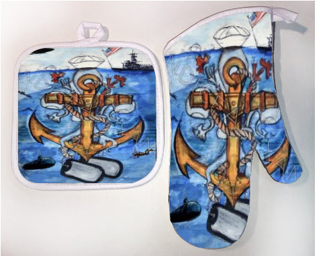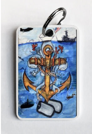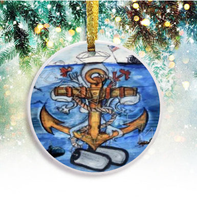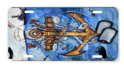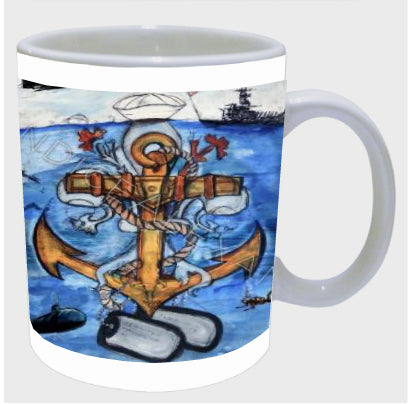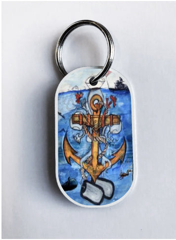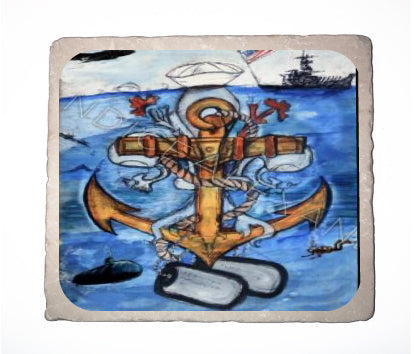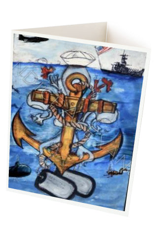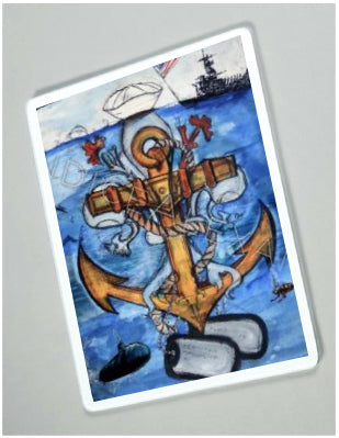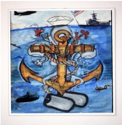 "Navy" is a fleur de lis design by Candice Alexander that features a background of water with a ship and plane on the horizon line and a central fleur de lis overlaid with an anchor and dog tags.