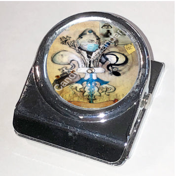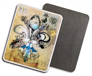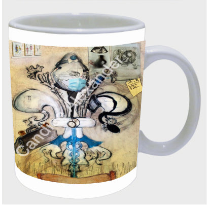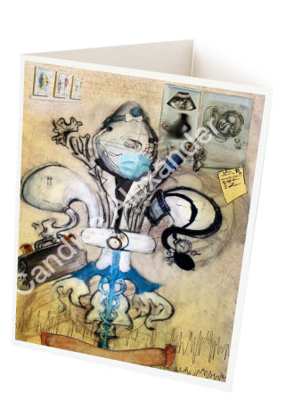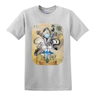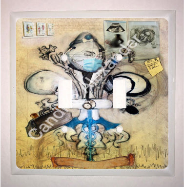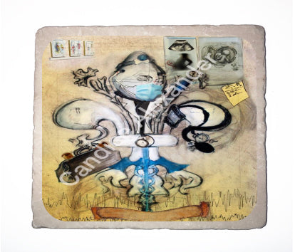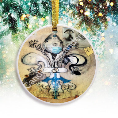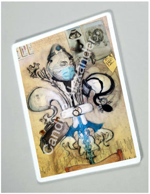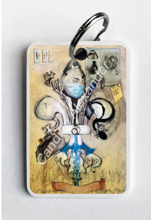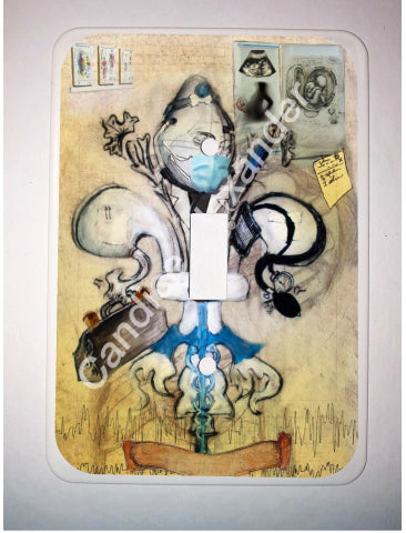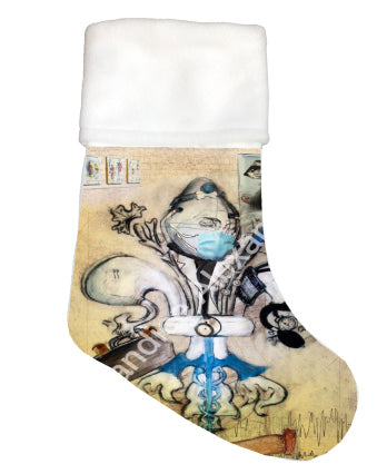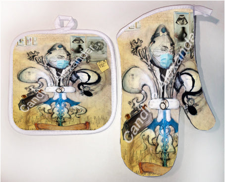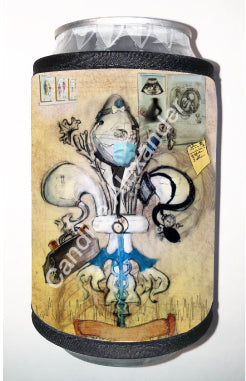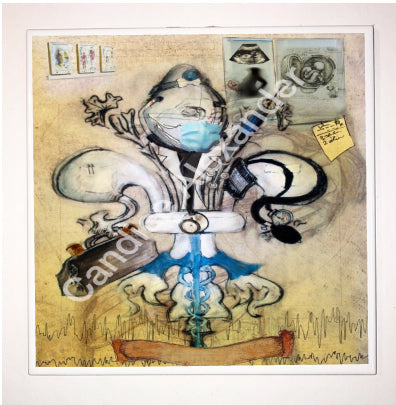 "OBGYN" is a fleur de lis design by Candice Alexander created to honor the medical professionals in the OBGYN discipline and does so with a central stork carrying a patched satchel with an infant aboard and accompanied by instruments of the profession.