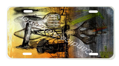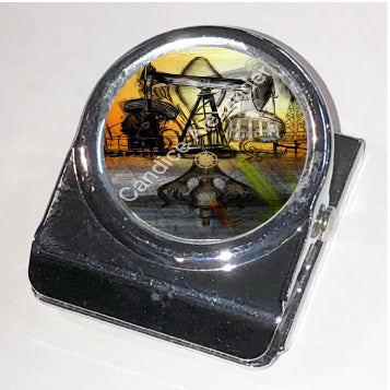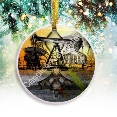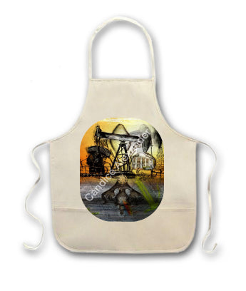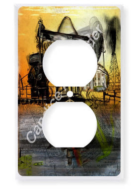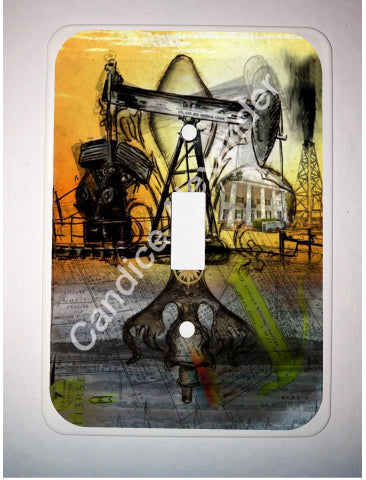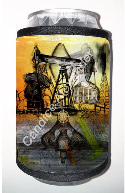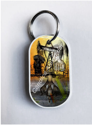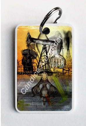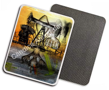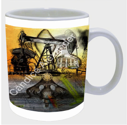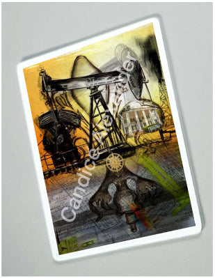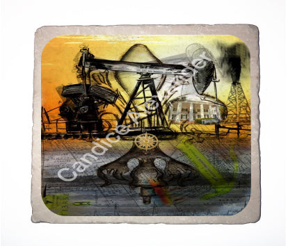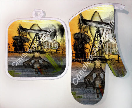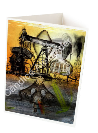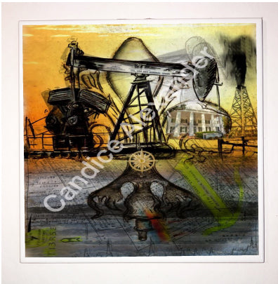 "Oil Well Two" is a Fleur De Lis design by Candice Alexander that captures the intensity of drilling and oilfield work with a bright colored background and bold lines in the wells and fleur.