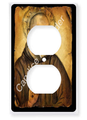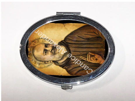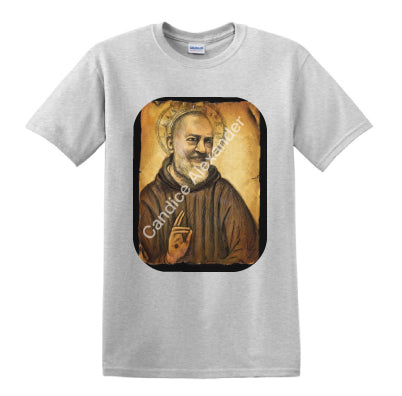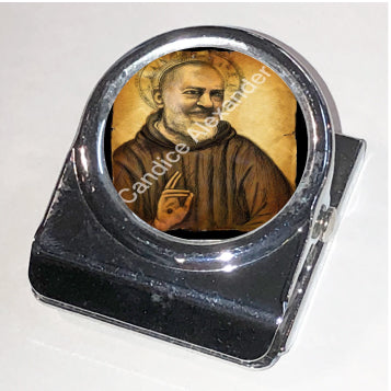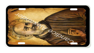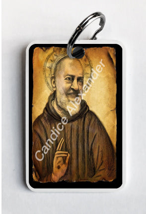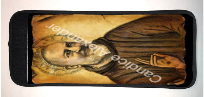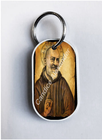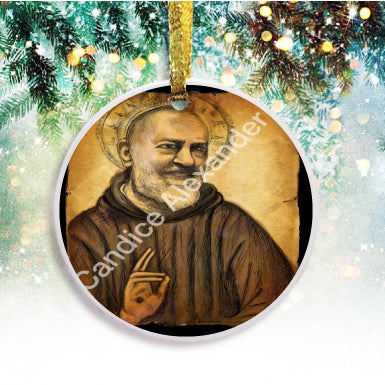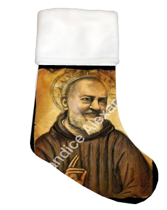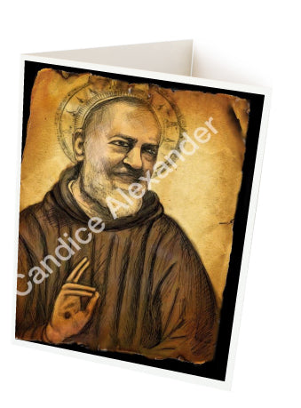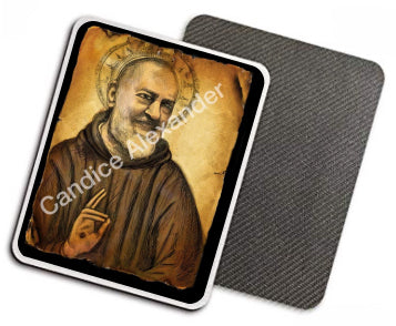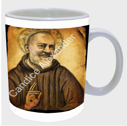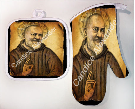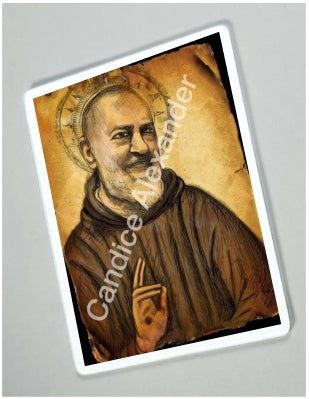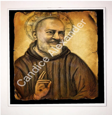 "Padre Pio" is a design by Candice Alexander to honor the saint Padre Pio and does so using bright colors and classic styling to give this piece a stained glass old world cathedral feel.