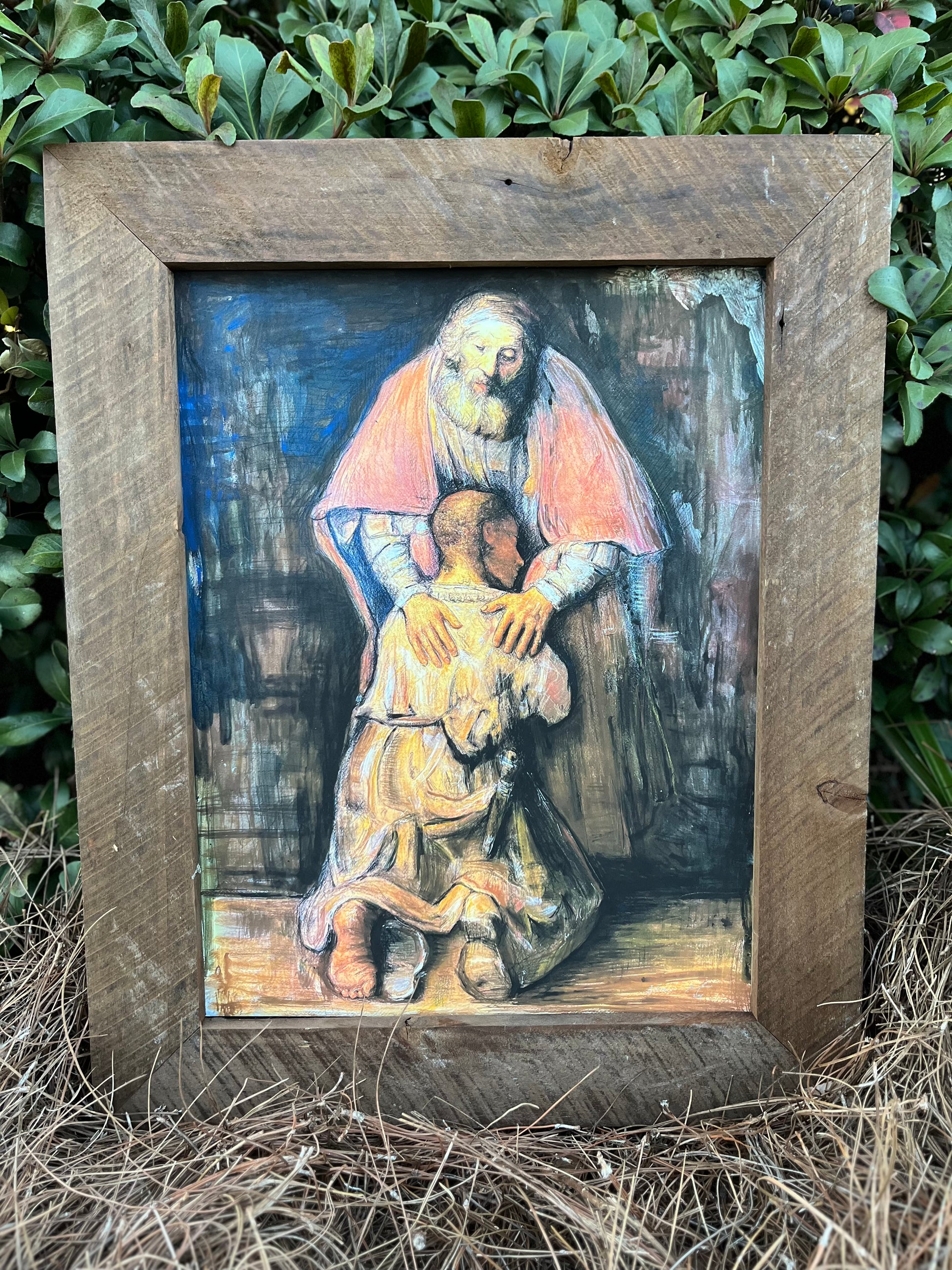 This evocative artwork brings to life the powerful parable of The Prodigal Son from the Bible (Luke 15:11-32). It captures the transformative moment when the wayward son, humbled and repentant, is embraced by his father in an act of unconditional love and forgiveness. The composition conveys raw emotion through tender expressions, dynamic movement, and a sense of hope that resonates deeply with viewers.
