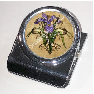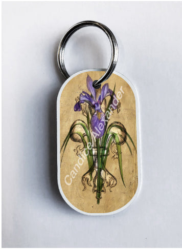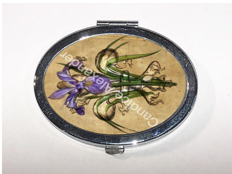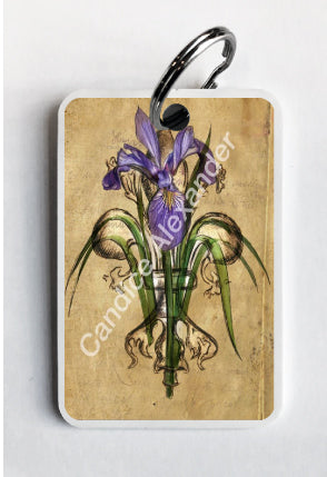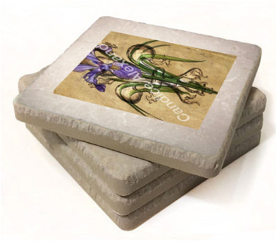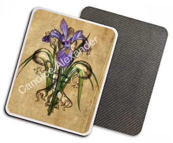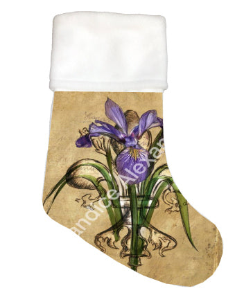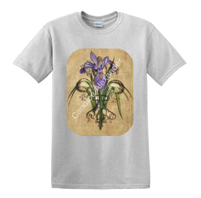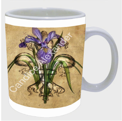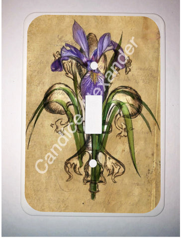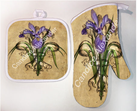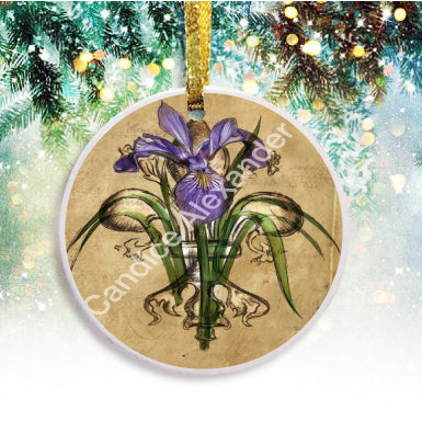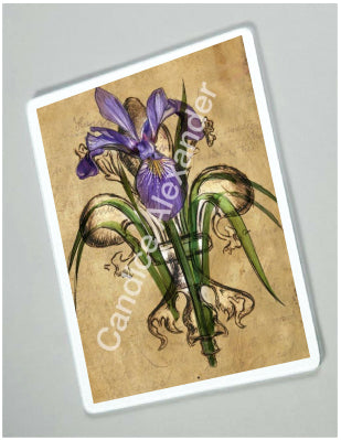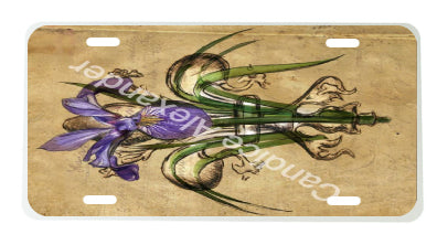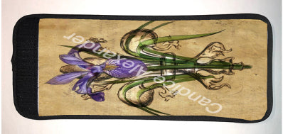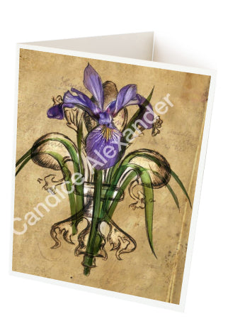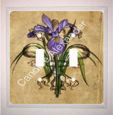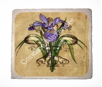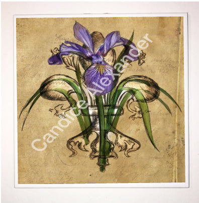 "Purple Iris" is a Fleur De Lis design by Candice Alexander that depicts the beauty of nature with its graceful greenery and vibrant petal colors upon a central fleur centered on neutral background.