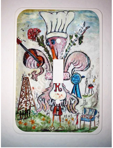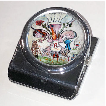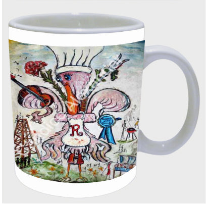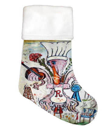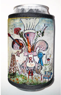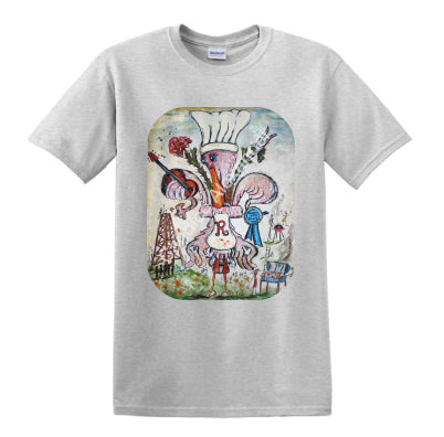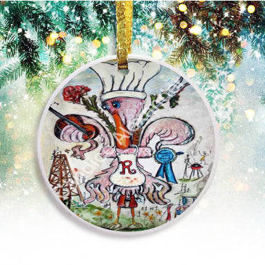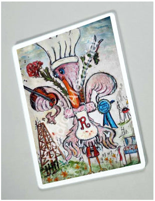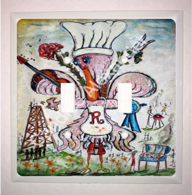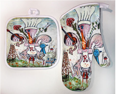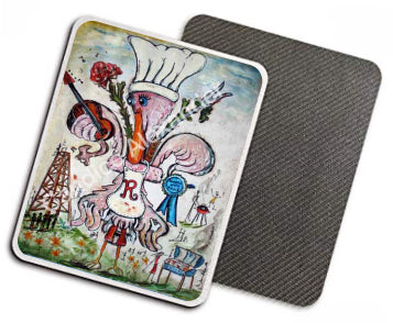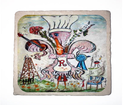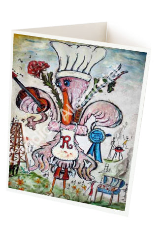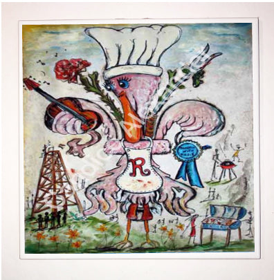 "Roastin’ with Rosie 1" is a Fleur De Lis design by Candice Alexander representing the Roastin’ with Rosie BBQ Festival in Jennings, Louisiana with a festival landscape background with a central pink pelican fleur embellished with cooking and festival imagery.