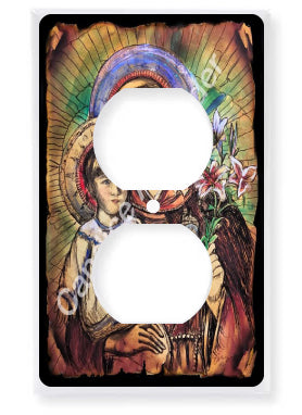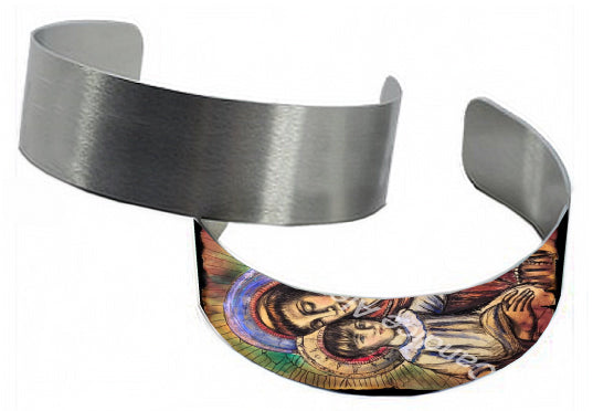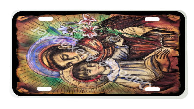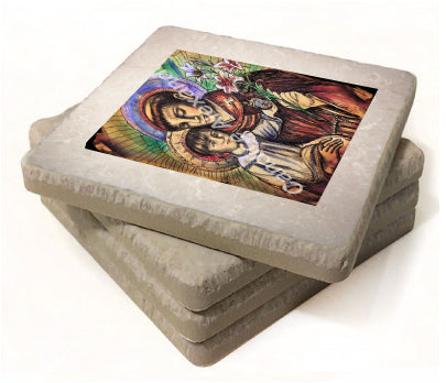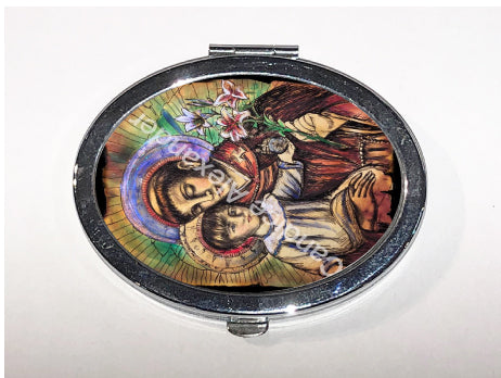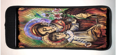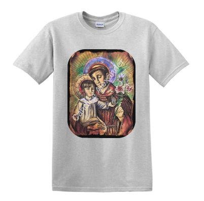 "Saint Anthony" is a design by Candice Alexander featuring St. Anthony and a small boy that utilizes muted colors and dark lines to give an old world classic feel.