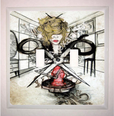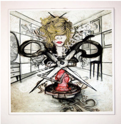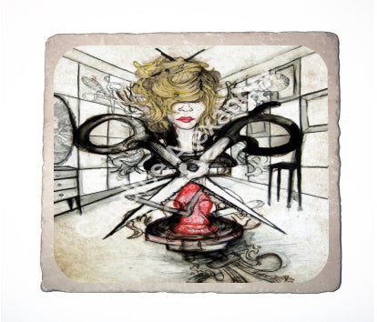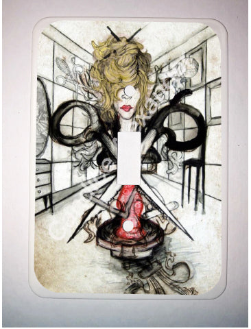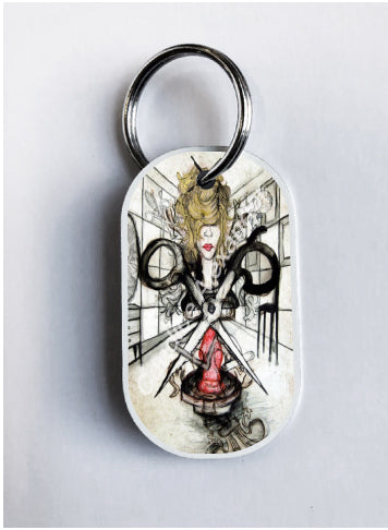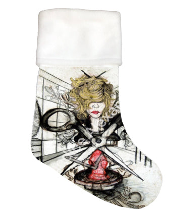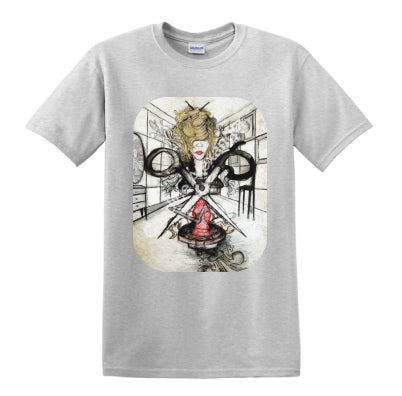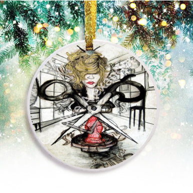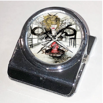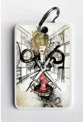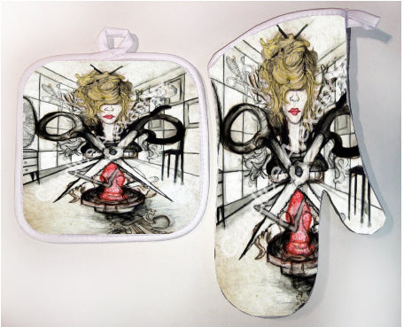"Salon Blonde" is a fleur de lis design by Candice Alexander that is intended to represent the cosmetology profession and does so with a salon background with a central fleur made from a barber chair, shears, and styling head with vibrant blonde hair.