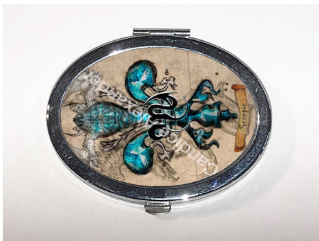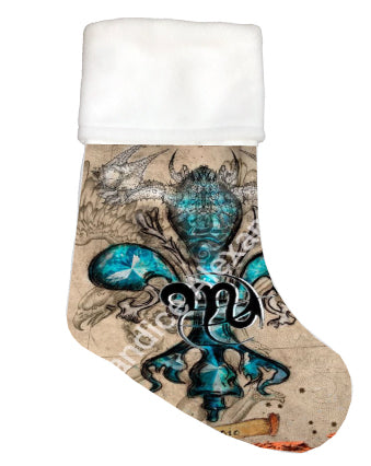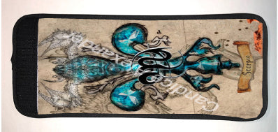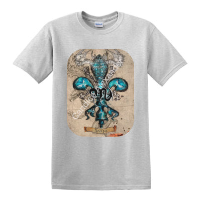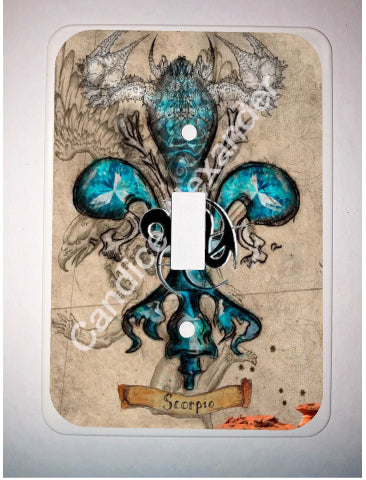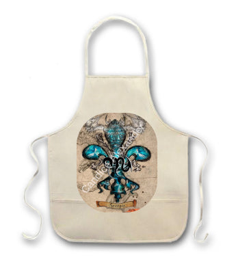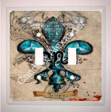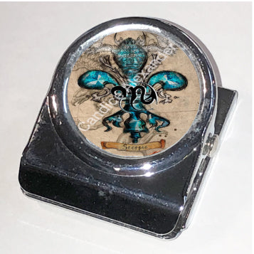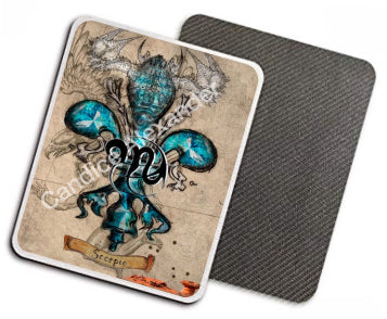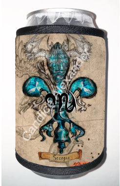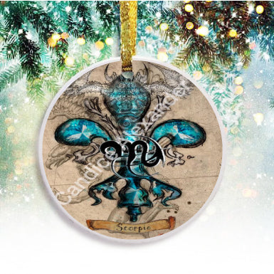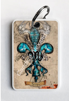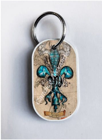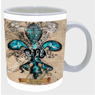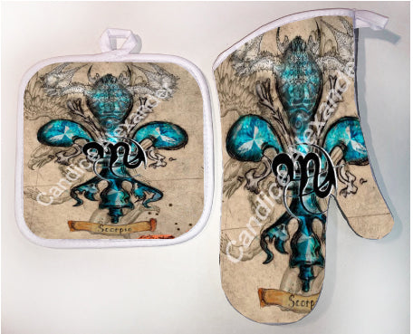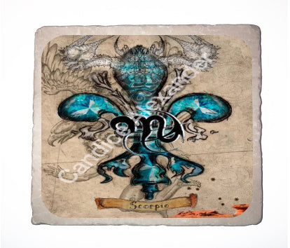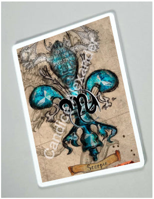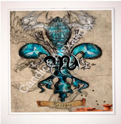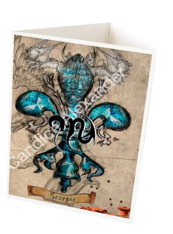 "Scorpio" is a fleur de lis design by Candice Alexander featuring a constellation studded background with a blue central fleur overlaid with the astrological symbol, created for people with birthdays from October 23-November 21.