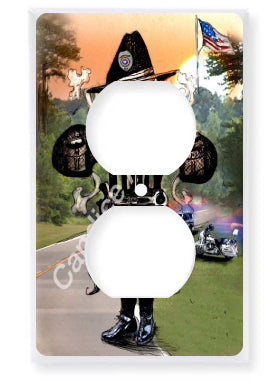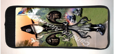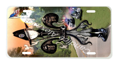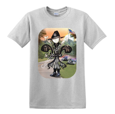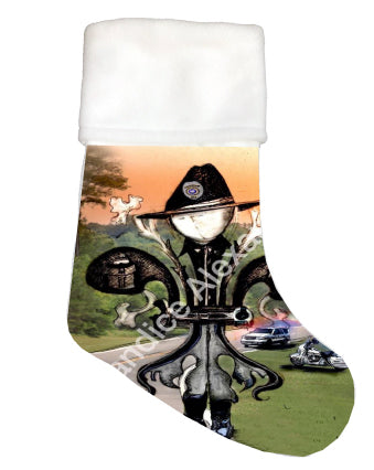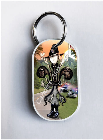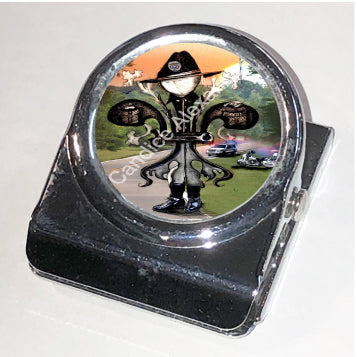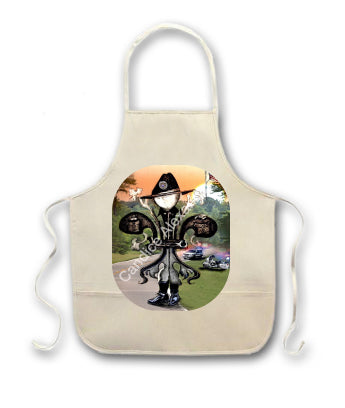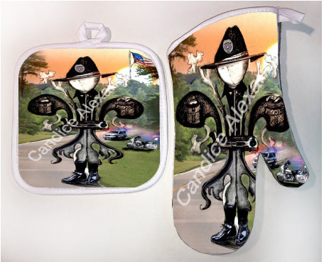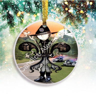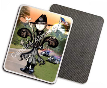 "Sheriff" is a fleur de lis design by Candice Alexander to honor law enforcement with a highway background complete with a cruiser and motorcycle and a central sheriff fleur complete with uniform and flag.