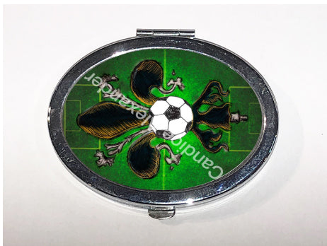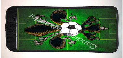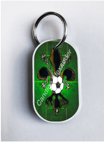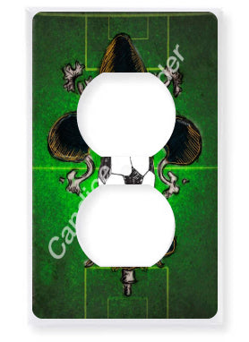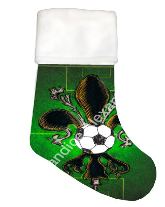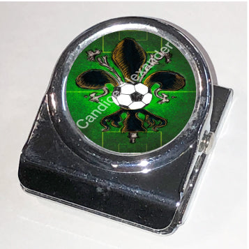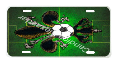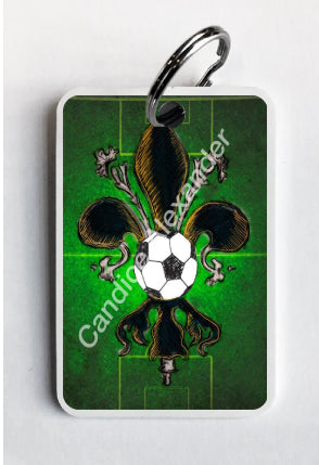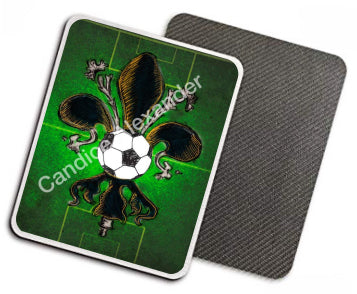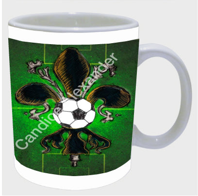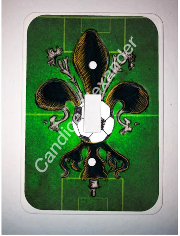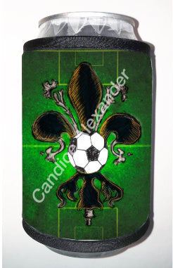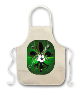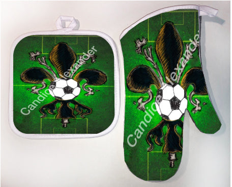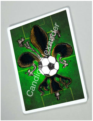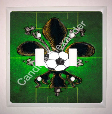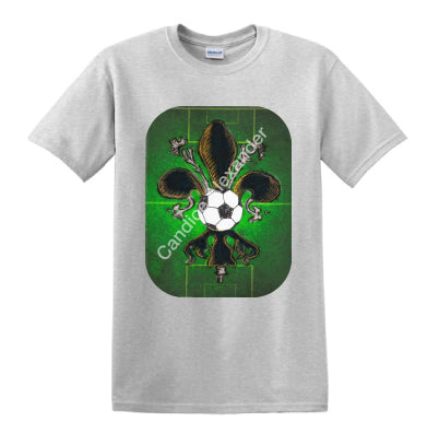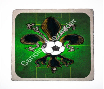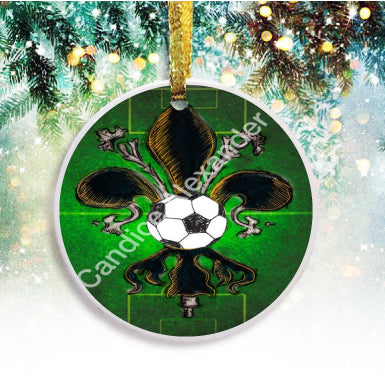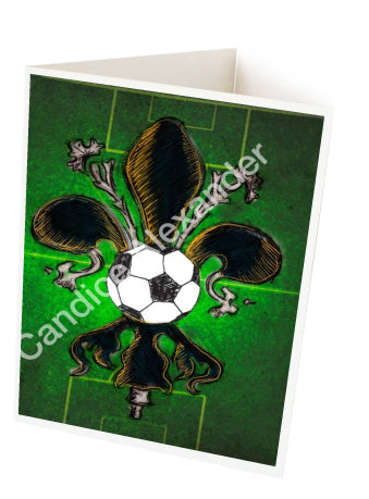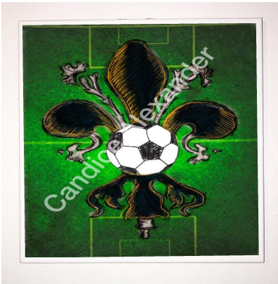 "Soccer Gold and Black" is a Gold and Black Fleur De Lis design by Candice Alexander featuring a soccer ball as the center of a black and gold fleur on a soccer field background.