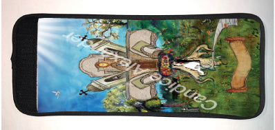"St. Martin DePorres Wedding" is a Fleur De Lis design by Candice Alexander representing the St. Martin DePorres Catholic Church and does so with a lovely landscape with a sister in the grass and a central fleur with architectural elements of the church building with a couples silhouette before the chapel doors.