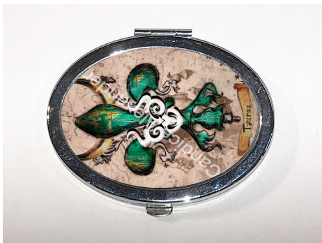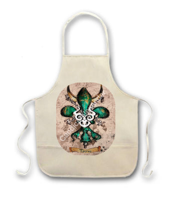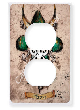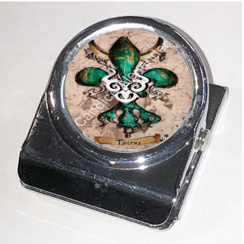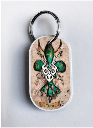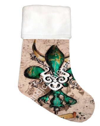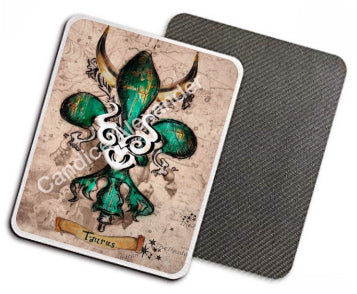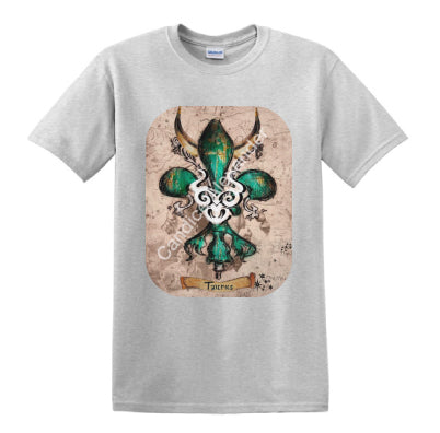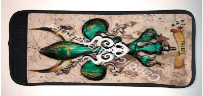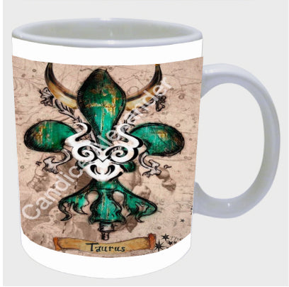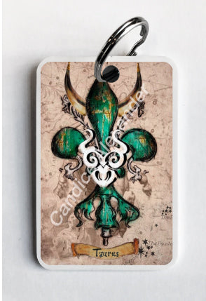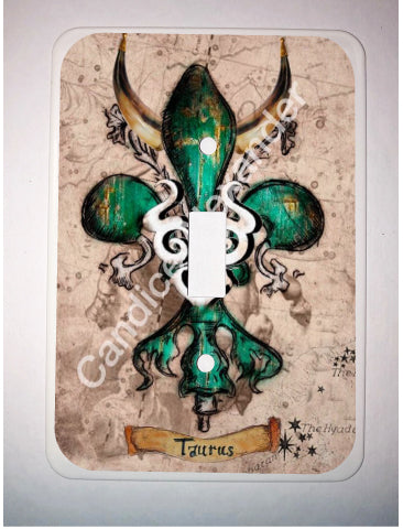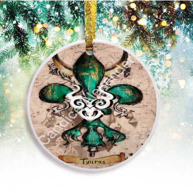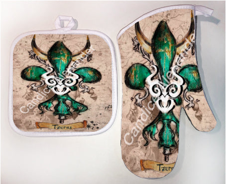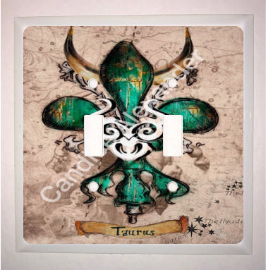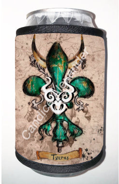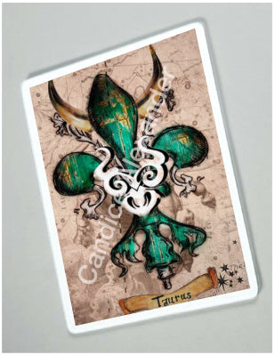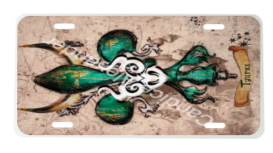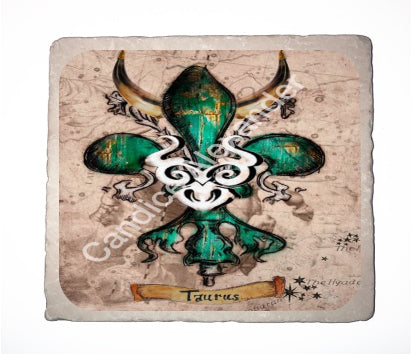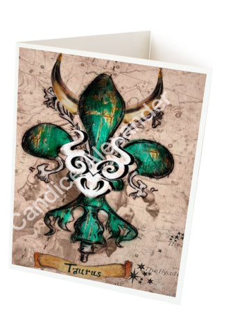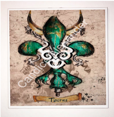 "Taurus" is a fleur de lis design by Candice Alexander that celebrates birthdays between April 20-May 20. This design features a neutral background dotted with the constellation associated with this astrological sign and a central fleur in an emerald green embellished with horns and symbols.