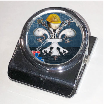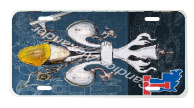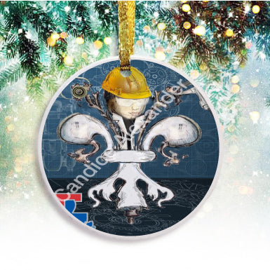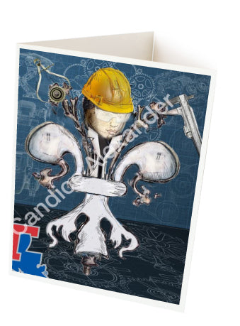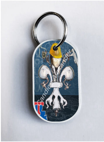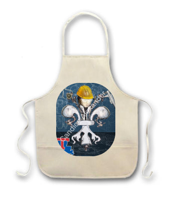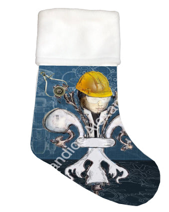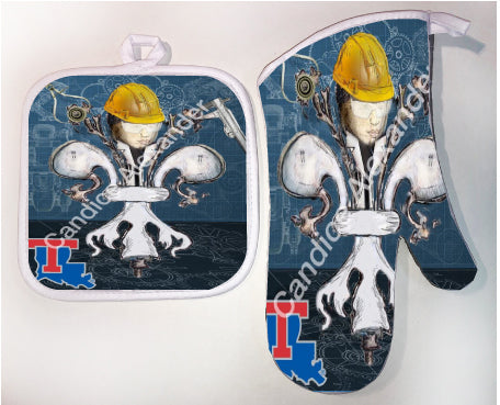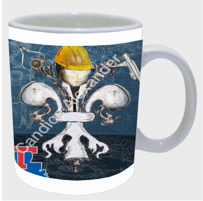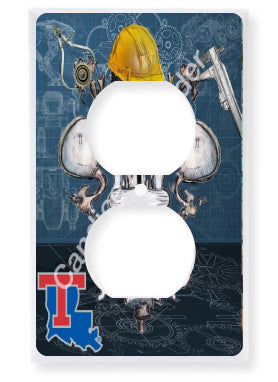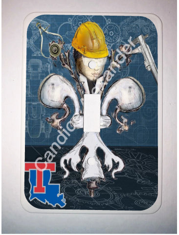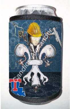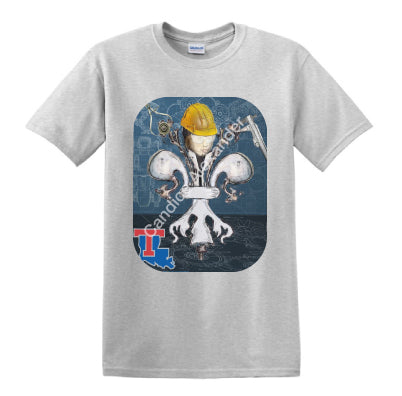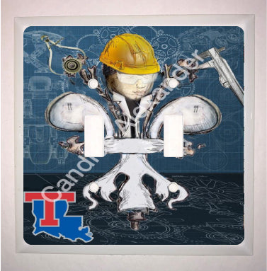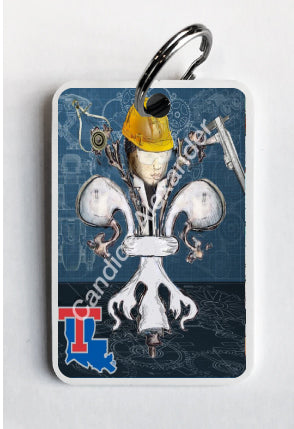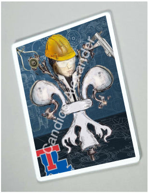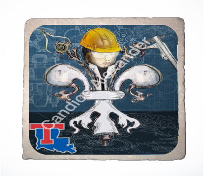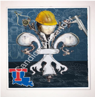 "Tech Mechanical Engineer" is a fleur de lis design by Candice Alexander featuring a blueprint background with floating fleur in white lab coat and hard hat with the LA Tech logo.